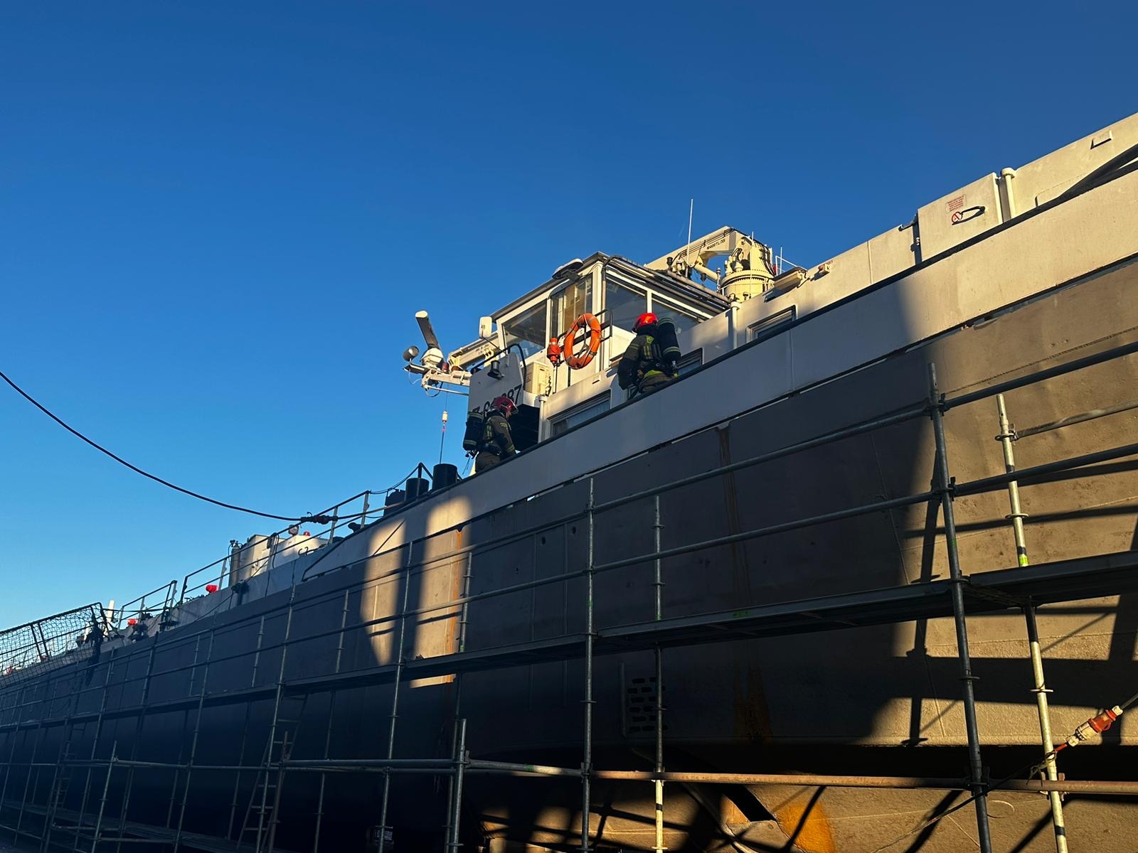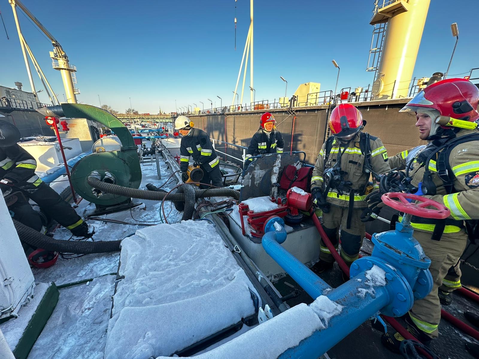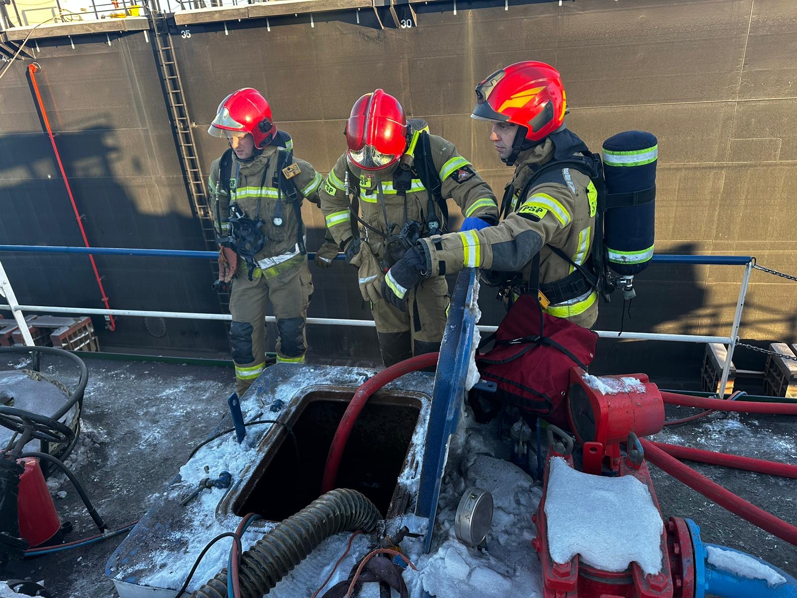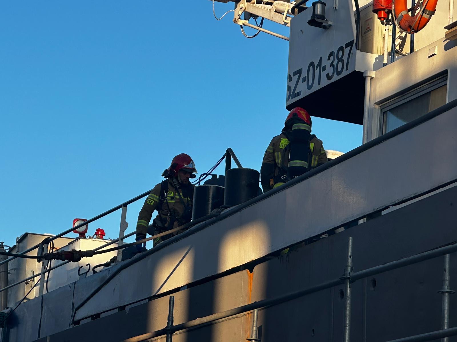 W dniu 08.01.2024r doszło do pożaru pyłów i substancji ropopochodnych w ładowni statku który stał w doku remontowym. Pożarem zajęła się asysta ppoż działająca na statku i nie doprowadziła do dalszego rozprzestrzenienia się pozaru. Działania zastępów polegały na zabezpieczeniu miejsca zdarzenia, podaniu prądu gaśniczego w celu schłodzenia konstukcji metalowych oraz oddymieniu pomieszczeń ładowni na statku. Po ugaszeniu i oddymieniu dokonano pomiarów na obecność gazów wybuchowych.