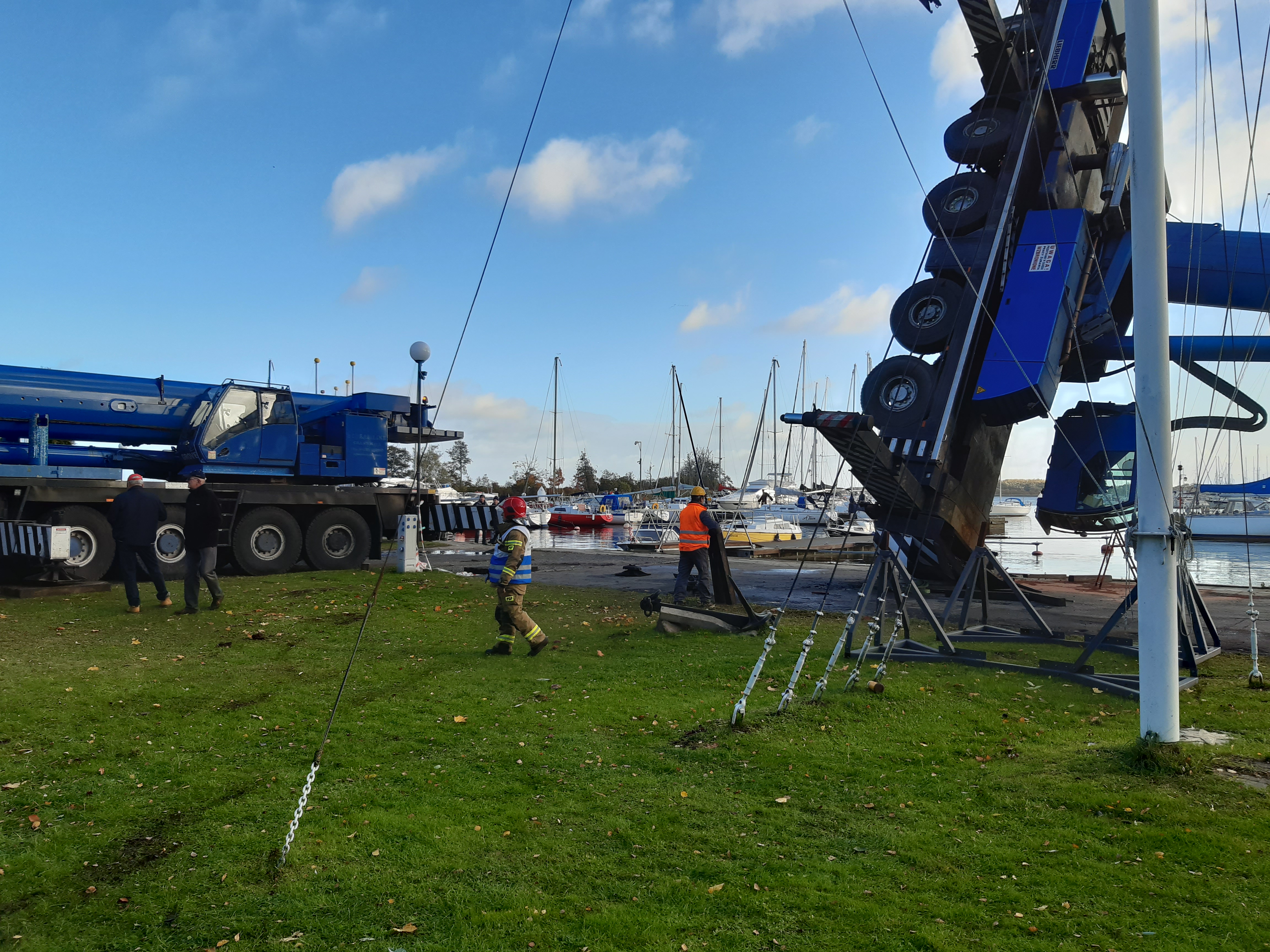 Przewrócony dźwig na Przystani Jachtowej