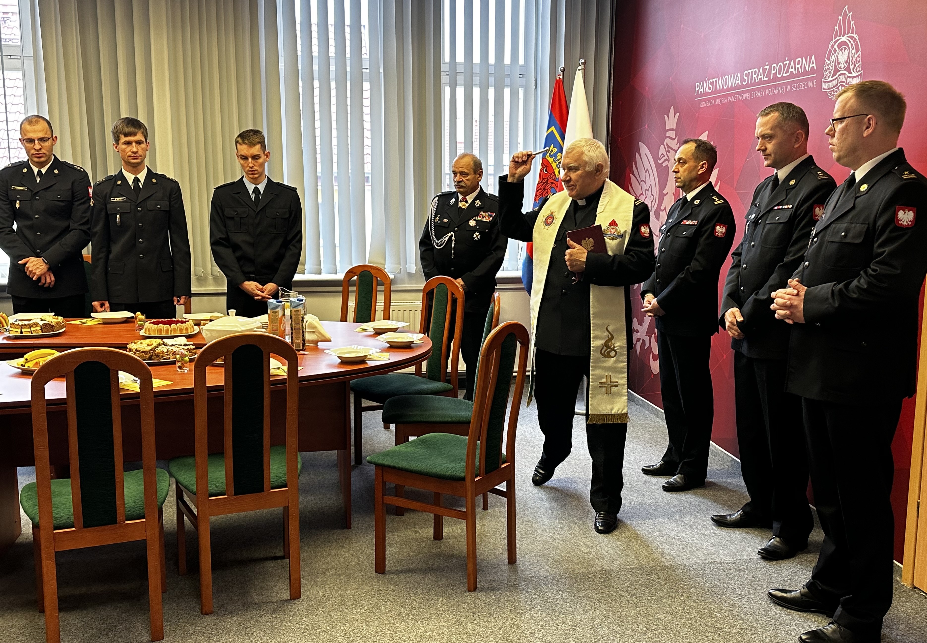 28 marca br. w Komendzie Miejskiej Państwowej Straży Pożarnej w Szczecinie odbyło się spotkanie wielkanocne p.o. Komendanta Miejskiego Państwowej Straży Pożarnej w Szczecinie bryg. Jacka Cyburta z funkcjonariuszami i pracownikami cywilnymi Komendy Miejskiej PSP w Szczecinie. Uroczystość swą obecnością zaszczycił Zachodniopomorski Komendant Wojewódzki PSP st. bryg. Mirosław Pender oraz kapelan zachodniopomorskich strażaków ks. bryg. Ryszard Szczygieł, który pobłogosławił i odprawił modlitwę. Komendant złożył najserdeczniejsze życzenia zdrowych, spokojnych, radosnych świąt spędzonych w rodzinnej atmosferze, po czym wszyscy podzielili się symbolicznie jajkiem.