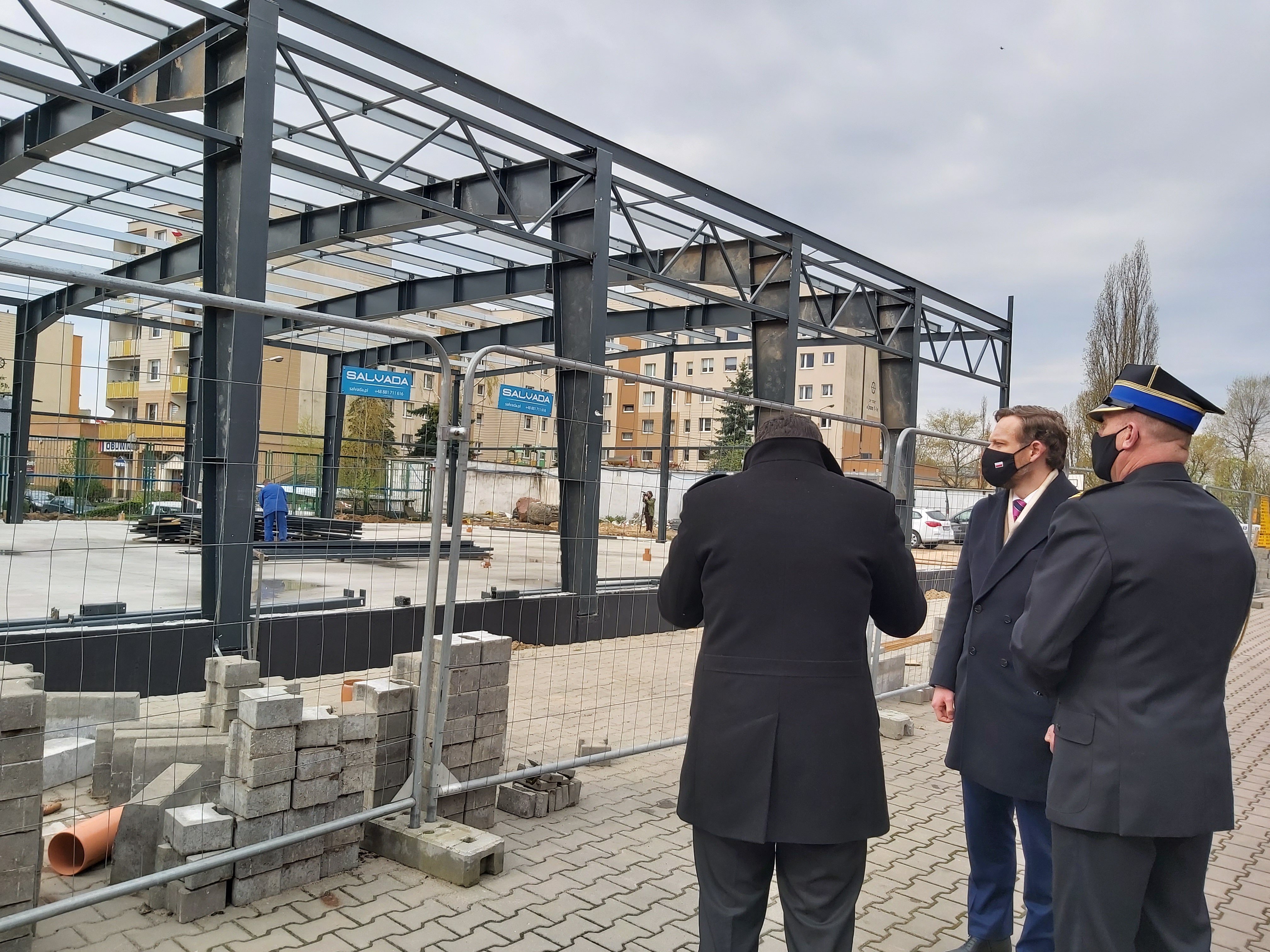 Po uroczystej zbiórce Wojewoda Zachodniopomorski, Wicewojewoda Zachodniopomorski oraz Zachodniopomorski Komendant Wojewódzki PSP wizytowali budowę pomocniczej hali magazynowo garażowej.