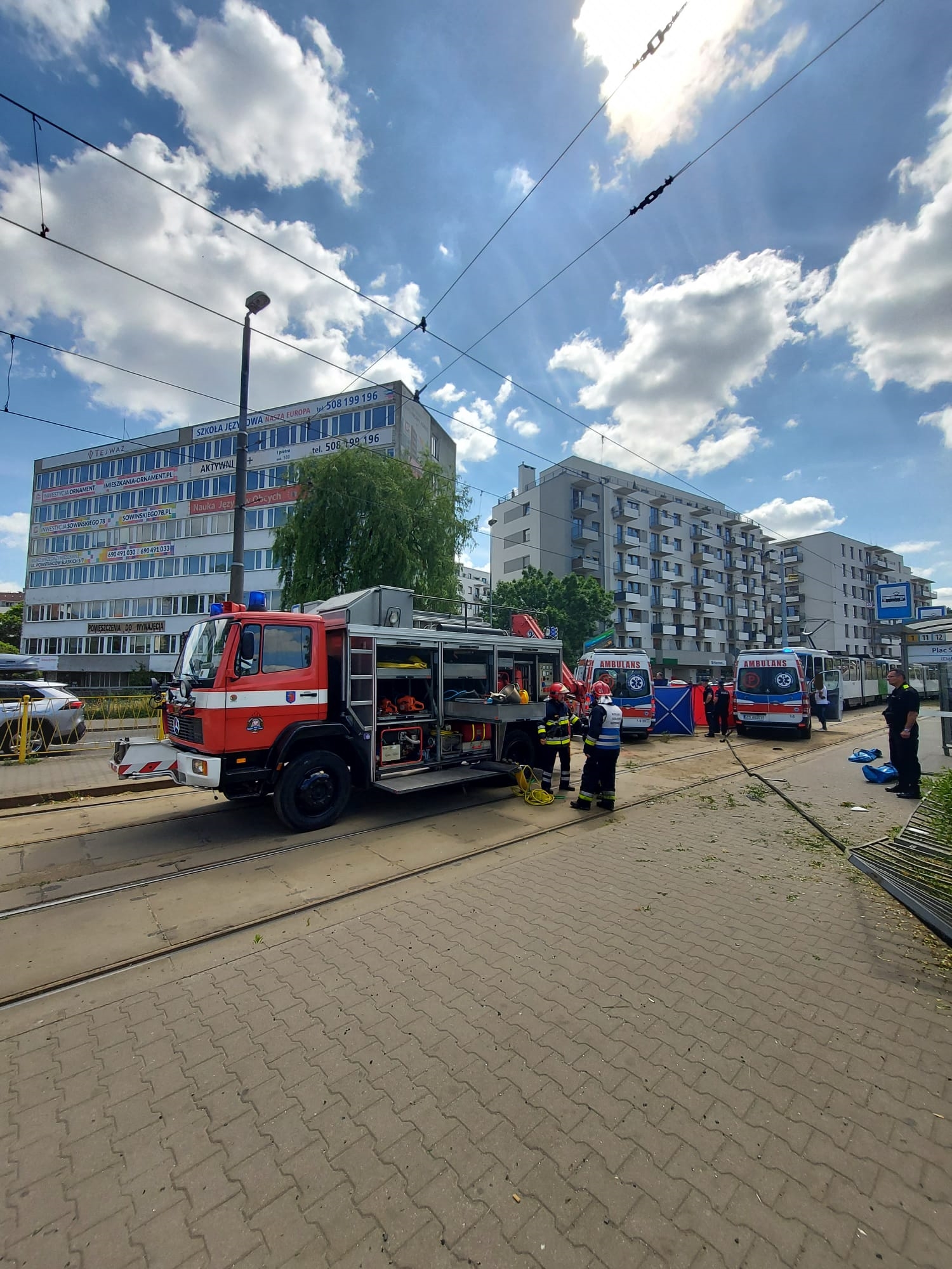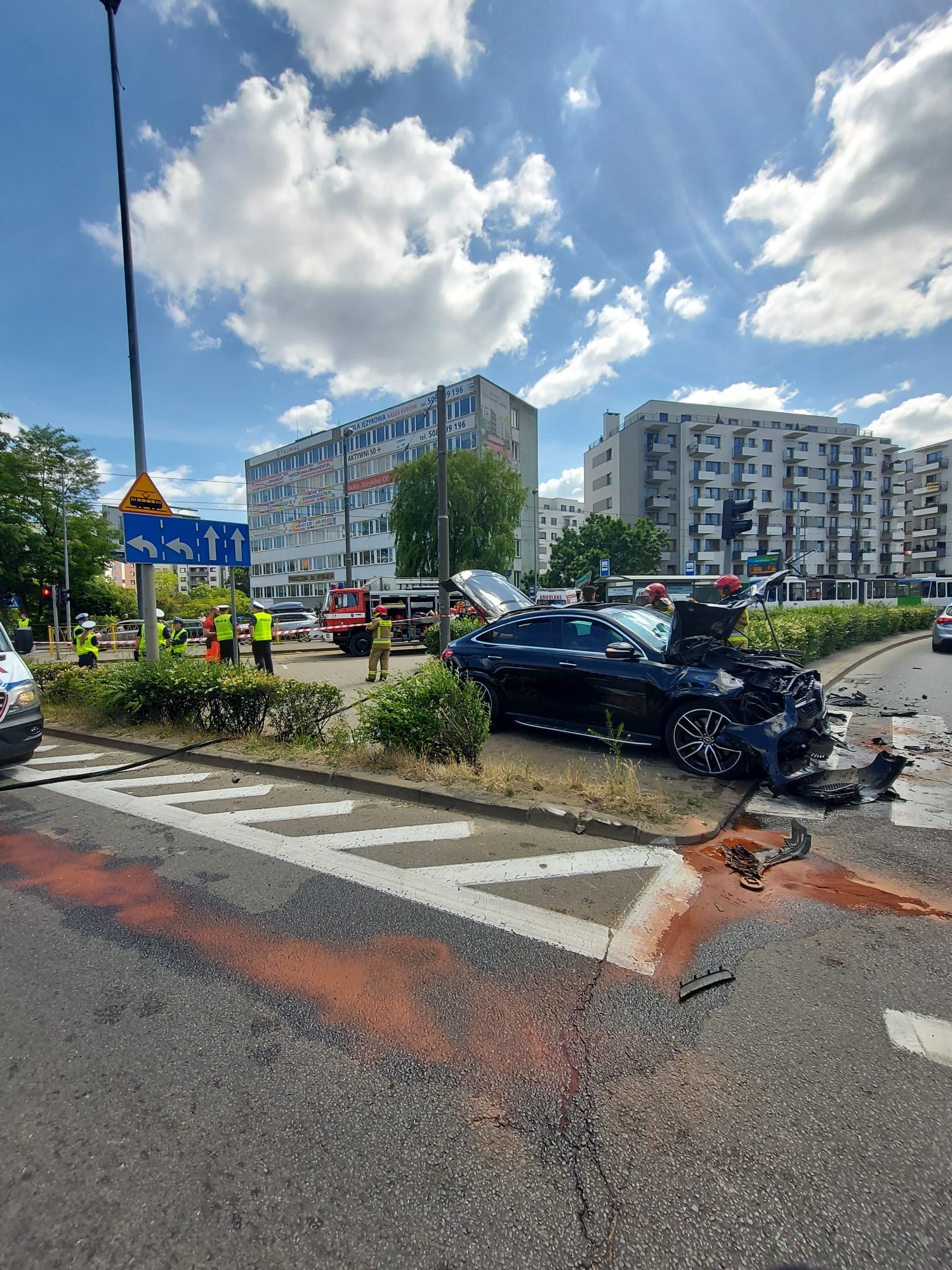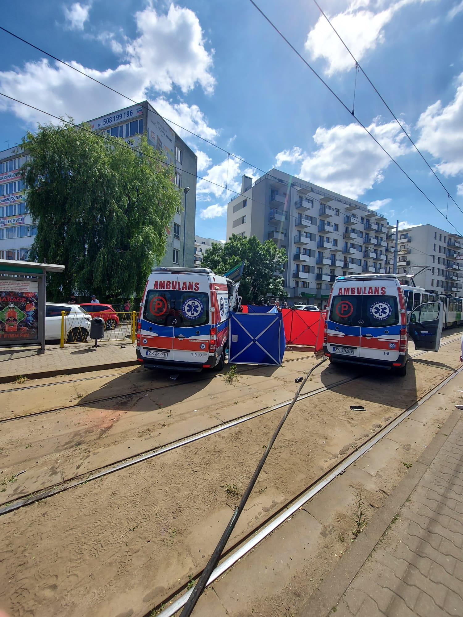 Po przybyciu na miejsce zdarzenia stwierdzono wypadek dwóch aut (samochodu osobowego i karetki pogotowia). W wyniku zderzenia karetka wypadła z jezdni i zatrzymała się na przystanku tramwajowym, potrącając przy tym stojącą na przystanku kobietę.