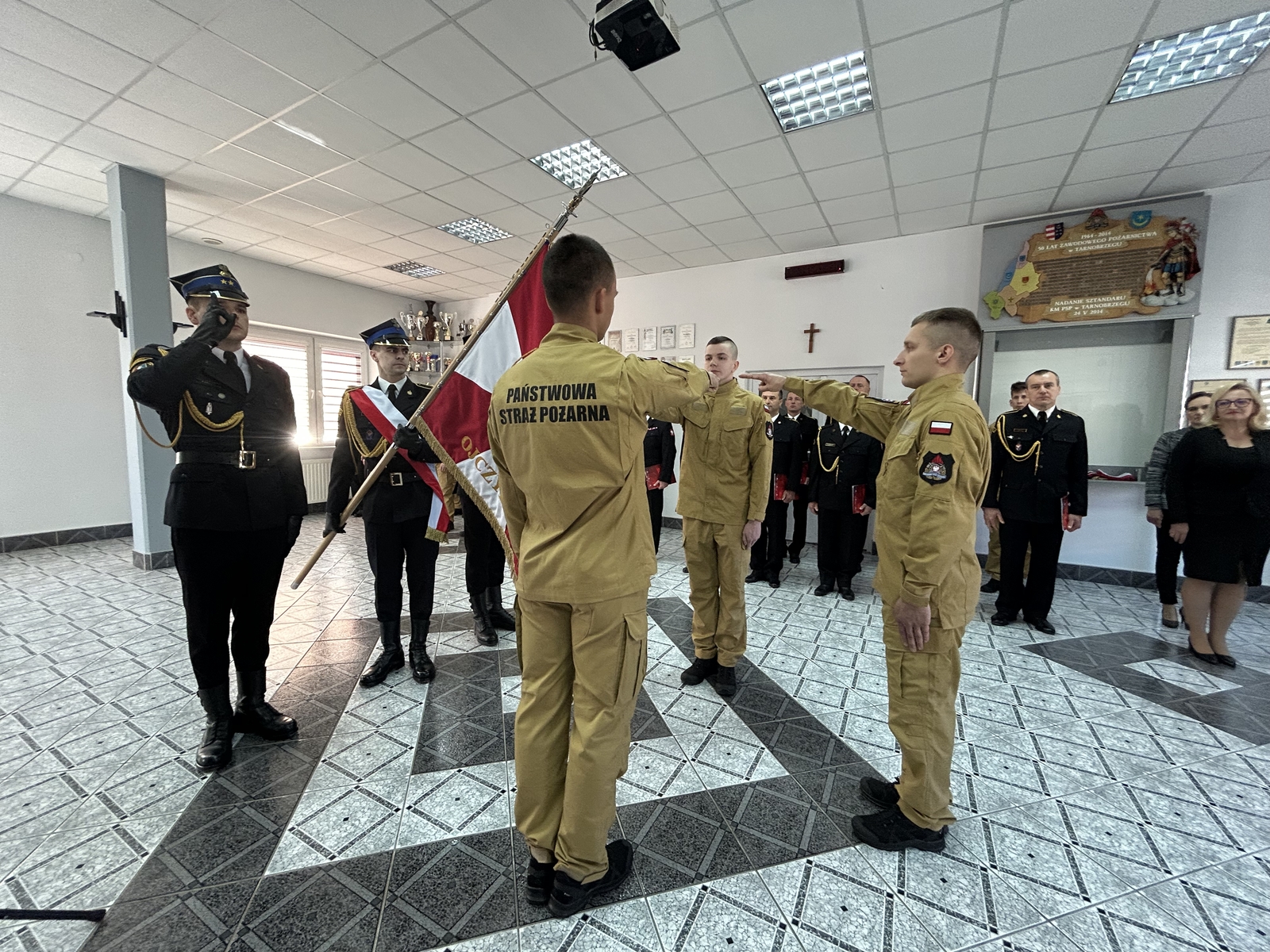 Podczas zbiórki ślubowanie złożyli strażacy, którzy wstąpili w szeregi PSP, zobowiązując się do sumiennego wykonywania obowiązków oraz służby Ojczyźnie. Jest to wyjątkowy moment w życiu każdego funkcjonariusza, symbolizujący początek drogi zawodowej w Państwowej Straży Pożarnej. Ślubowanie na sztandar złożyli: