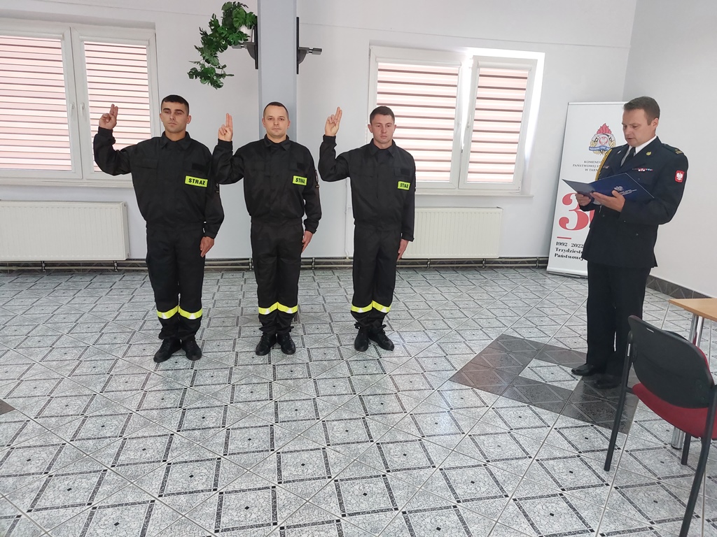 23 czerwca w Komendzie Miejskiej Państwowej Straży Pożarnej w Tarnobrzegu Szymon Barszczak, Mateusz Piechota i Arkadiusz Urbaniak w obecności komendanta miejskiego PSP w Tarnobrzegu bryg. Mariana Roga oraz strażaków komendy złożyli uroczyste ślubowanie strażaka. Po wypowiedzeniu słów roty ślubowania nastąpiło podpisanie aktów ślubowania.