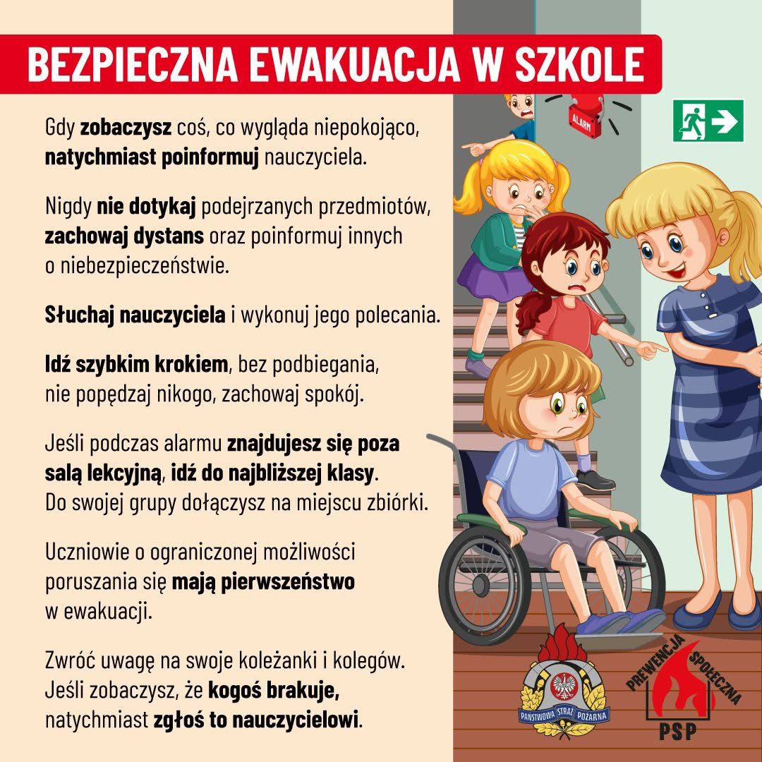 Grafika przedstawia dzieci w trakcie ewakuacji. Po lewej pole tekstowe opisujące zasady bezpiecznej ewakuacji.
