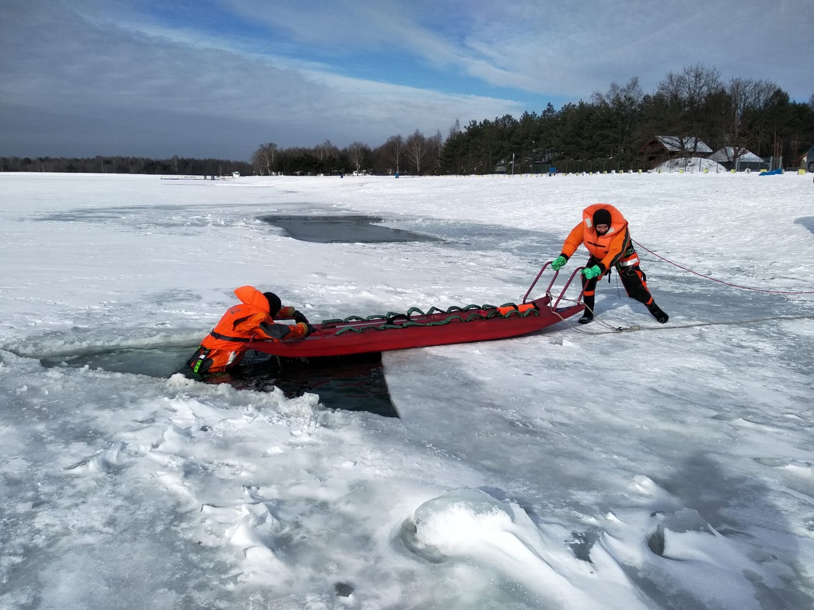 i umiejętności oraz doskonalenie technik ratowniczych związanych z ewakuacją i udzielaniem pomocy poszkodowanym, pod którymi załamała się pokrywa lodowa. W szkoleniu udział wzięło 10 strażaków.