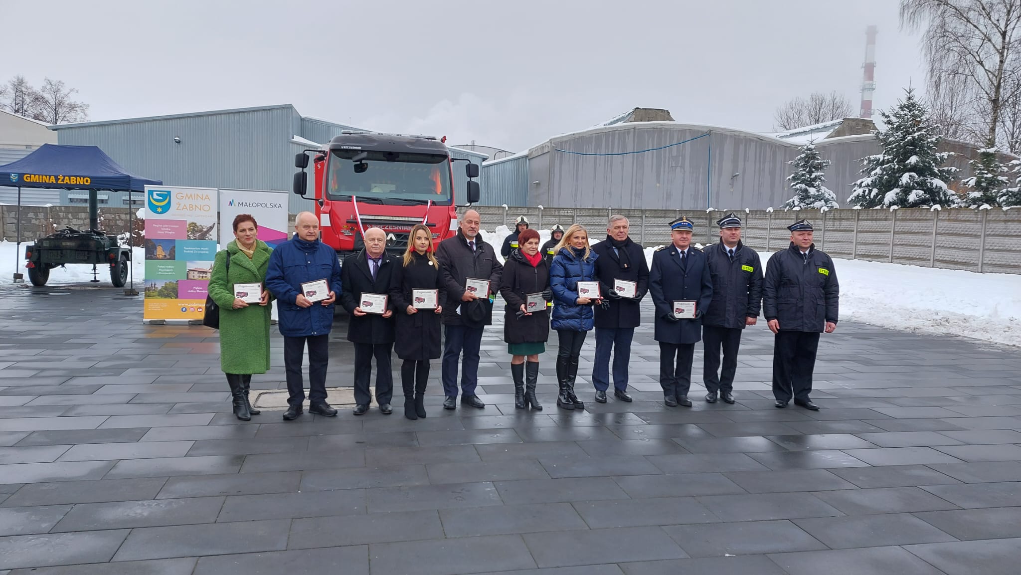 Uroczyste przekazanie pojazdu odbyło się w dniu 16.12.2022 r., którego to przekazania dokonali: Poseł na Sejm RP Anna Pieczarka, Starosta Tarnowski Roman Łucarz, Prezes Zarządu Wojewódzkiego Funduszu Ochrony Środowiska i Gospodarki Wodnej w Krakowie Kazimierz Koprowski, Komendant Miejski Państwowej Straży Pożarnej w Tarnowie st. bryg. Krzysztof Gładysz, Burmistrz Miasta i Gminy Żabno Marta Herduś oraz dh Łukasz Łach Prezes Zarządu Oddziału Powiatowego Związku OSP RP w Tarnowie.