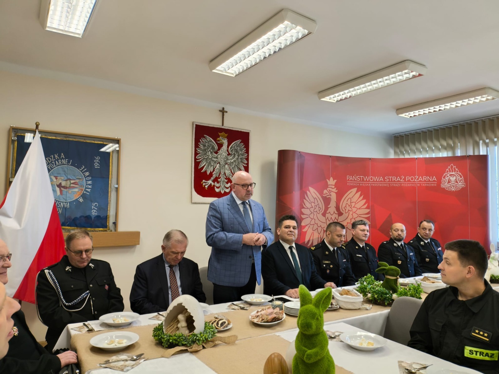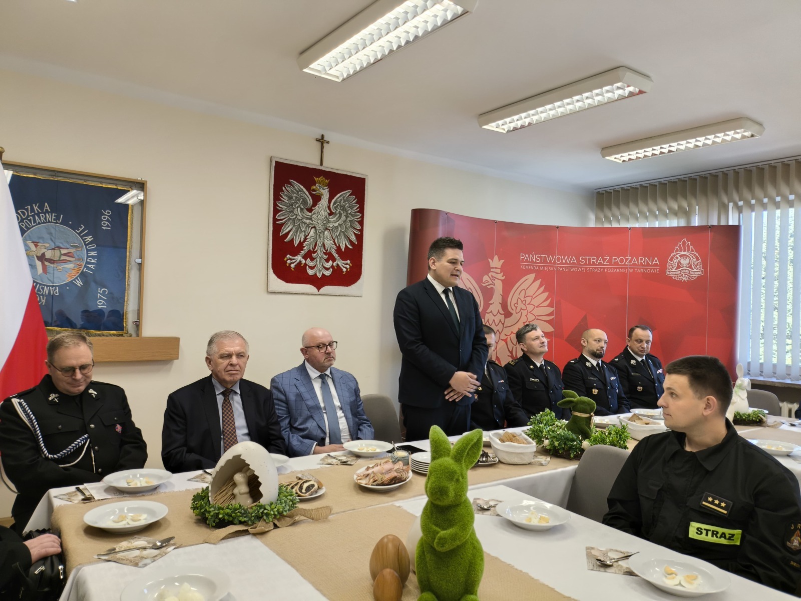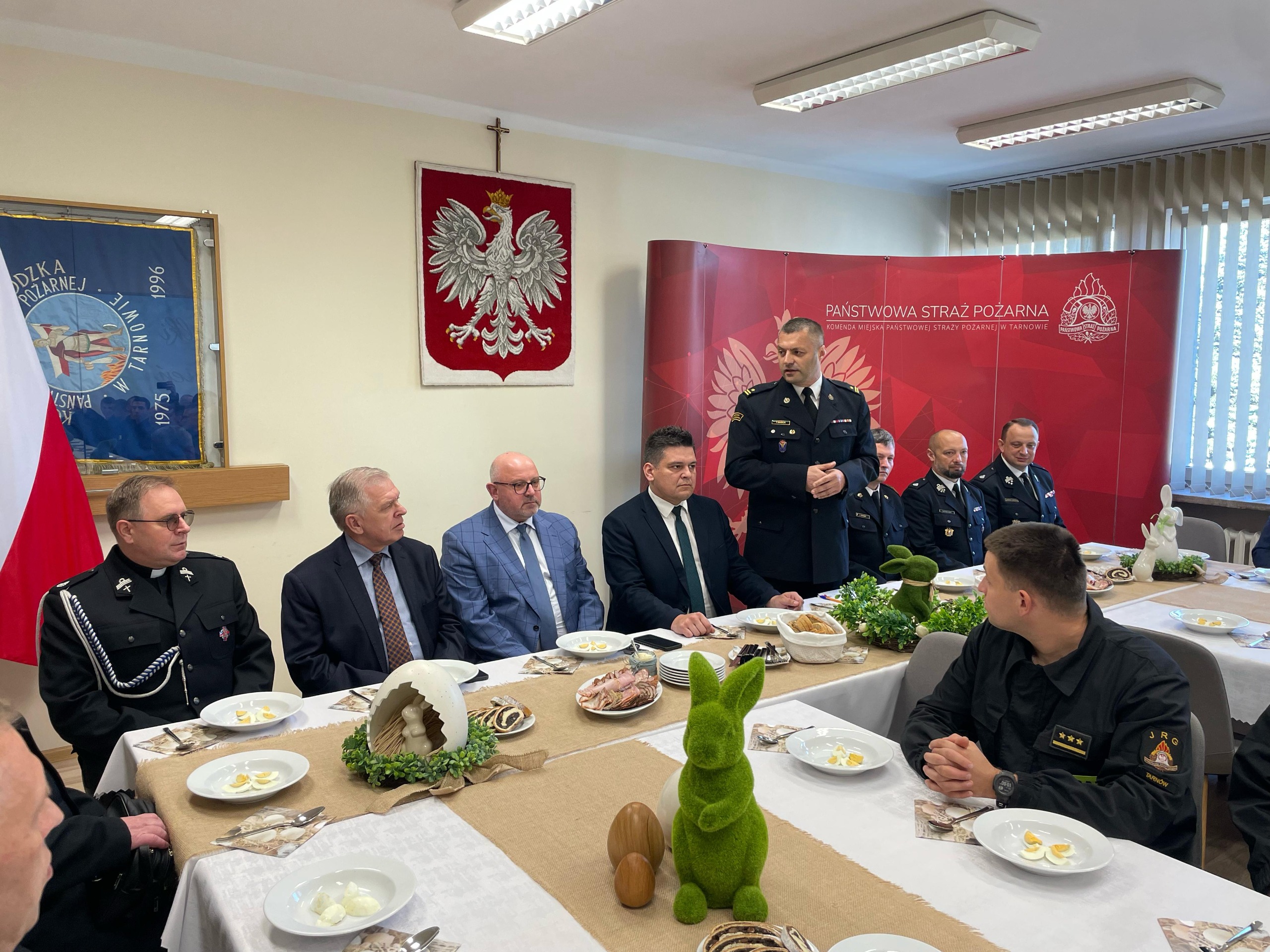 W dniu 16 kwietnia w Komendzie Miejskiej Państwowej Straży Pożarnej w Tarnowie odbyło się uroczyste spotkanie wielkanocne. W wydarzeniu udział wzięli funkcjonariusze i pracownicy cywilni komendy, a także zaproszeni goście – przedstawiciele władz samorządowych, służb mundurowych, duchowieństwa oraz emerytowani pracownicy. Spotkanie zaszczycili swoją obecnością: