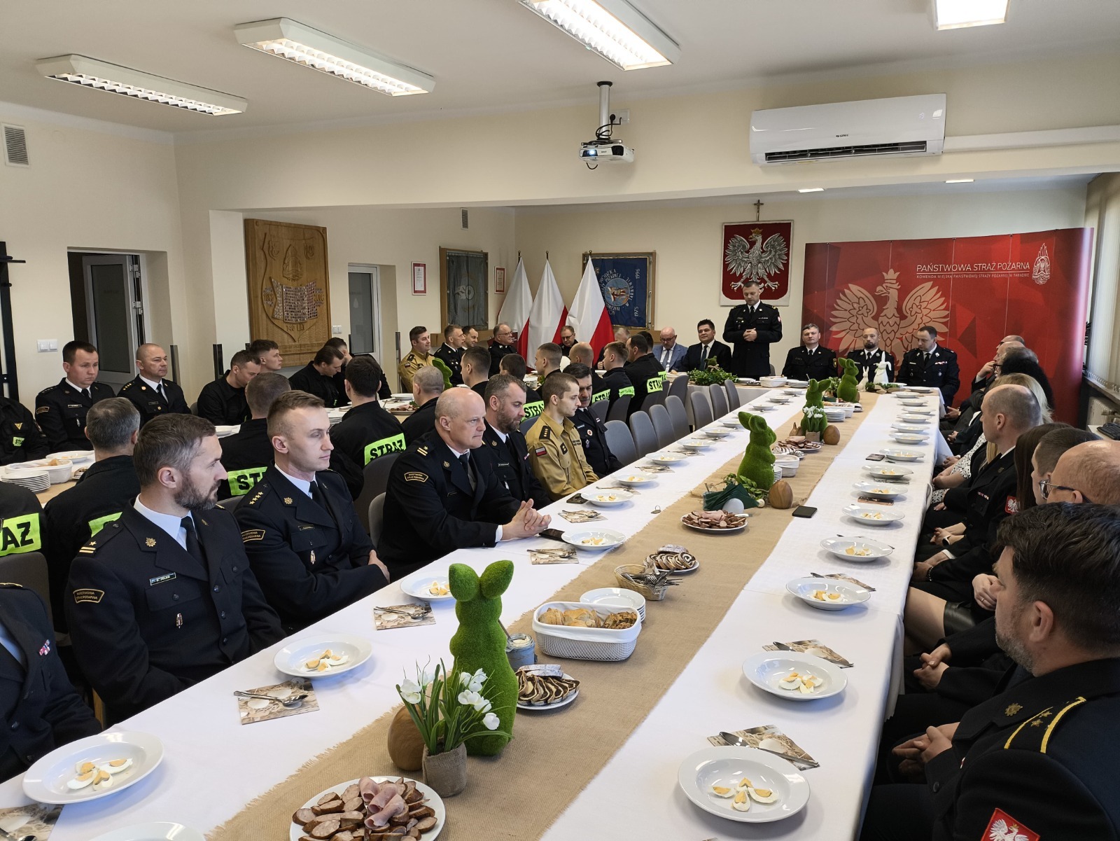 Spotkanie rozpoczął Z-ca Komendanta Miejskiego PSP mł. bryg. Tomasz Bańdur, składając wszystkim obecnym życzenia zdrowych, spokojnych i rodzinnych Świąt Wielkanocnych. Podkreślił też znaczenie tradycji, jedności i wzajemnego wsparcia – zarówno w codziennej służbie, jak i w życiu prywatnym. Zaproszeni goście przyłączyli się do życzeń wszelkiej pomyślności dla uczestników spotkania oraz ich najbliższych.