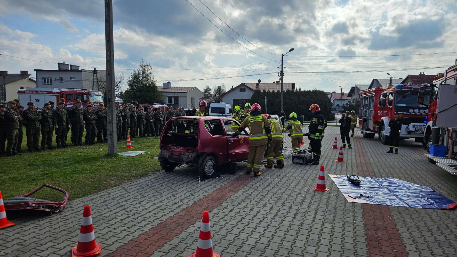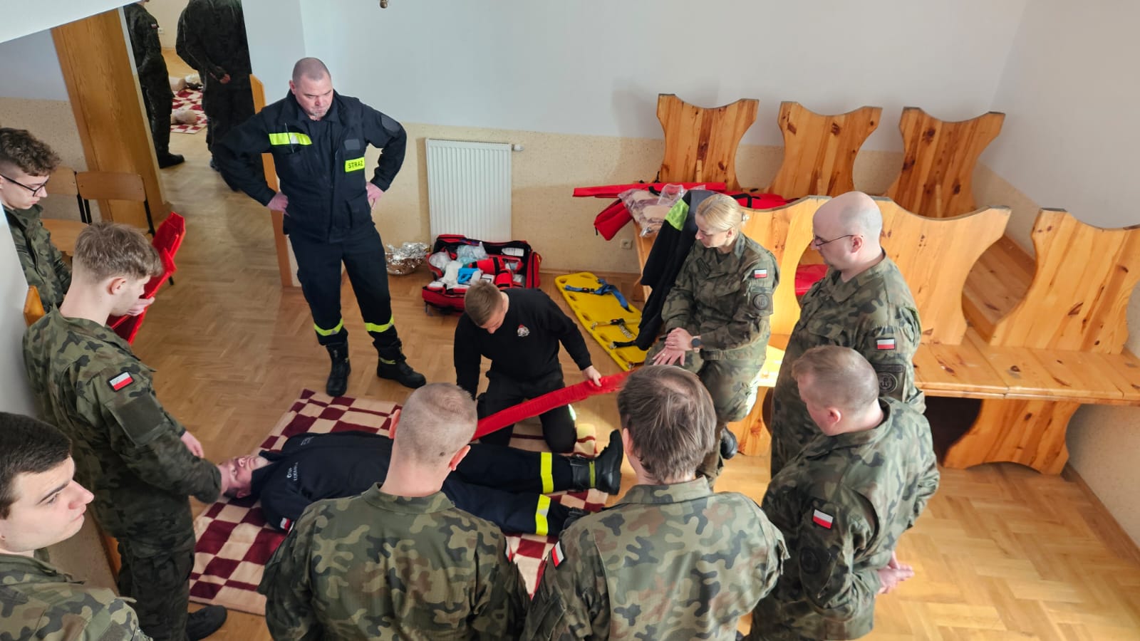 i zasad prowadzenia działań ratowniczo-gaśniczych oraz użycia podstawowego sprzętu ratowniczego, znajdującego się na wyposażeniu średniego pojazdu ratowniczo-gaśniczego. Ponadto zaprezentowano metody prowadzenia działań podczas wypadków w komunikacji drogowej, w tym sposoby ewakuacji osób poszkodowanych z pojazdów. Przedstawiono również sposoby udzielania kwalifikowanej pierwszej pomocy osobom dorosłym oraz dzieciom przy użyciu dostępnego sprzętu, znajdującego się na wyposażeniu zestawu ratowniczego PSP R1. Teren ćwiczeń podzielony był na 4 stanowiska, na których po części teoretycznej wykonywano poszczególne założenia w formie ćwiczeń.