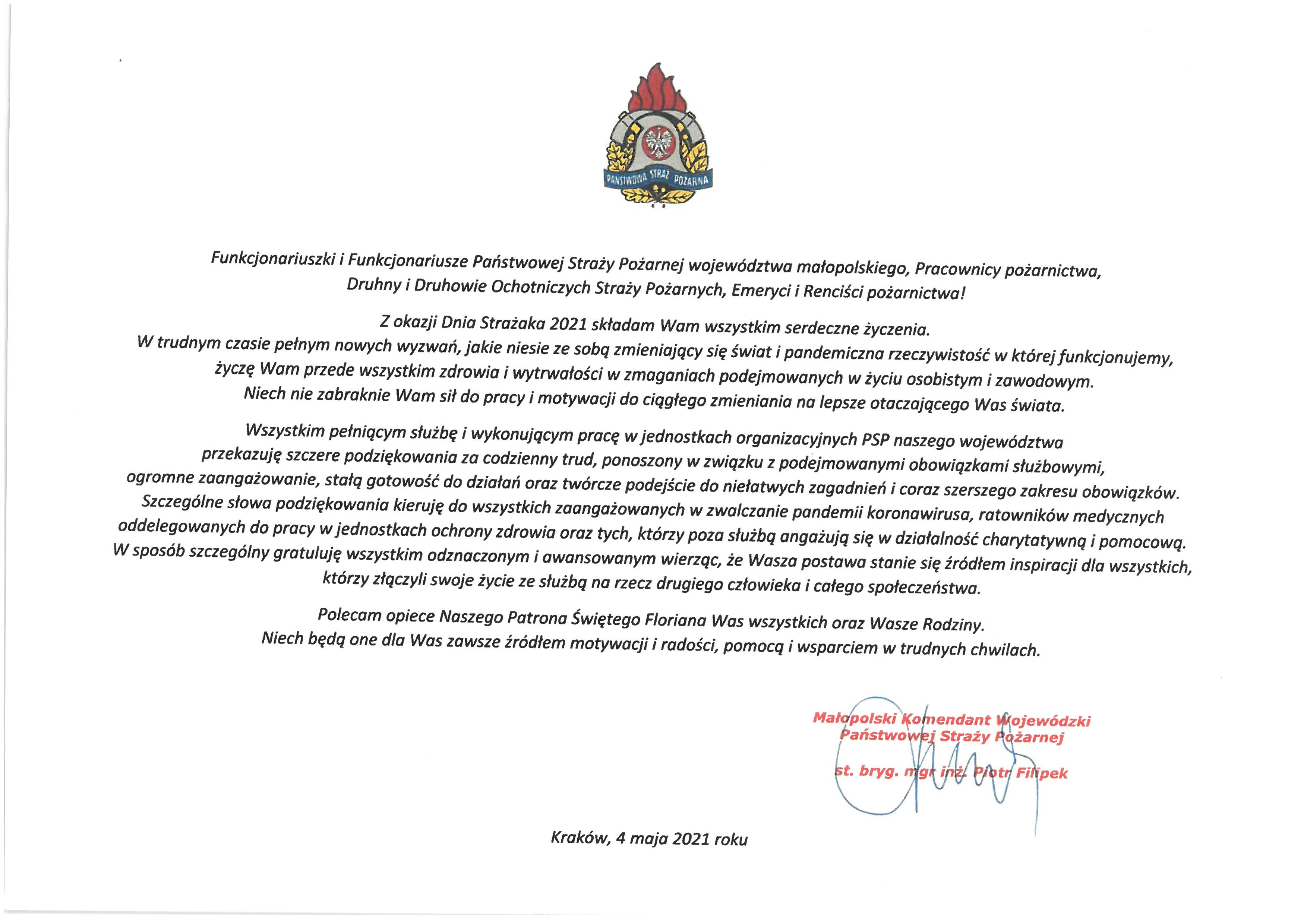 Życzenia Małopolskiego Komendanta Wojewódzkiego Państwowej Straży Pożarnej z okazji Dnia Strażaka 04.05.2021 Życzenia Małopolskiego Komendanta Wojewódzkiego Państwowej Straży Pożarnej z okazji Dnia Strażaka Zdjęcia (1) Pokaż zdjęcie 1 z galerii.