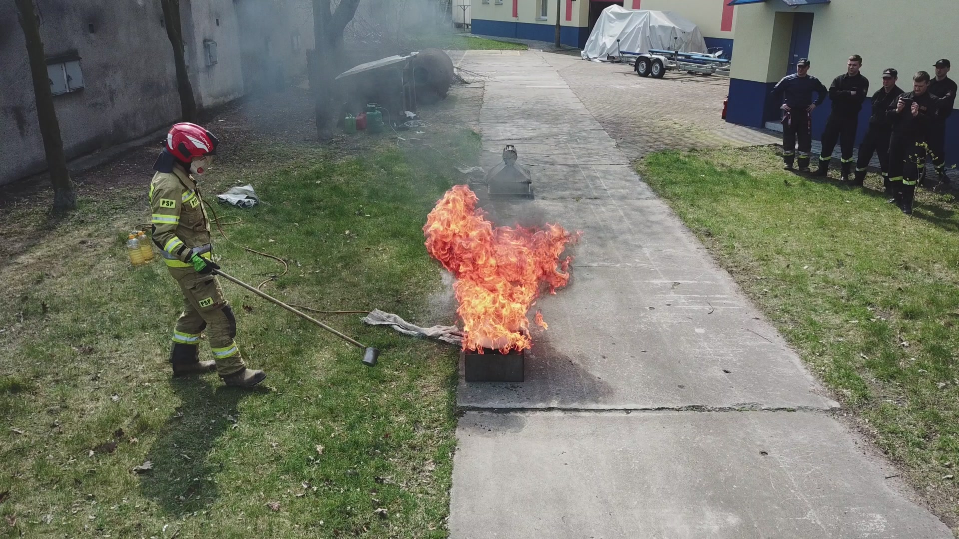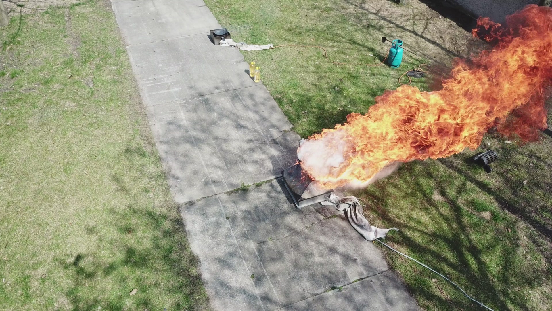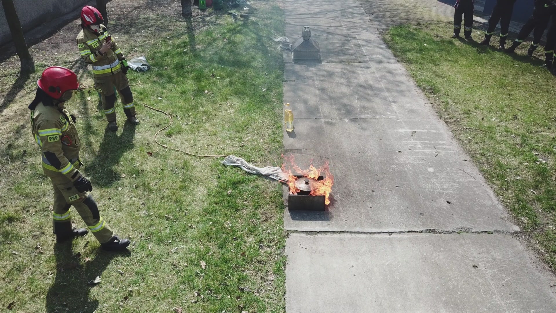 Doprowadzenie do samozapłonu oleju spożywczego na patelni, a następnie wskazanie właściwych metod gaszenia, tj. poprzez przykrycie przykrywką czy użycie gaśnicy pianowej, a także wykazanie różnicy w skuteczności gaszenia pożaru grupy F (oleje i tłuszcze w urządzeniach kuchennych) gaśnicą pianową (przeznaczoną do gaszenia pożarów grupy F) i proszkową (nie przeznaczoną do gaszenia pożarów grupy F).