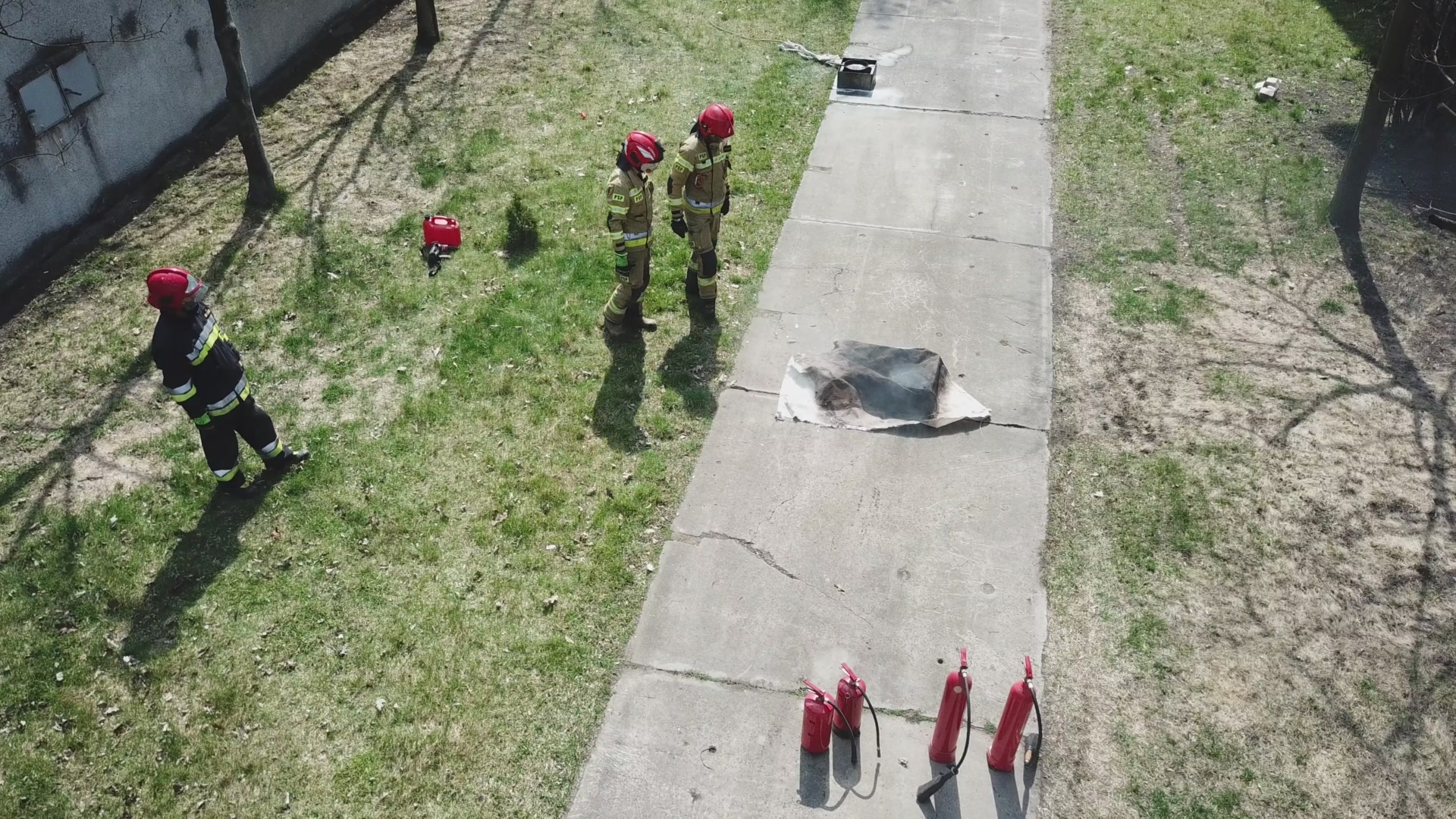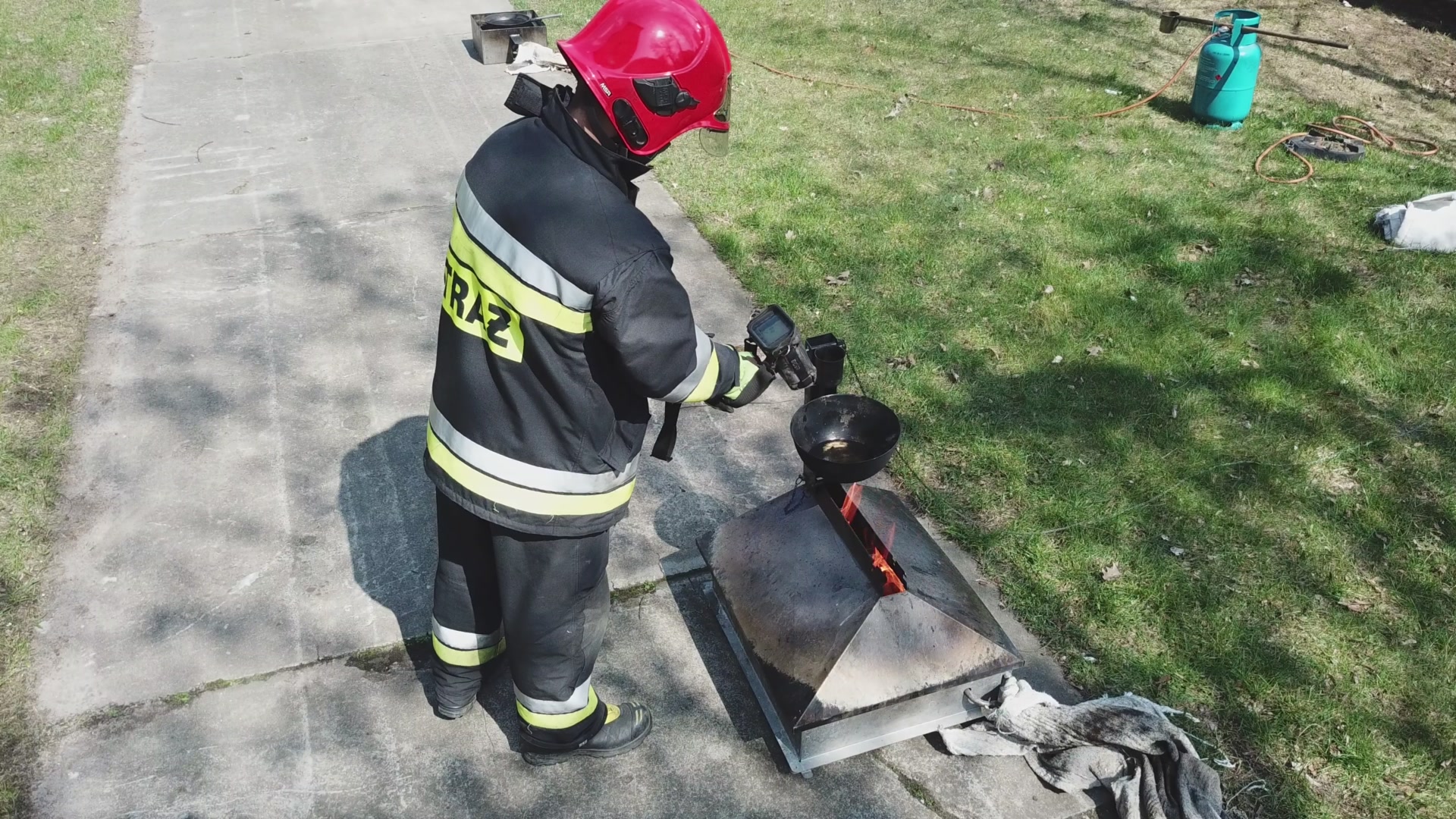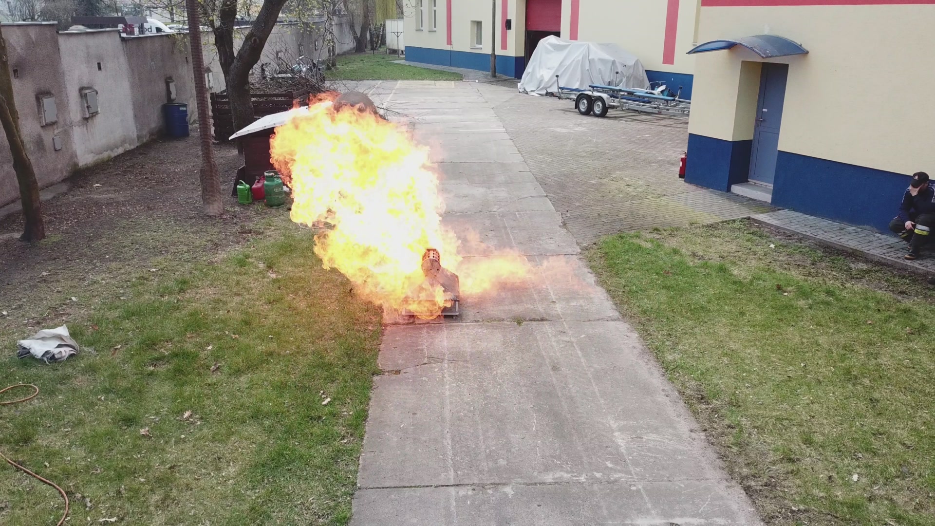 Doprowadzenie do samozapłonu oleju spożywczego na patelni, a następnie wskazanie właściwych metod gaszenia, tj. poprzez przykrycie przykrywką czy użycie gaśnicy pianowej, a także wykazanie różnicy w skuteczności gaszenia pożaru grupy F (oleje i tłuszcze w urządzeniach kuchennych) gaśnicą pianową (przeznaczoną do gaszenia pożarów grupy F) i proszkową (nie przeznaczoną do gaszenia pożarów grupy F).