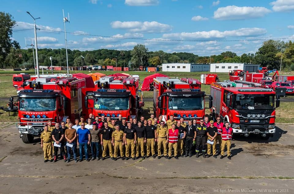 Toruńscy strażacy: bryg. Robert Stegnicki, asp. Szymon Radke, st. ogn. Przemysław Kurkowski, st. ogn. Dariusz Popławski, ogn. Cezary Kurkowski, mł. ogn. Arkadiusz Bojarski, sekc. Łukasz Izydorski, którzy są członkami HCP "TORUŃ" Poland (moduł pomp wysokiej wydajności) z woj. kujawsko-pomorskiego wzięli udział w międzynarodowych ćwiczeniach ratowniczych „New Wave 2023”.