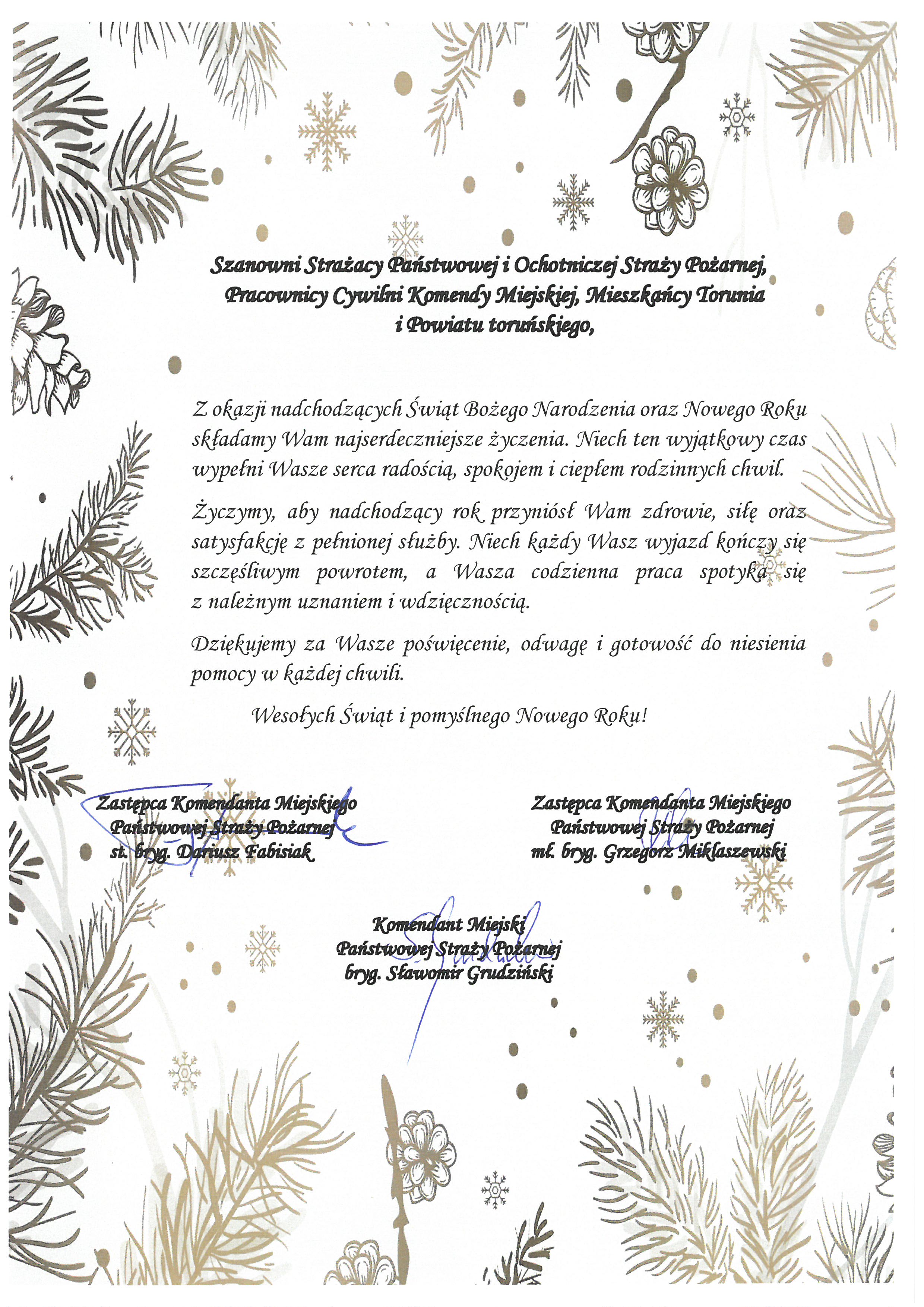 Życzymy, aby nadchodzący rok przyniósł Wam zdrowie, siłę oraz satysfakcję z pełnionej służby. Niech każdy Wasz wyjazd kończy się szczęśliwym powrotem, a Wasza codzienna praca spotyka się z należnym uznaniem i wdzięcznością.