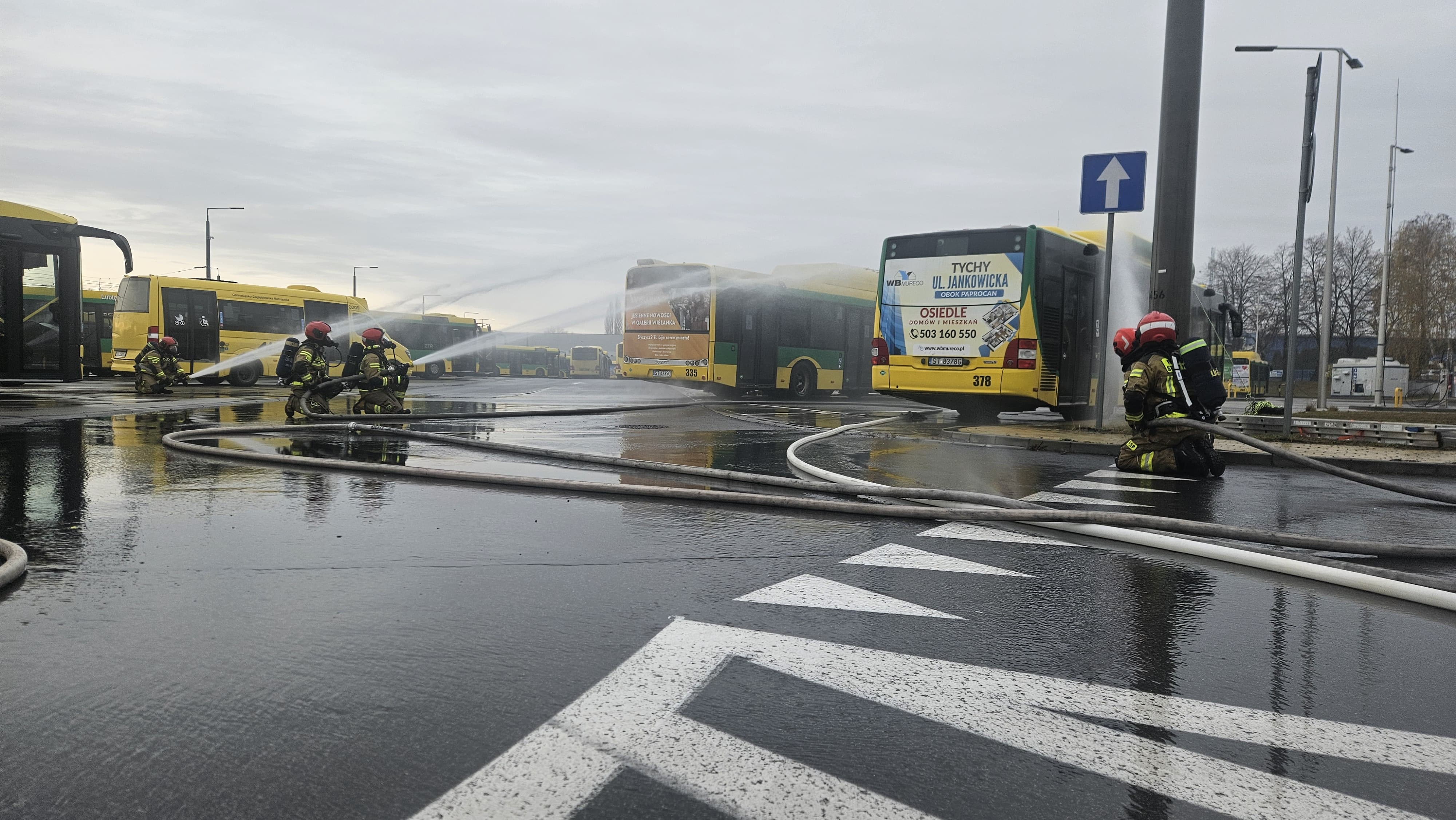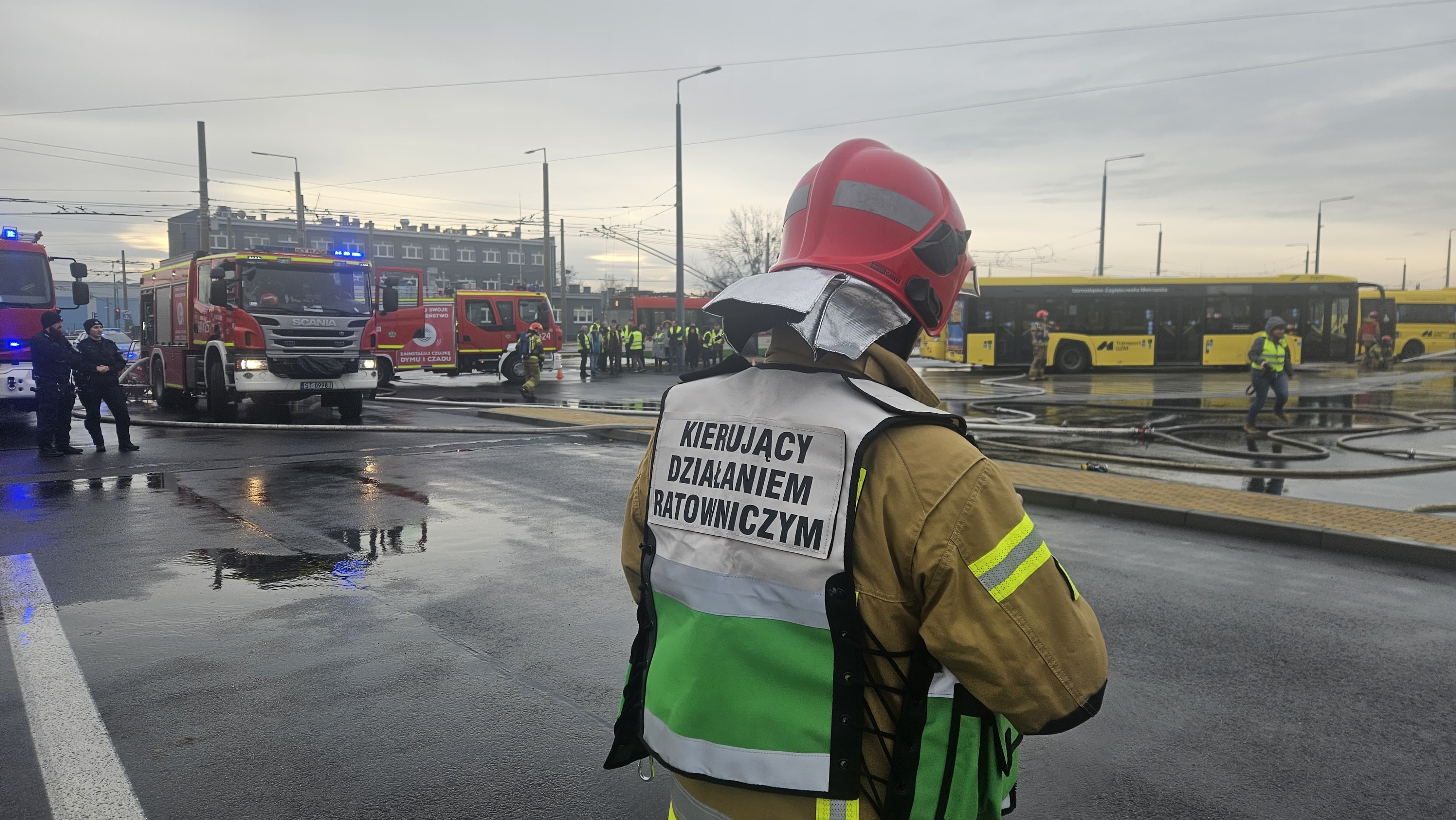 Pożar autobusu na terenie zajezdni – zagrożone inne autobusy oraz stacja ładowania gazu. Jeden z pracowników podczas próby gaszenia został poparzony!