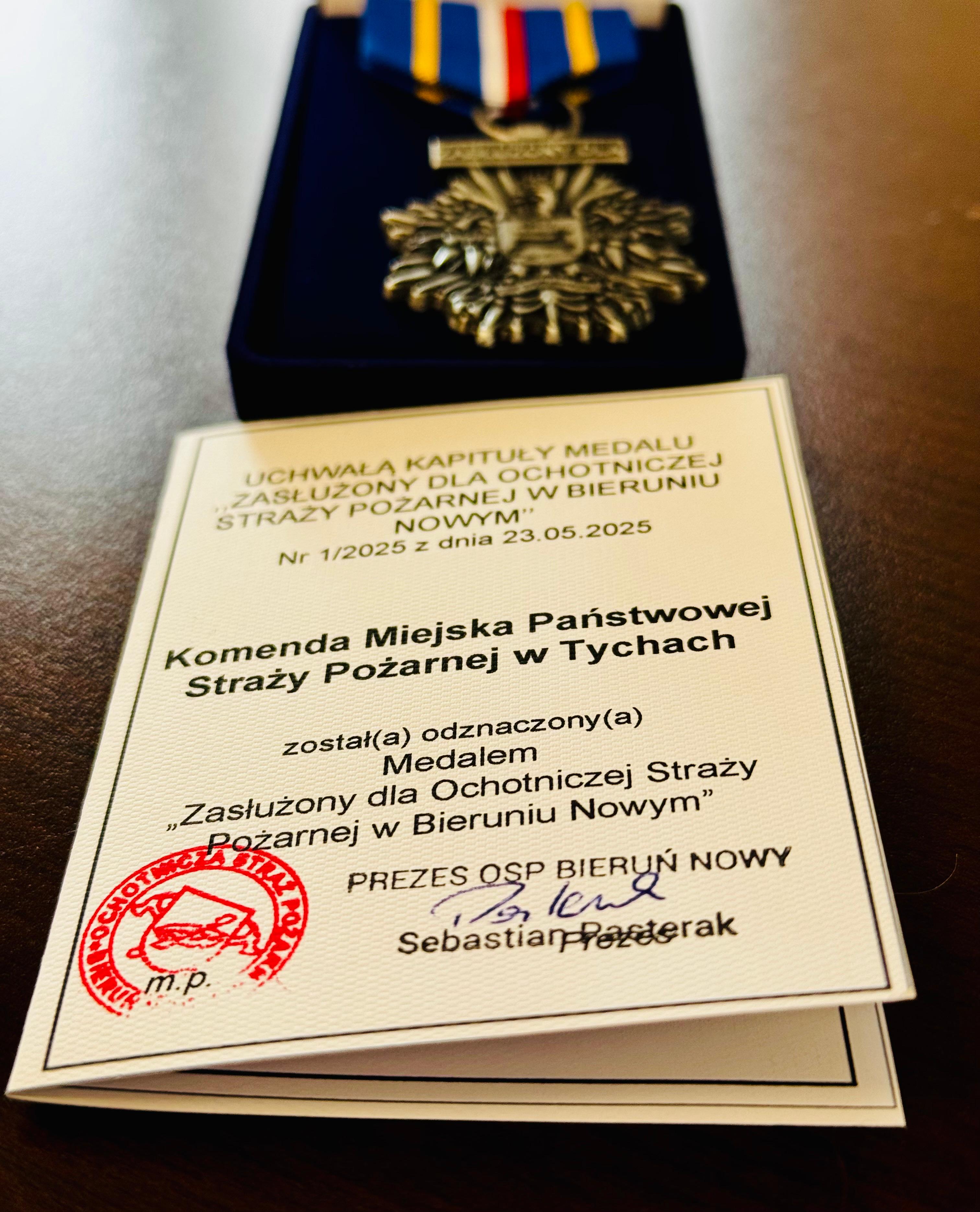 Bieruń, 21 czerwca 2025 r. — Komenda Miejska Państwowej Straży Pożarnej w Tychach została uhonorowana Medalem „Zasłużony dla Ochotniczej Straży Pożarnej w Bieruniu Nowym”. Uroczyste wręczenie odznaczenia miało miejsce podczas obchodów 100-lecia OSP Bieruń Nowy oraz Powiatowego Dnia Strażaka.