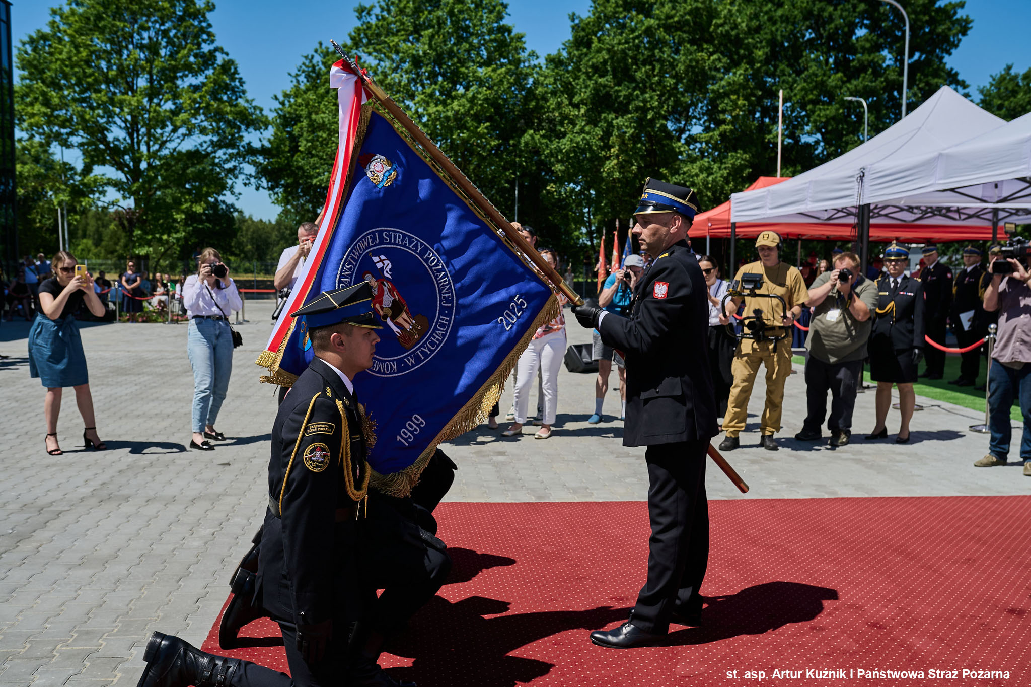 Centralnym punktem uroczystości było przekazanie sztandaru, nadanego przez Ministra Spraw Wewnętrznych i Administracji Komendzie Miejskiej PSP w Tychach. W imieniu Ministra, ten zaszczytny symbol wręczył Komendant Główny PSP, nadbrygadier Wojciech Kruczek. Sztandar z jego rąk odebrał Komendant Miejski PSP w Tychach, który z dumą zaprezentował go i przekazał pocztowi sztandarowemu Komendy.