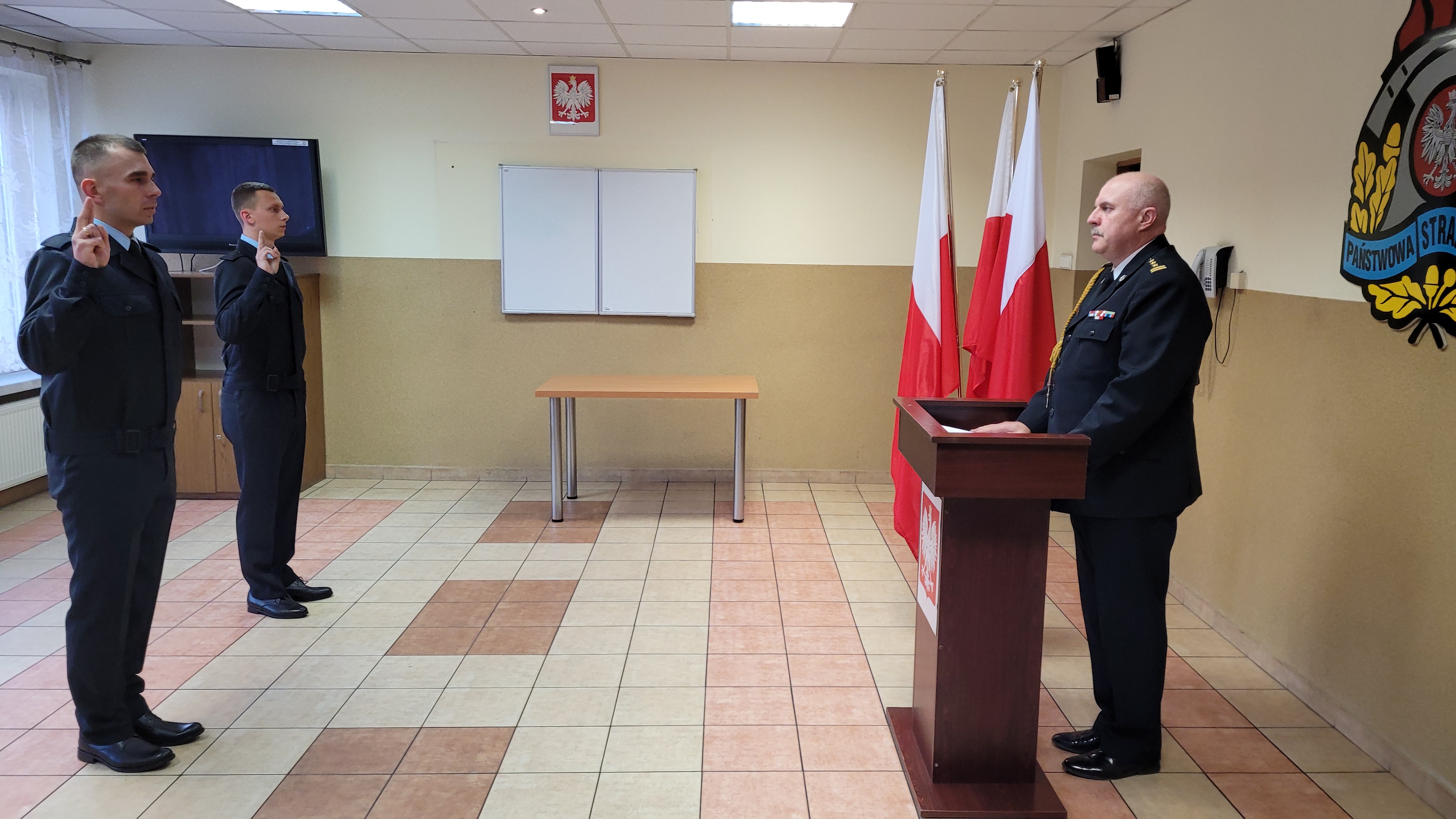 Ślubowanie dwóch funkcjonariuszy przyjętych do służby w Państwowej Straży Pożarnej w Tychach