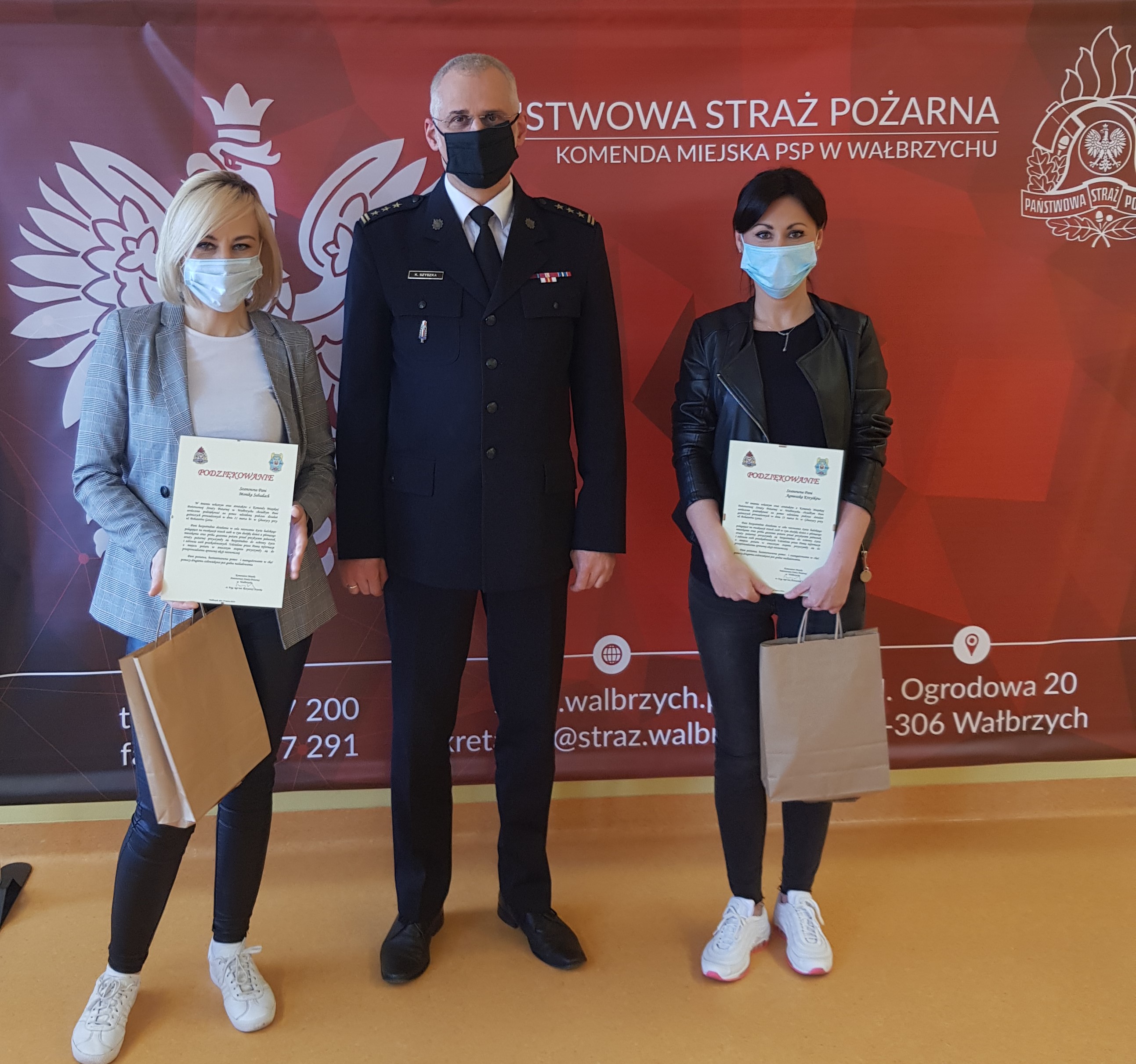 30 kwietnia 2021r. w tutejszej komendzie odbyło się spotkanie, podczas którego Komendant Miejski Państwowej Straży Pożarnej w Wałbrzychu st. bryg. Krzysztof Szyszka uhonorował listami gratulacyjnymi Panią Monikę Sabadach oraz Panią Agnieszkę Krzyśków.