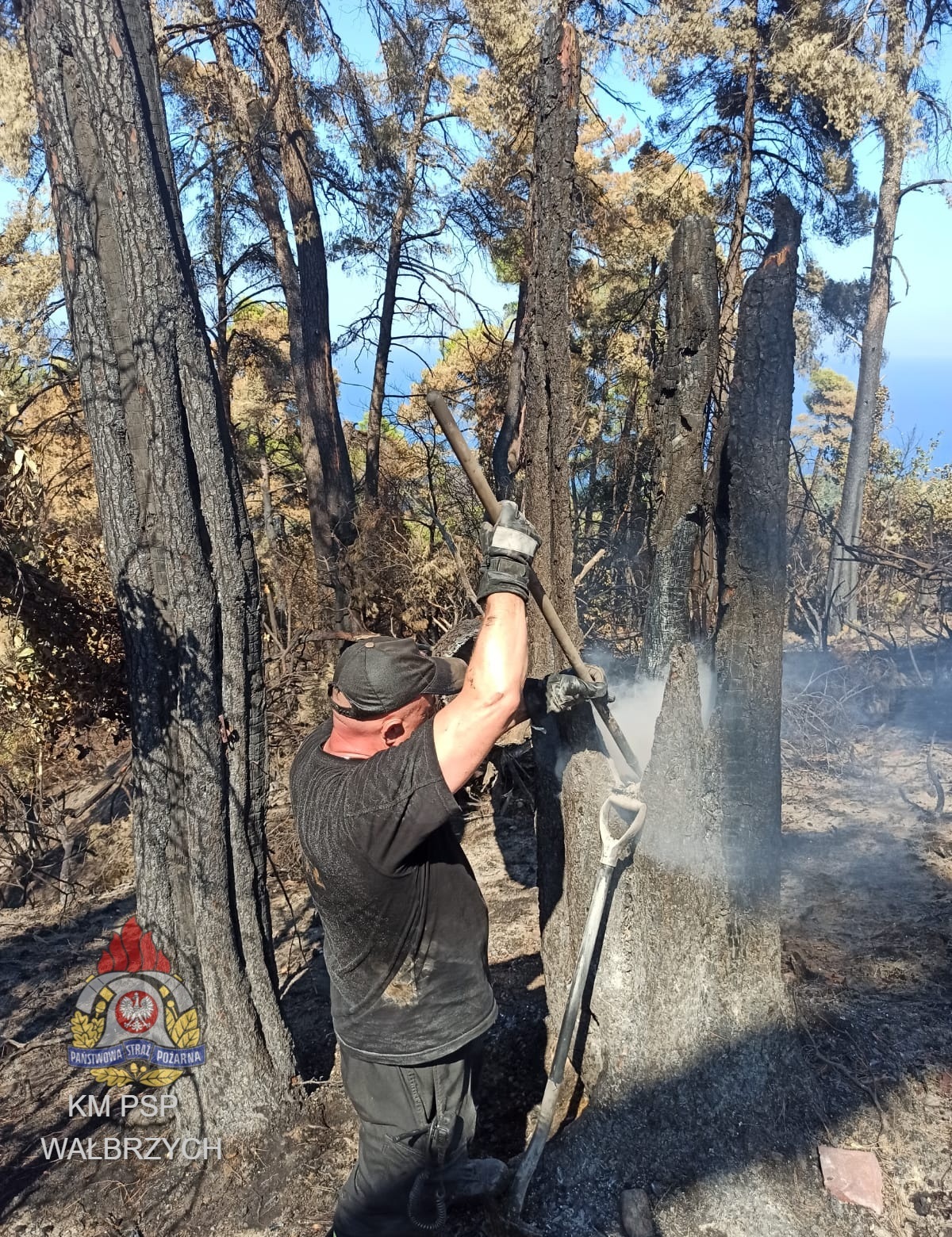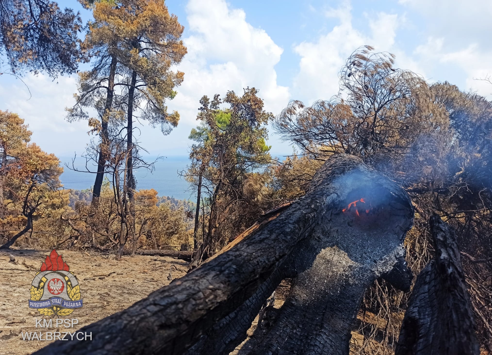 Z naszej Komendy na miejscu pracują trzej ratownicy. Przedstawiamy krótką relację zdjęciową z ich pracy na wyspie Evia. W dniu dzisiejszym nasi strażacy wraz z kolegami z KP Kamienna Góra w ramach modułu GFFFV Wrocław wspólnie działają w trudno dostępnym terenie górskim dogaszając miejsca ujęte pożarem.