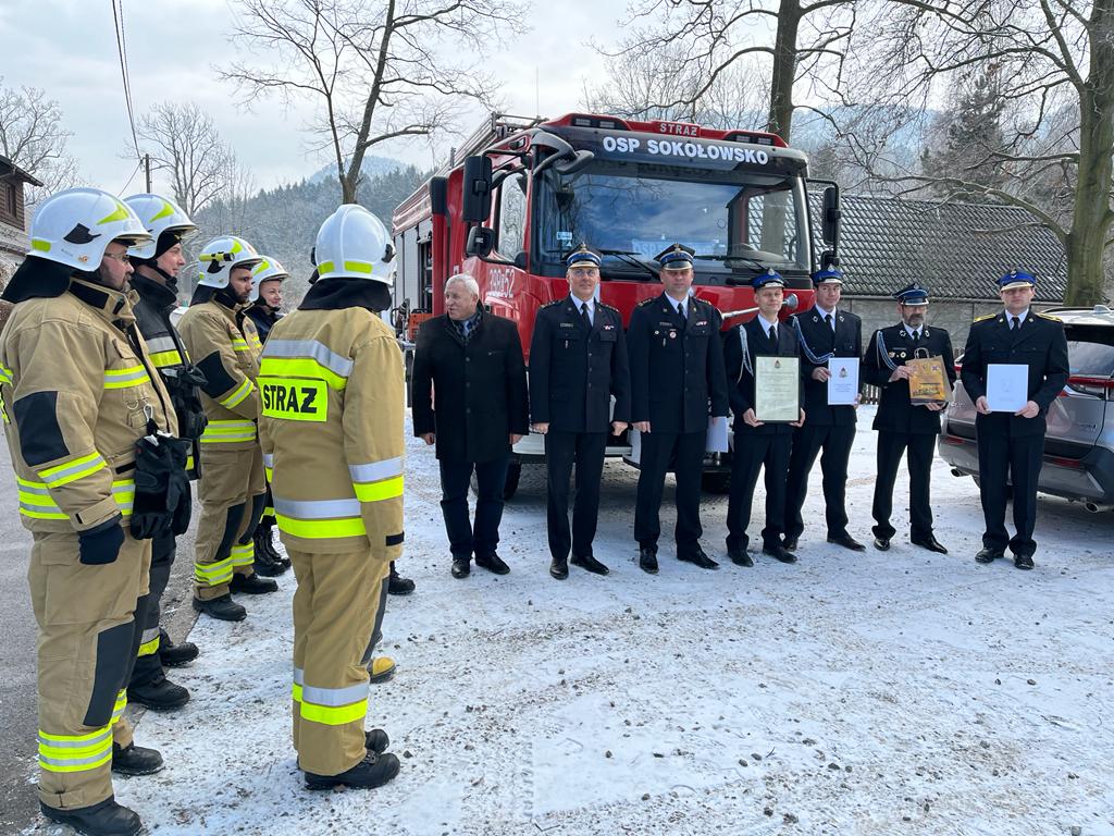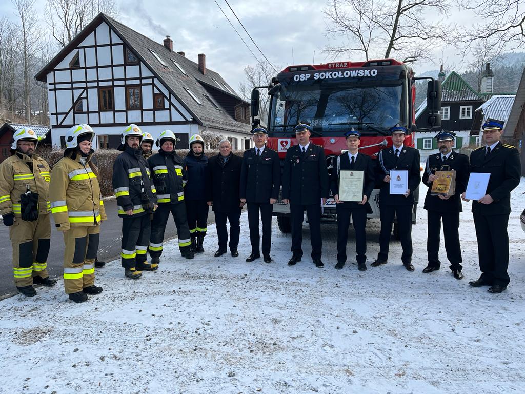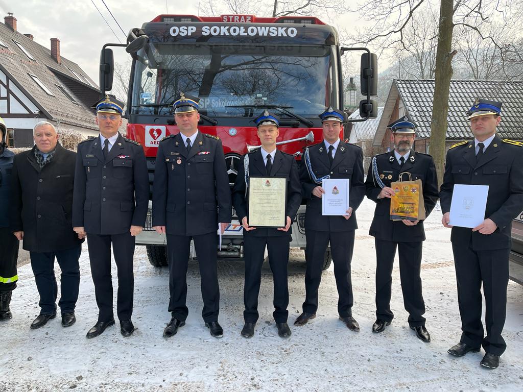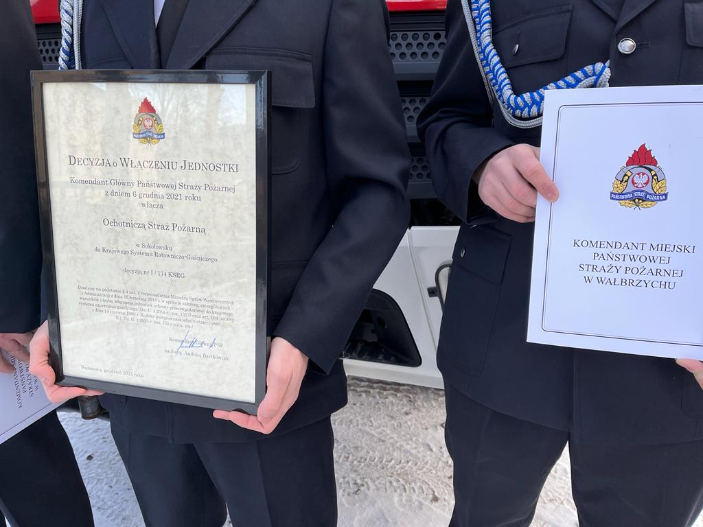 Dnia dzisiejszego tj. 12 stycznia 2022r. Komendant Miejski st. bryg. Krzysztof Szyszka w obecności Z-cy Komendanta st.bryg. Pawłą Kalińskiego, Burmistrza Mieroszowa Andrzeja Lipińskiego oraz druhów OSP Sokołowsko, wręczył uroczyście prezesowi OSP Sokołowsko druhowi Łukaszowi Marchewa Decyzję nr I/174 KSRG Komendanta Głównego PSP nadbrygadiera A. Bartkowiaka o włączeniu OSP Sokołowsko do Krajowego Systemu Ratowniczo-Gaśniczego. Uroczystość włączenia jednostki do KSRG była także okazją do przekazania druhom zestawu hydraulicznego Holmatro (nożyco-rozpieracz, pompa oraz dodatkowe wyposażenie). Na terenie miasta Wałbrzych i powiatu wałbrzyskiego funkcjonuje 17 ochotniczych straży pożarnych. Jedenaście jednostek jest włączonych do Krajowego Systemu Ratowniczo- Gaśniczego (KSRG). Celem istnienia KSRG jest ujednolicenie działań o charakterze ratowniczym, podejmowanych w sytuacjach zagrożeń życia, zdrowia, mienia lub środowiska, podejmowanych przez Państwową Straż Pożarną i inne podmioty ratownicze (głównie Ochotnicze Straże Pożarne). Końcem ubiegłego roku tj.