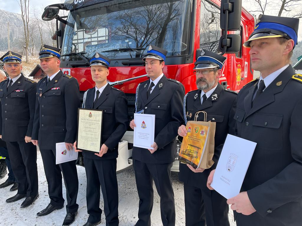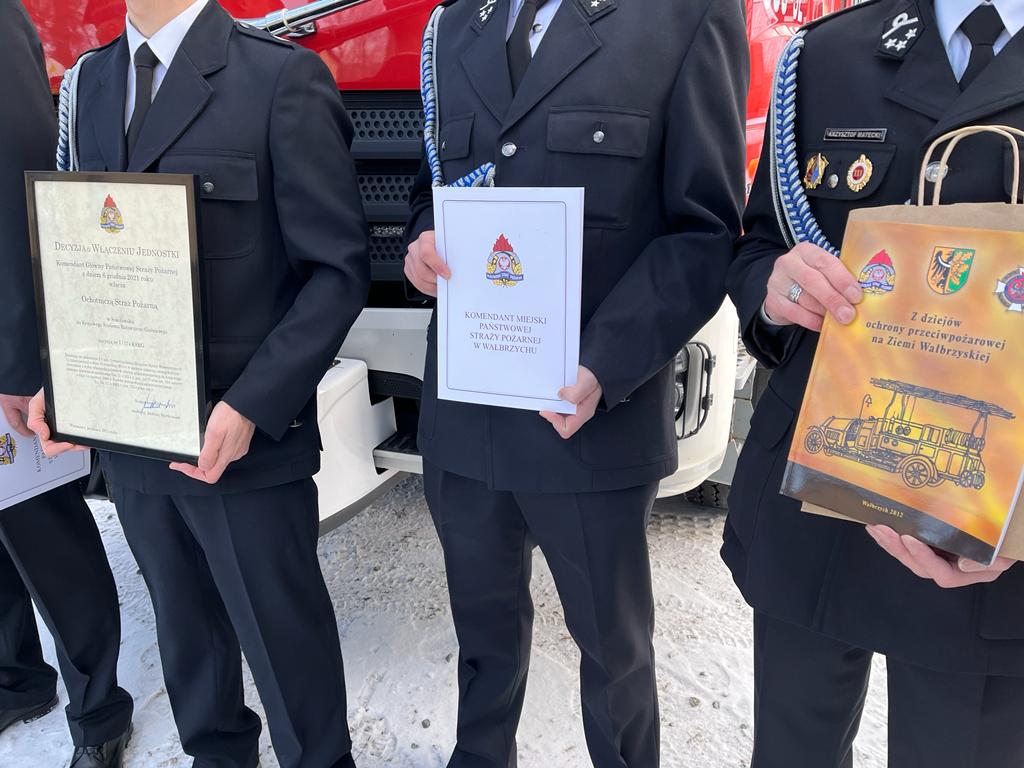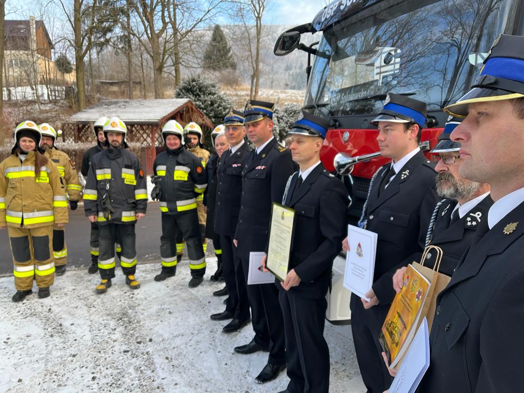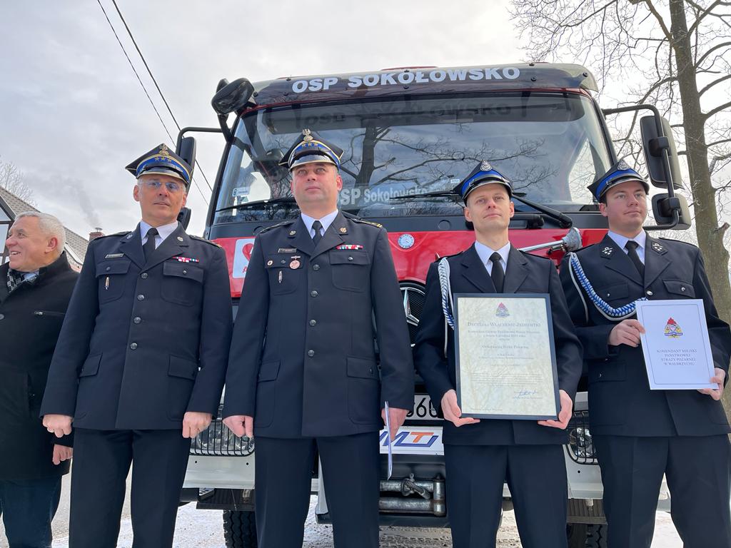 Dnia dzisiejszego tj. 12 stycznia 2022r. Komendant Miejski st. bryg. Krzysztof Szyszka w obecności Z-cy Komendanta st.bryg. Pawłą Kalińskiego, Burmistrza Mieroszowa Andrzeja Lipińskiego oraz druhów OSP Sokołowsko, wręczył uroczyście prezesowi OSP Sokołowsko druhowi Łukaszowi Marchewa Decyzję nr I/174 KSRG Komendanta Głównego PSP nadbrygadiera A. Bartkowiaka o włączeniu OSP Sokołowsko do Krajowego Systemu Ratowniczo-Gaśniczego. Uroczystość włączenia jednostki do KSRG była także okazją do przekazania druhom zestawu hydraulicznego Holmatro (nożyco-rozpieracz, pompa oraz dodatkowe wyposażenie). Na terenie miasta Wałbrzych i powiatu wałbrzyskiego funkcjonuje 17 ochotniczych straży pożarnych. Jedenaście jednostek jest włączonych do Krajowego Systemu Ratowniczo- Gaśniczego (KSRG). Celem istnienia KSRG jest ujednolicenie działań o charakterze ratowniczym, podejmowanych w sytuacjach zagrożeń życia, zdrowia, mienia lub środowiska, podejmowanych przez Państwową Straż Pożarną i inne podmioty ratownicze (głównie Ochotnicze Straże Pożarne). Końcem ubiegłego roku tj.