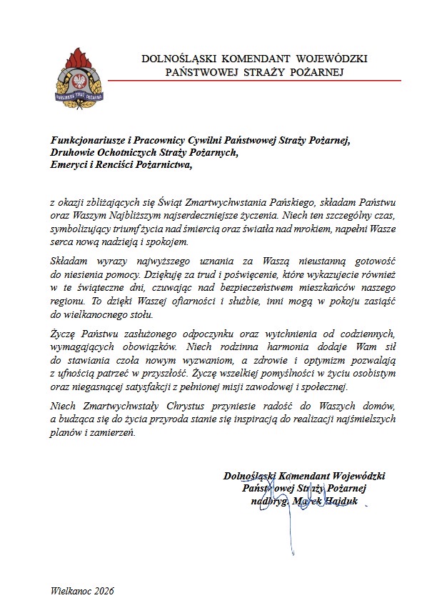 Życzenia Komendanta Wojewódzkiego PSP nadbryg. Marka Hajduka z okazji Świąt Wielkanocy 2026 03.04.2026