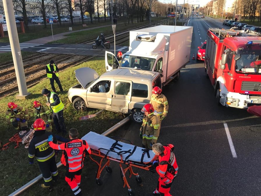W dniu 02.12.2021 r. około godziny 9:00 do Jednostki Ratowniczo - Gaśniczej nr 9 wpłynęło zgłoszenie o wypadku na skrzyżowaniu ulic Woronicza i Modzelewskiego. Do zdarzenia zadysponowano GBA-Rt 2,5/25/2,5 oraz GCBA 5/32/2,5.