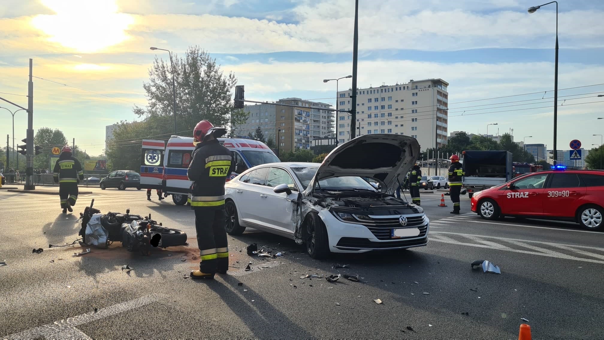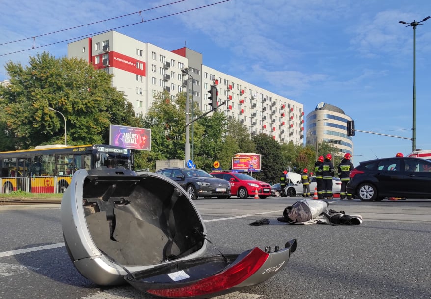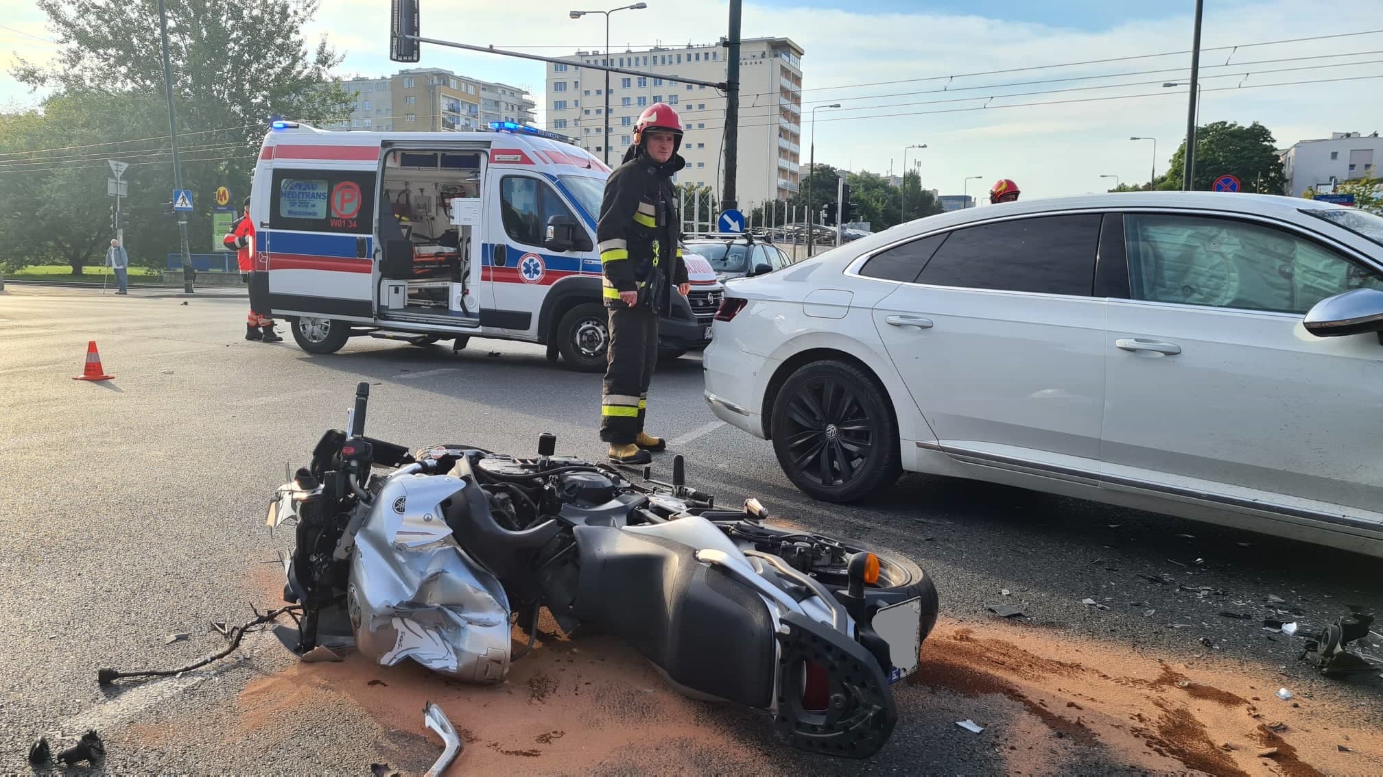 Po przyjeździe na miejsce zdarzenia zastano leżącego na ziemi motocyklistę, któremu pomocy udzielali będący na miejscu pracownicy pogotowia ratunkowego. Poszkodowany był przytomny, miał widoczne obrażenia głowy. Po udzieleniu pierwszej pomocy kierujący motocyklista został odwieziony do jednego z warszawskich szpitali na dalsze badania. Pozostałe osoby biorące udział w zdarzeniu nie wymagały pomocy medycznej.
