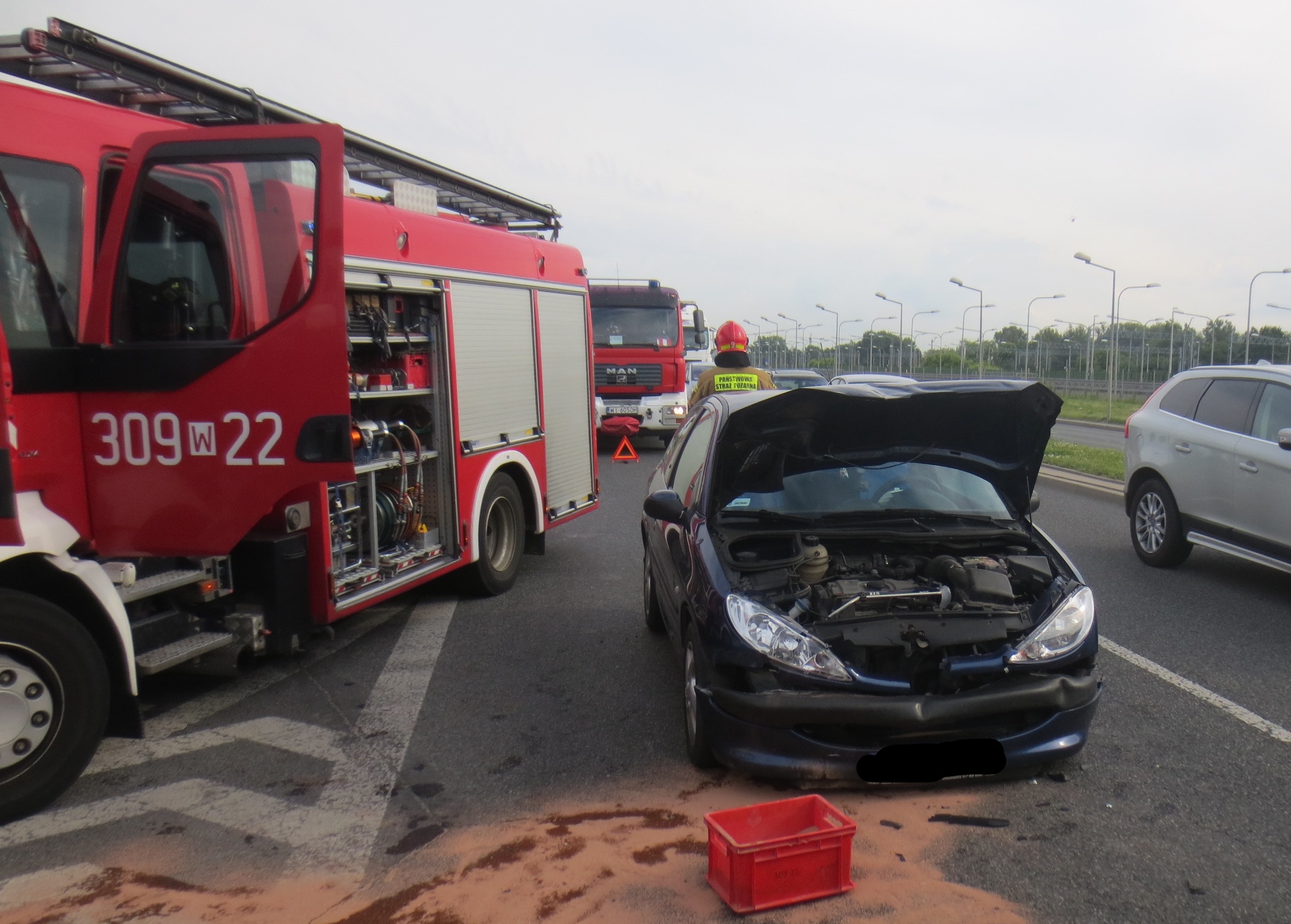 Po dojeździe na miejsce zdarzenia stwierdzono wypadek czterech samochodów osobowych, auta kolejno najechały na siebie. W samochodach łącznie podróżowało pięć osób, osoby te opuściły pojazdy samodzielnie przed przybyciem zastępów PSP. Działania zastępów polegały na udzieleniu kwalifikowanej pierwszej pomocy jednej osobie poprzez zabezpieczenie odcinka szyjnego przy użyciu kołnierza ortopedycznego oraz zaopatrzeniu rany głowy. Jednocześnie prowadzono działania zabezpieczające miejsce zdarzenia, odłączono zasilanie w pojazdach oraz usunięto wycieki płynów eksploatacyjnych.