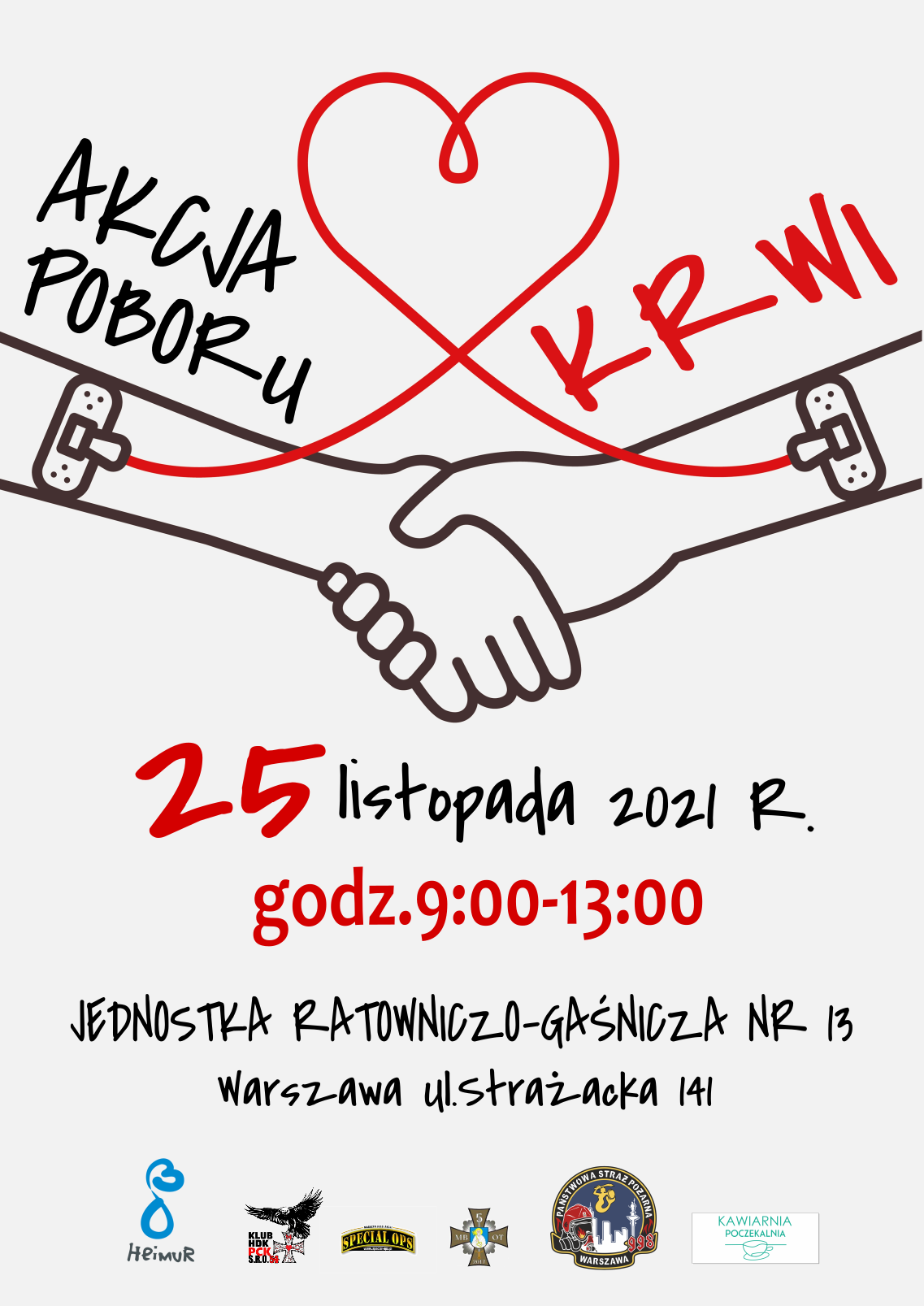 Zapraszamy serdecznie do udziału w akcji poboru krwi, która odbędzie się w dniu 25.11.2021 r. (czwartek), w godz. 9:00-13:00, na terenie Jednostki Ratowniczo-Gaśniczej nr 13 przy ul. Strażackiej 141 (dzielnica Rembertów m. st. Warszawa).