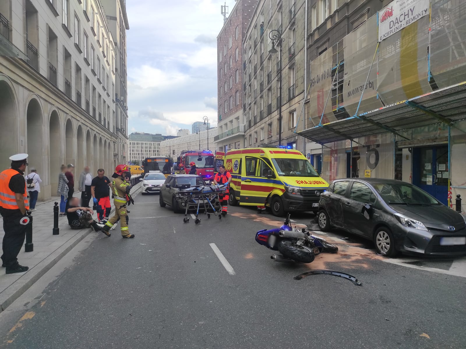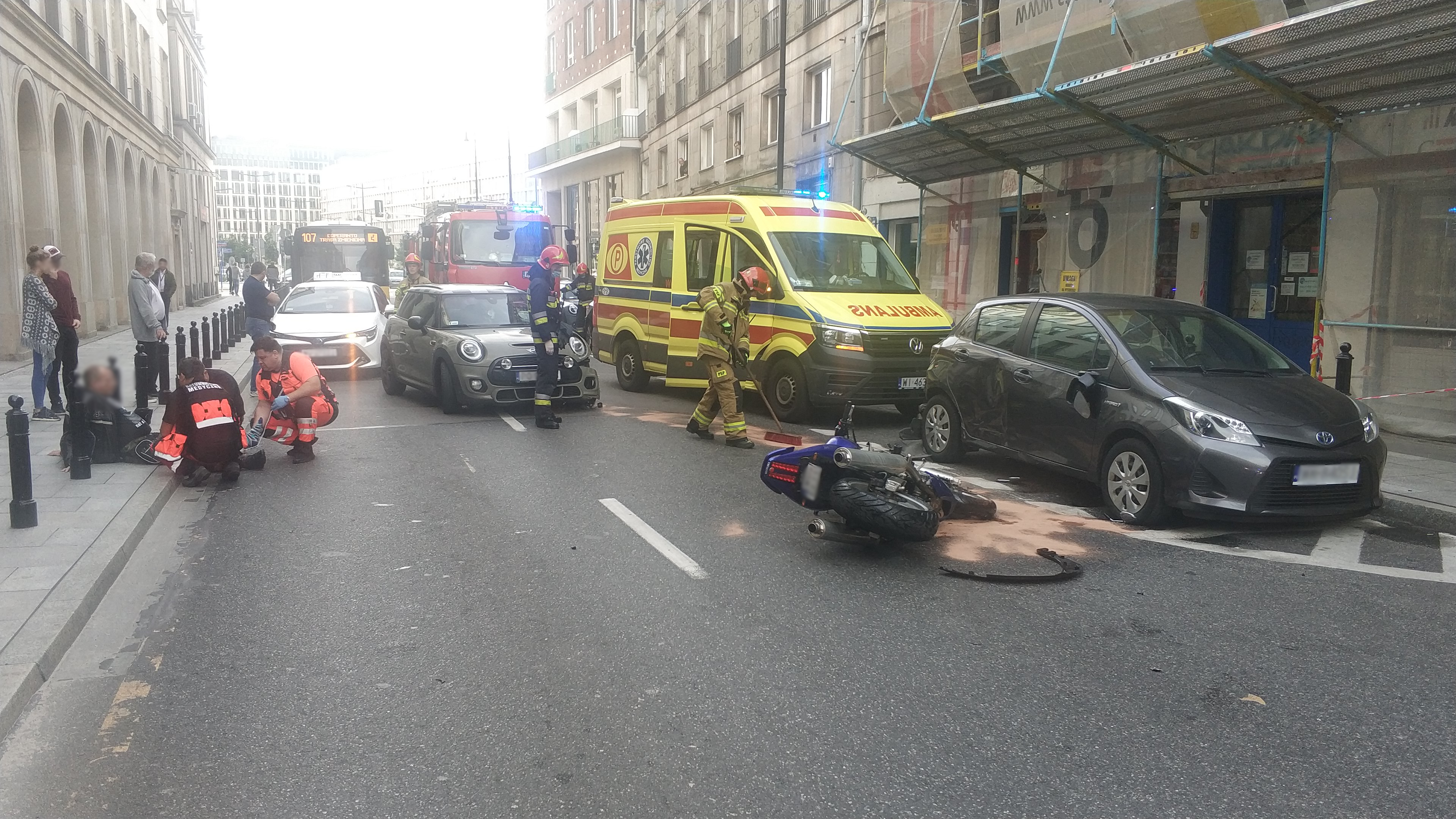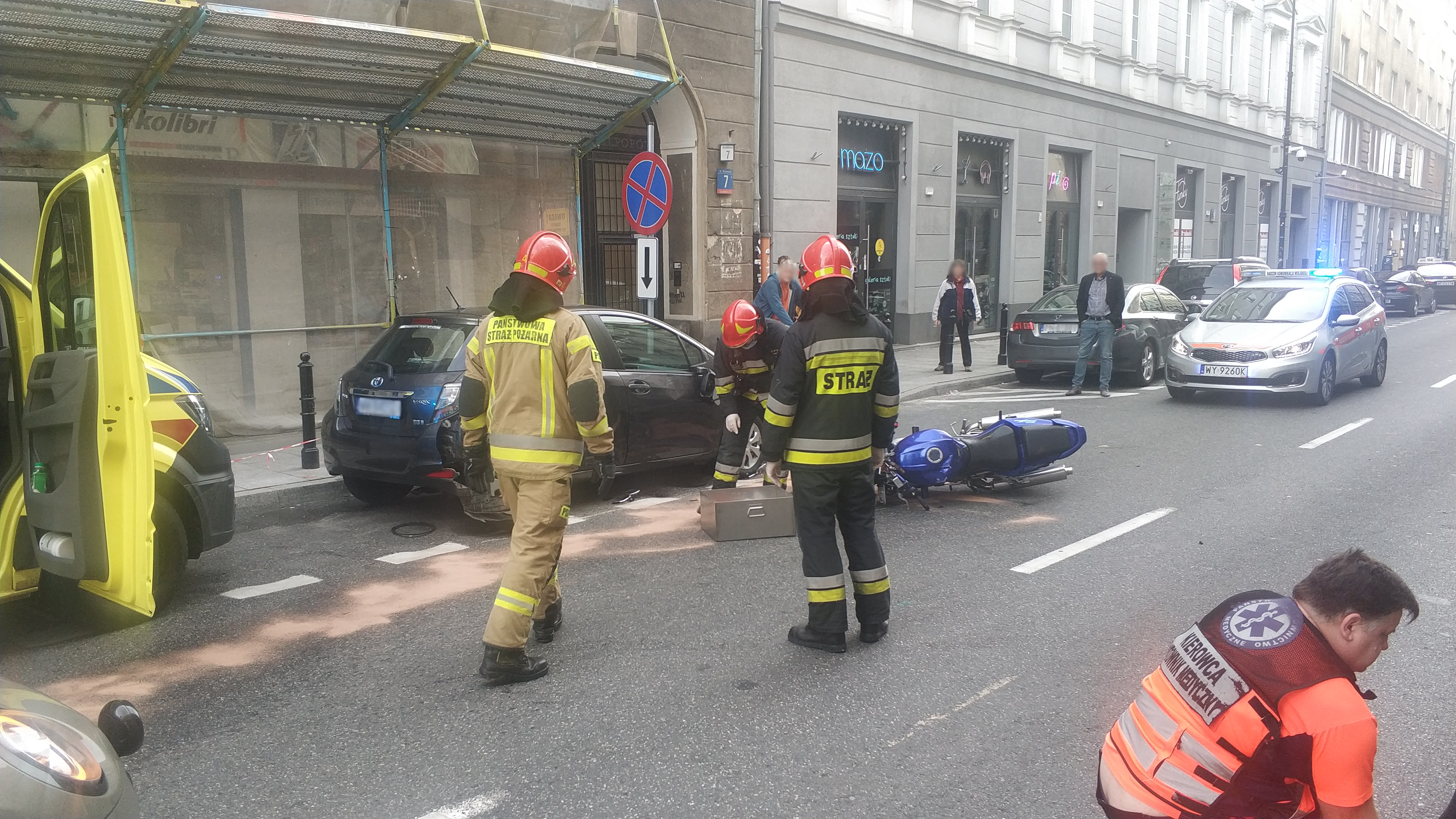Po przybyciu na miejsce zdarzenia zastępów PSP z JRG 4 stwierdzono, że na wysokości ul. Mazowieckiej 7 doszło do zderzenia samochodu osobowego z motocyklem. Na miejscu była obecna załoga Pogotowia Ratunkowego. Kierujący motocyklem Suzuki był przytomny, kontaktowy i znajdował się na chodniku pod opieką Ratowników z Pogotowia Ratunkowego. Poszkodowany uskarżał się na ból lewej nogi. Dwie osoby podróżujące samochodem osobowym Minii Cooper i biorący udział w zdarzeniu wyszły o własnych siłach z pojazdu.