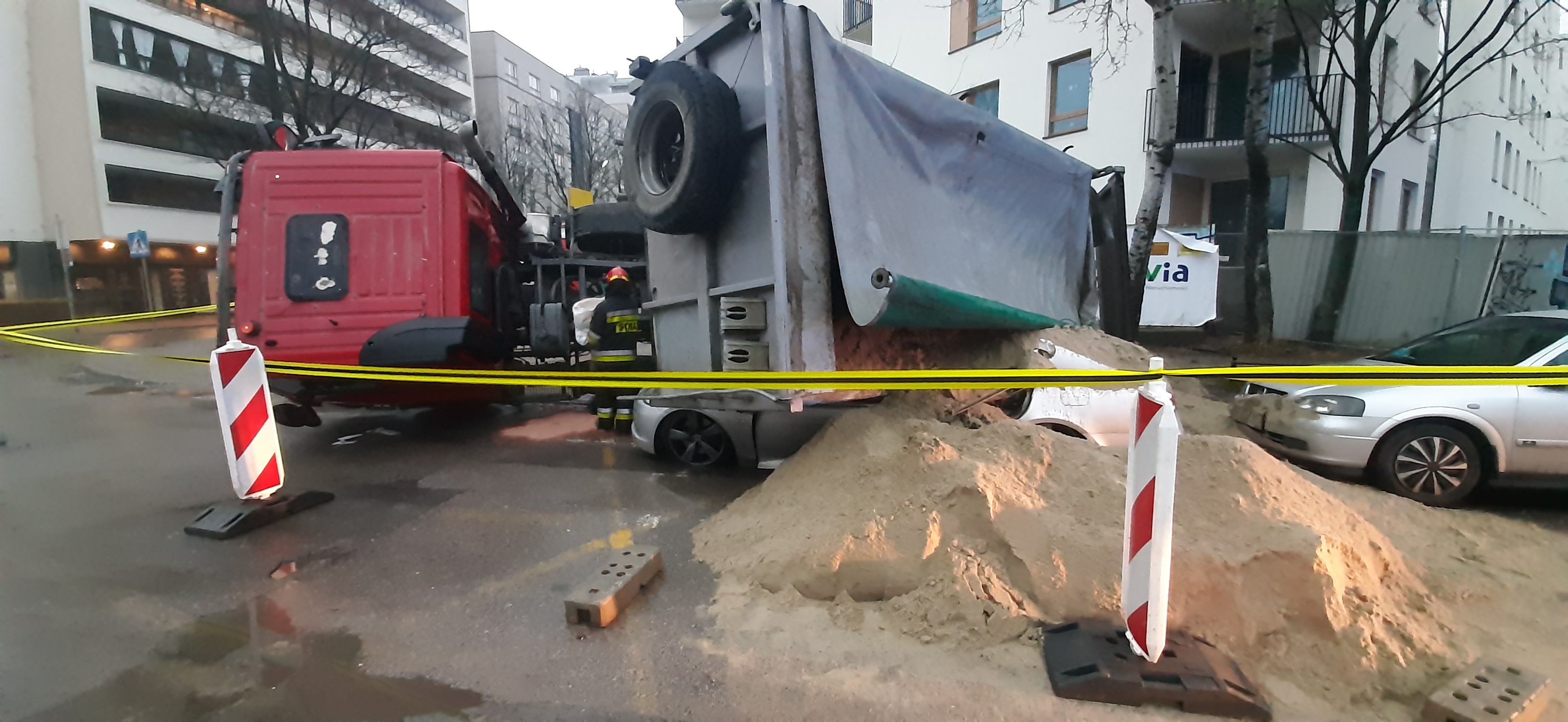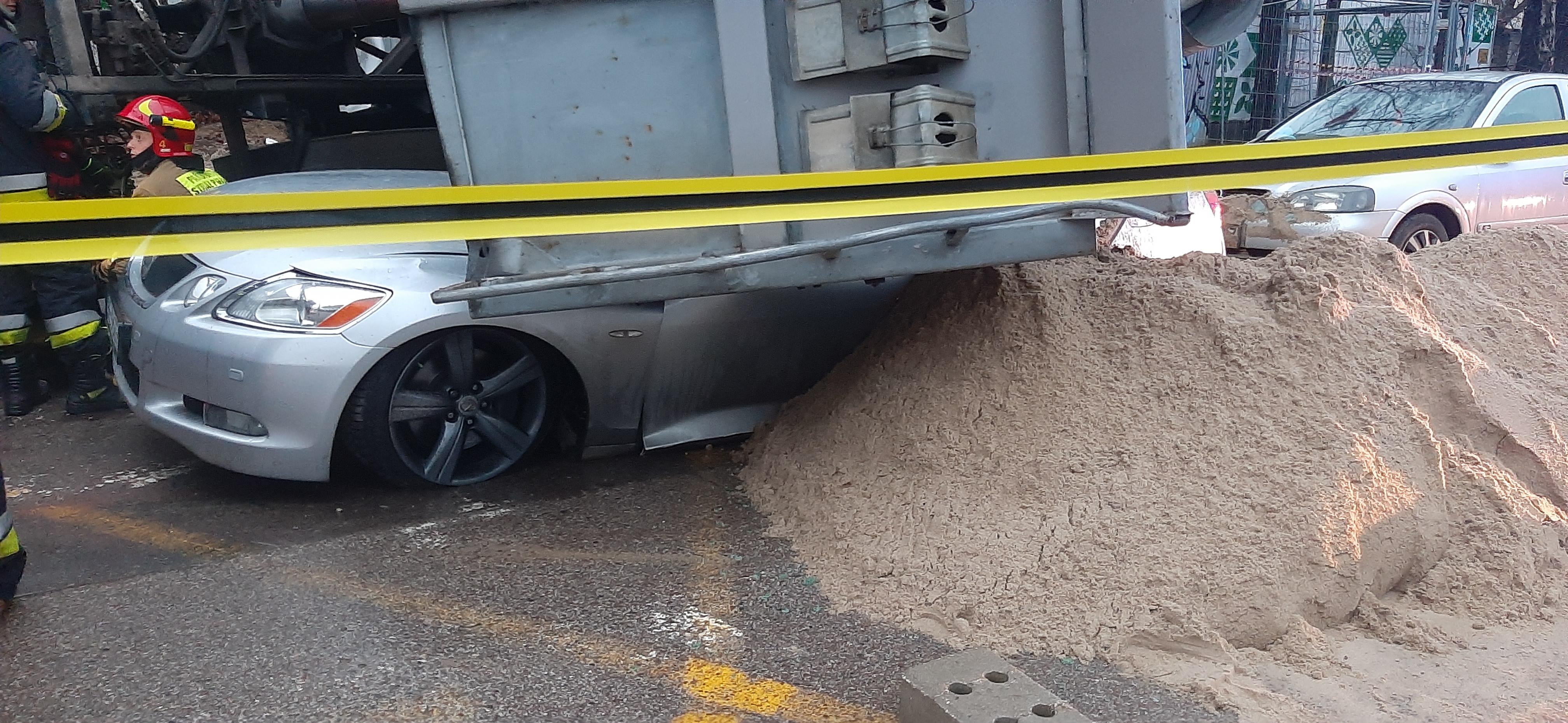 29.11.2021 Wawrzyszewska - Ciężarówka przewróciła się na samochód osobowy.