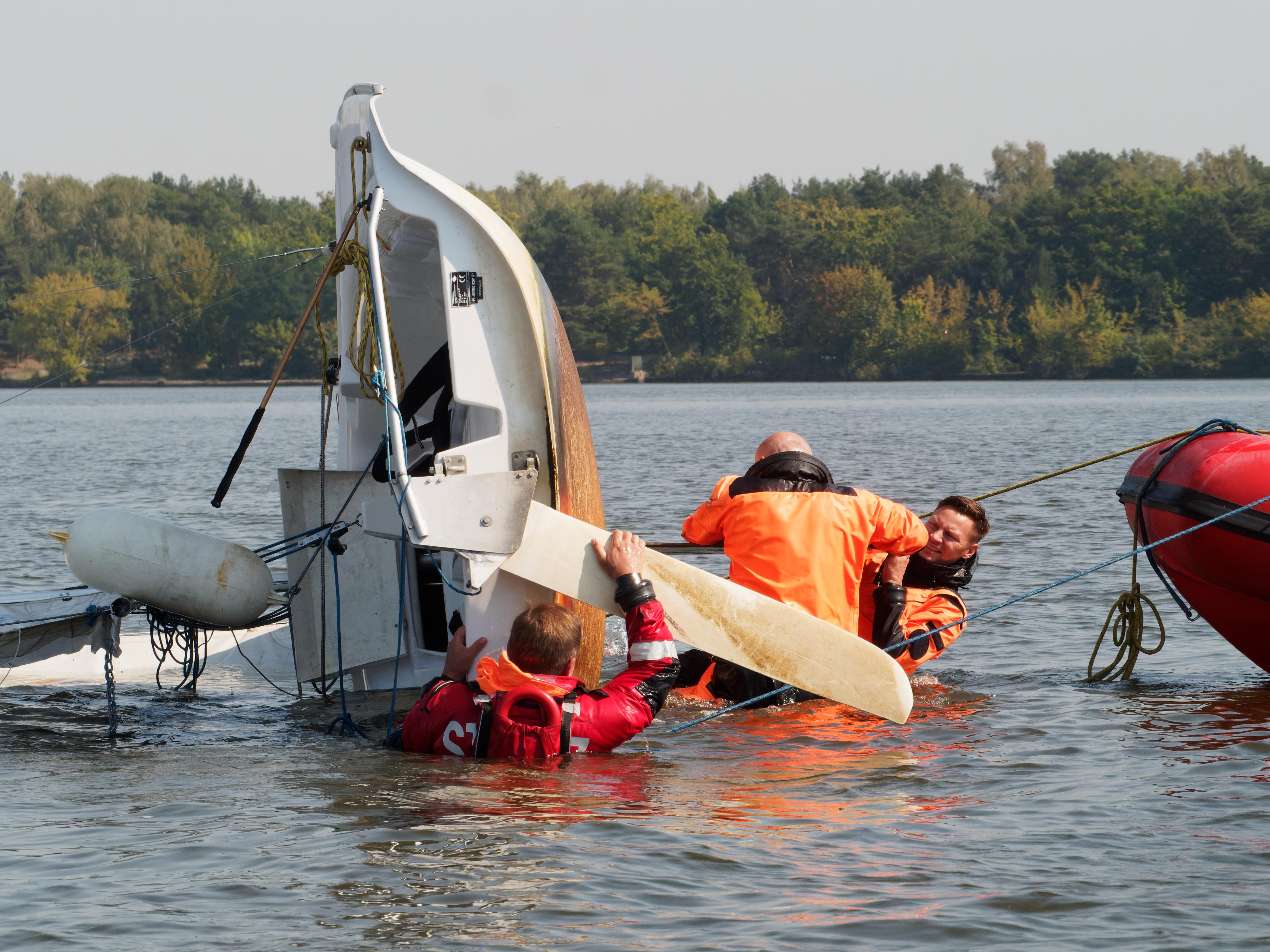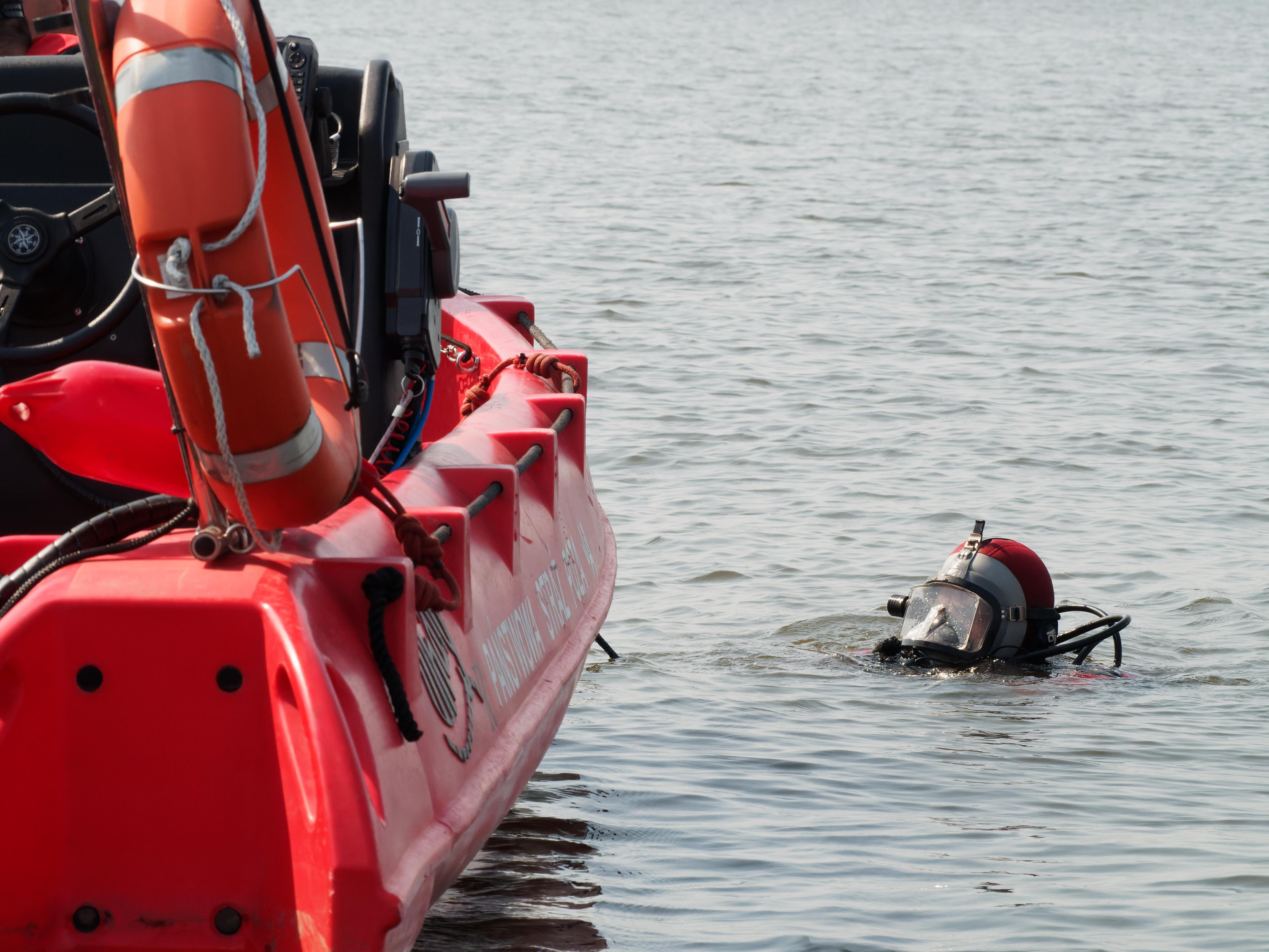 Ćwiczenia obejmowały również poszukiwania manekina pozorującego osobę zaginioną pod wodą w wyniku przewrócenia jachtu. Działania poszukiwawcze nurków były wspomagane przez urządzenie hydroakustyczne, które umożliwiło precyzyjne określenie lokalizacji pozoranta. Po wyciągnięciu na powierzchnię, ćwiczony był element udzielania kwalifikowanej pierwszej pomocy.