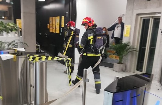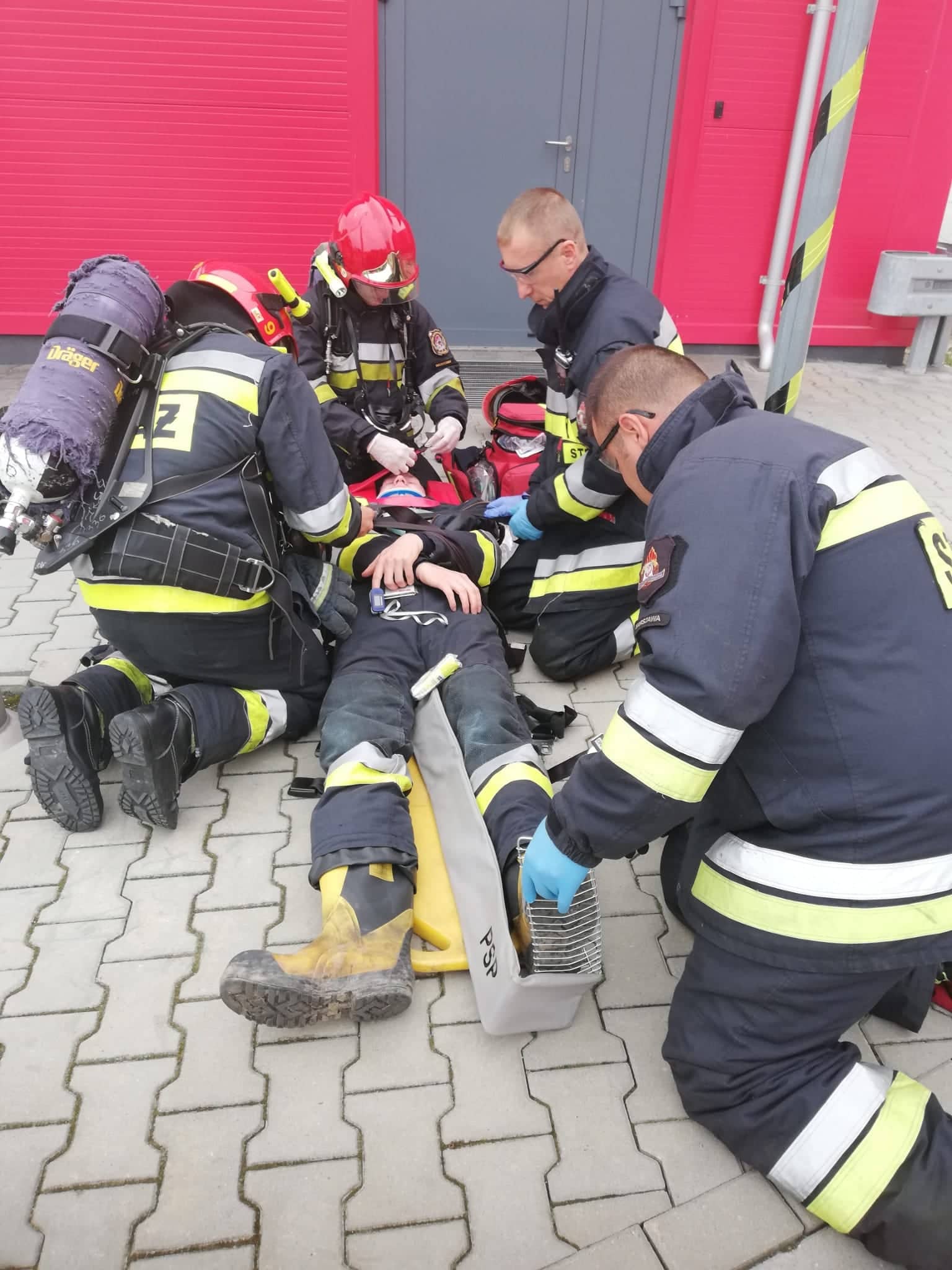 Część praktyczna ćwiczeń obejmowała założenie w którym dochodzi do pożaru w holu głównym części administracyjno – biurowej obiektu. W pomieszczeniu sali konferencyjnej, znajdującej się obok miejsca źródła pożaru zostaje uwięziony jeden mężczyzna. Silne zadymienie uniemożliwia mu wydostanie się z obiektu. W wyniku przenikania zadymienia do pomieszczenia, osoba ta traci przytomność. Wprowadza się dwie linie gaśnicze składające się z dwóch odcinków do wnętrza budynku. Jedna rota zajmuje się zlokalizowaniem pożaru, natomiast druga ewakuacją poszkodowanego do punktu medycznego, gdzie ratownicy udzielają kwalifikowanej pierwszej pomocy. Po zlikwidowaniu pożaru, hol zostaje oddymiony i sprawdzony detektorem wielogazowym pod kątem obecności tlenku węgla.