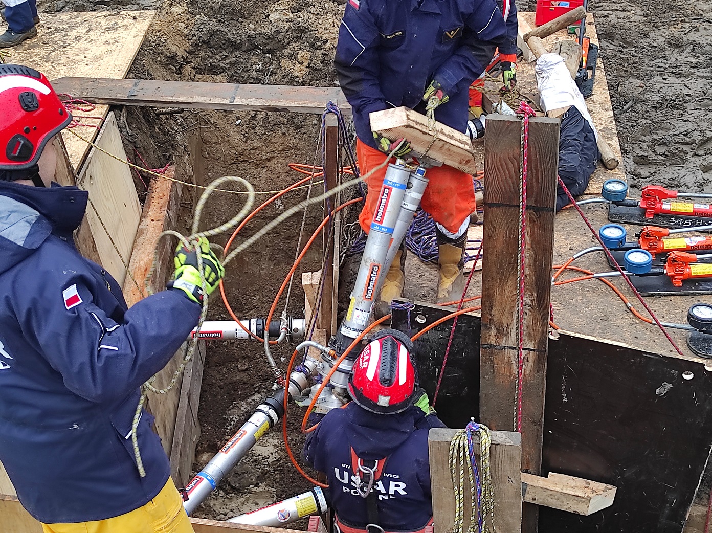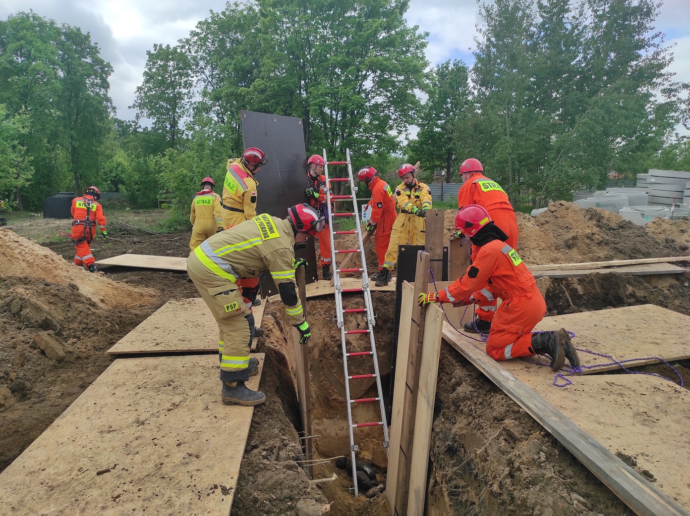 W maju br. ratownicy JRG 15 ze Specjalistycznej Grupy Poszukiwawczo-Ratowniczej "Warszawa 9" przeprowadzili praktyczne ćwiczenia z zakresu prowadzenia działań ratowniczych w wykopach wąskoprzestrzennych. W ramach prowadzonego doskonalenia zawodowego przypomniano zasady stabilizacji wykopów i zasypów ziemnych przy wykorzystaniu podpór ratowniczych oraz drewna. Praktycznie przećwiczono stabilizację ścian: