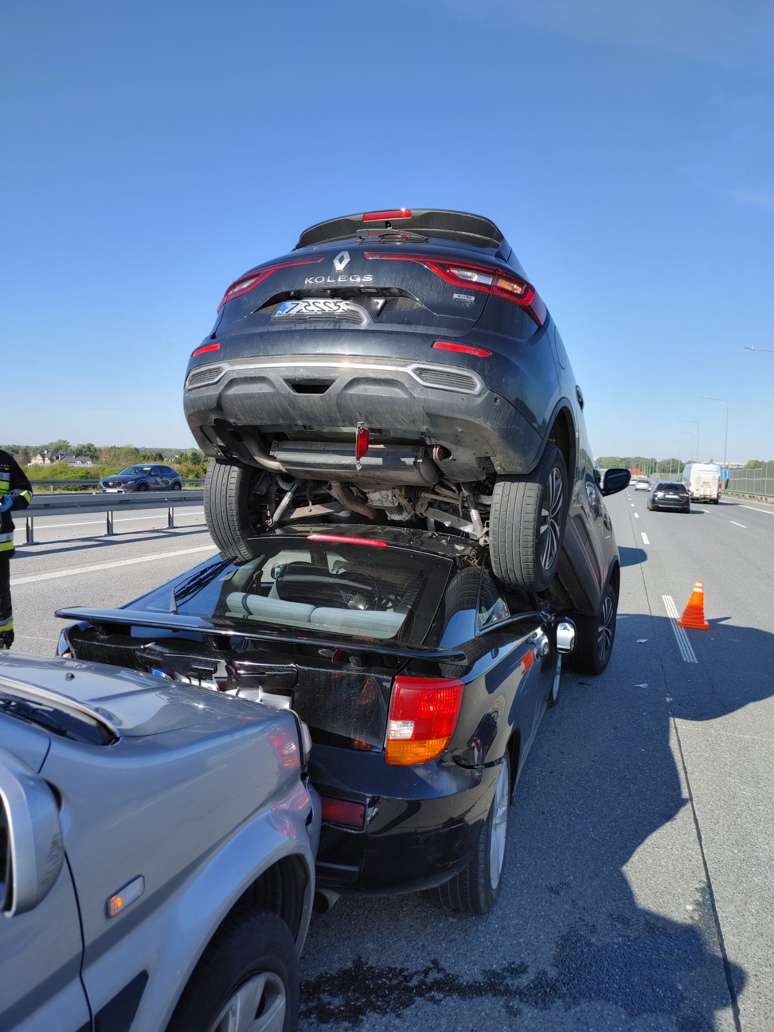 Po przybyciu na miejsce zdarzenia strażacy zastali kolizję czterech aut osobowych w kierunku Wilanowa. Wszyscy uczestnicy wypadku przebywali poza swoimi pojazdami. Auta blokowały jeden pas ruchu. Działania zastępów polegały na zabezpieczeniu miejsca zdarzenia, wstępnej ocenie osób poszkodowanych pod kątem urazów i obrażeń. Żaden z uczestników zdarzenia nie wymagał interwencji medycznej. Następnie zabezpieczono samochody poprzez odłączenie akumulatorów i podłożenie klinów pod pojazd Renault Koleos będący na dachu Toyoty Celica . Na miejsce zadysponowano SCRt Scania z JRG 10. Po wykonaniu niezbędnych czynności przez Policję WRD przystąpiono do „zdjęcia” auta Renault z samochodu Toyota. Uniesiono tył auta, a gdy zrobiła się przestrzeń wyciągnięto przy pomocy wyciągarki samochód Toyota Celica. Pojazdy odstawiono w wyznaczone przez Policję miejsce.