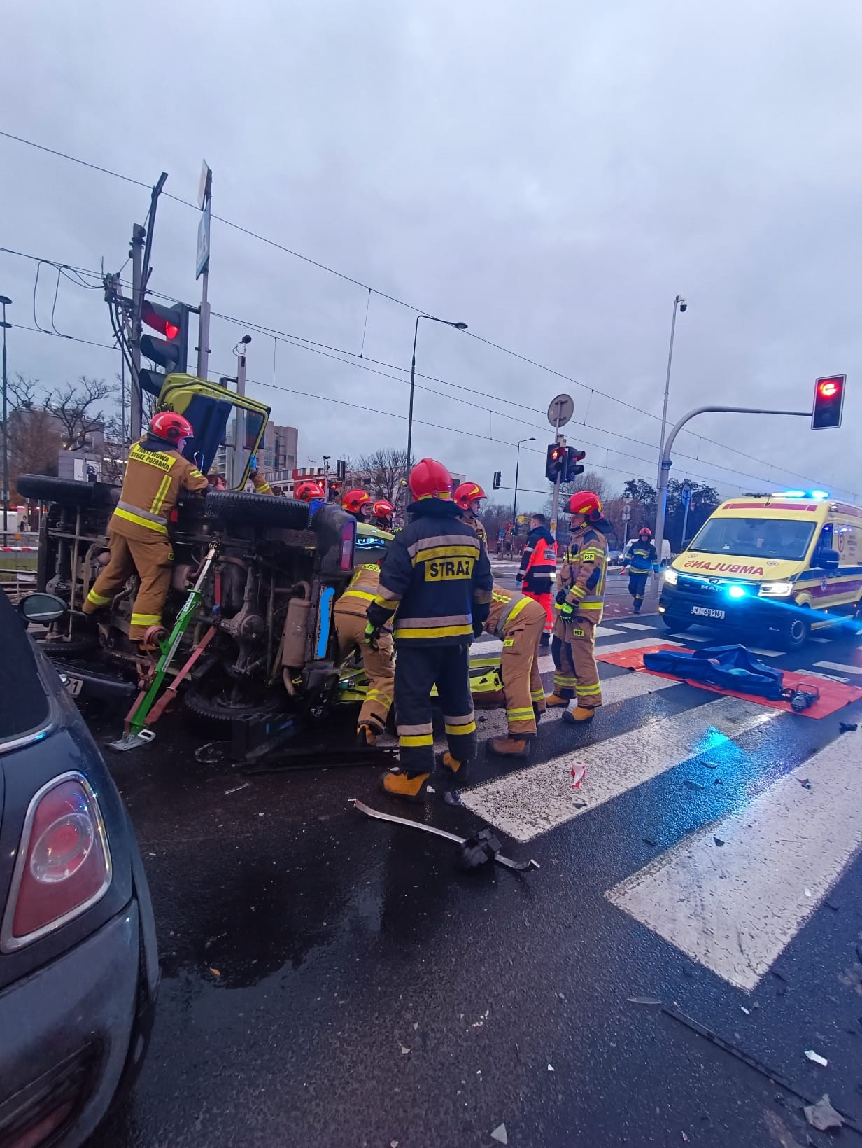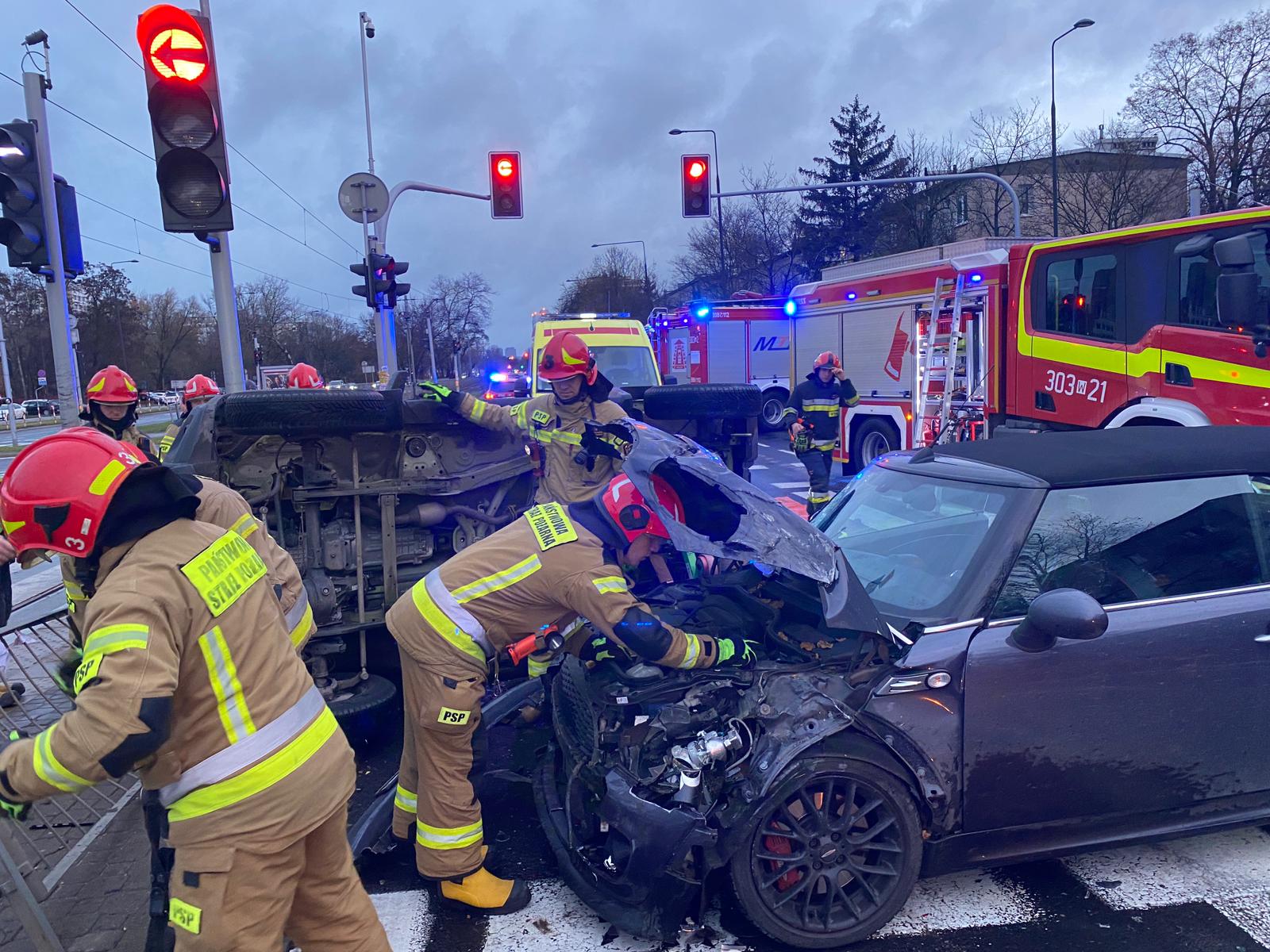 W dniu 20.12.2023 r. JRG 3 została zadysponowana do kolizji trzech samochodów osobowych przy ul. Wołoskiej. Po przybyciu na miejsce zdarzenia zastano leżący na boku samochód Suzuki oraz stojący na kołach samochód Mini Cooper, które blokowały drogę w kierunku ul. Racławickiej. Trzeci samochód marki Renault stał na chodniku. W wyniku zdarzenia kierująca samochodem marki Suzuki znajdowała się w pojeździe pod opieką ZRM, pozostali kierowcy opuścili pojazdy o własnych siłach. Działania PSP polegały na zabezpieczeniu miejsca zdarzenia, stabilizacji samochodu Suzuki przy użyciu podpór do szybkiej stabilizacji oraz klinów oraz wykonaniu dostępu umożliwiającego poszkodowanej opuszczenie pojazdu poprzez usunięcie sprzętem hydraulicznym kraty w bagażniku pojazdu. Neutralizację płynów eksploatacyjnych, które rozlały się na jezdni wykonano po zakończeniu działań ratowniczych.