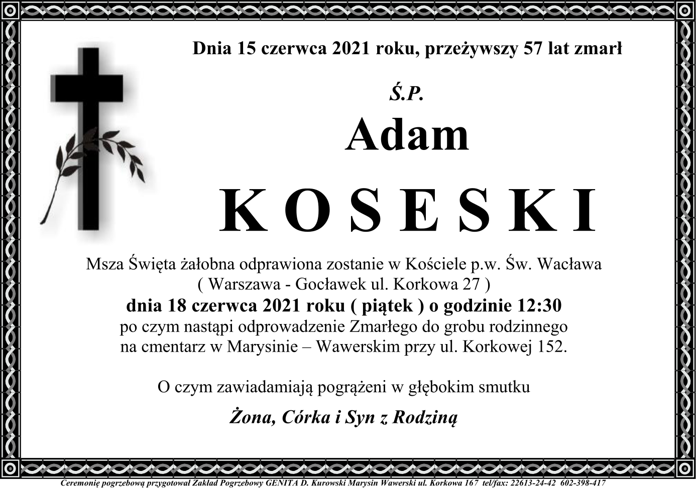 Z głębokim żalem informujemy, że w dniu 15 czerwca 2021 r. na wieczną służbę odszedł wieloletni pracownik Komendy Miejskiej Państwowej Straży Pożarnej m.st. Warszawy - st. asp. w st. spocz. Adam Koseski.