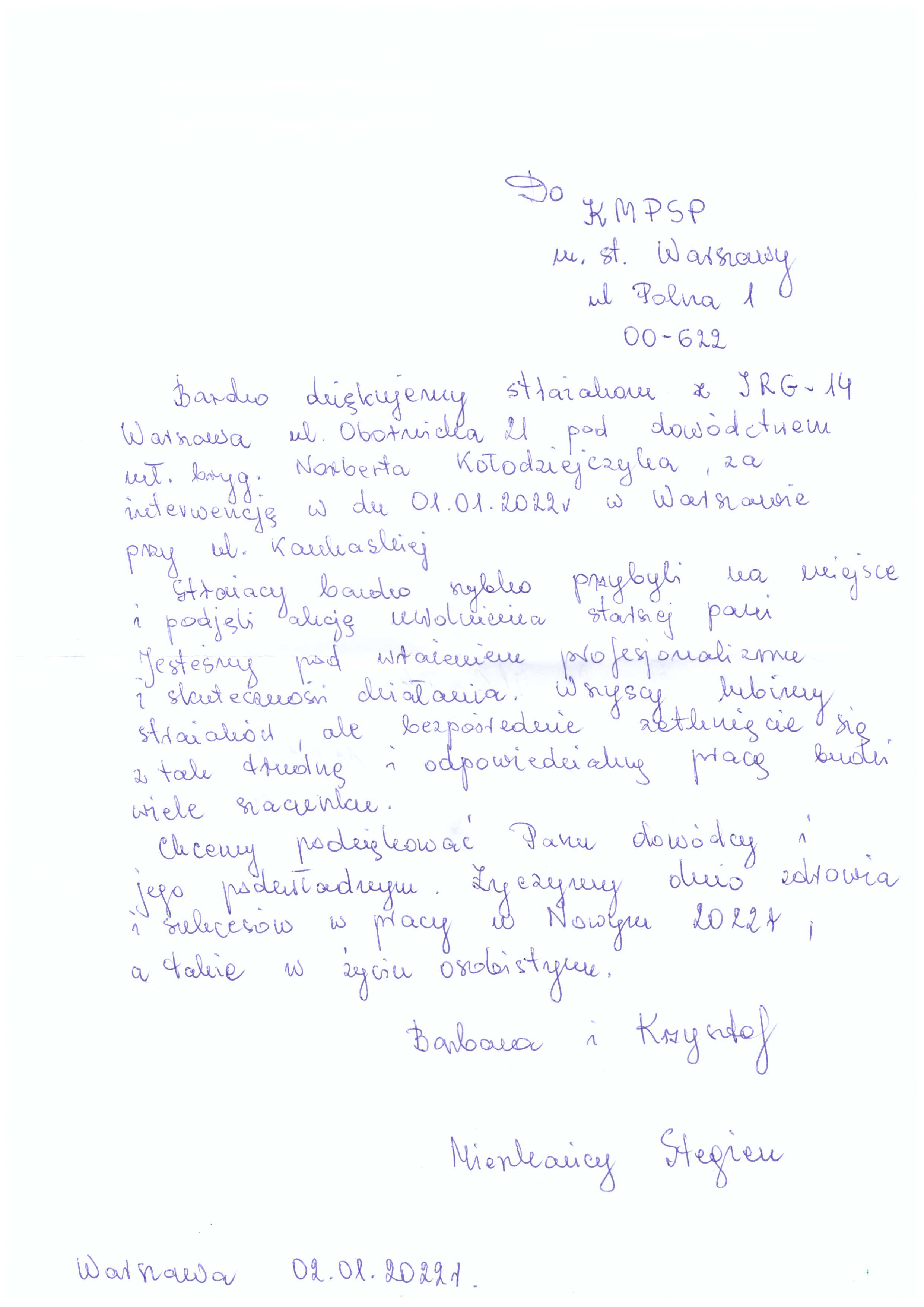 Do Komendy Miejskiej Państwowej Straży Pożarnej m.st. Warszawy wpłynęły podzękowania dla strażaków JGR 14, którzy uczestniczyli w działaniach w dniu 1 stycznia 2022 r. przy ul. Kaukaskiej.
