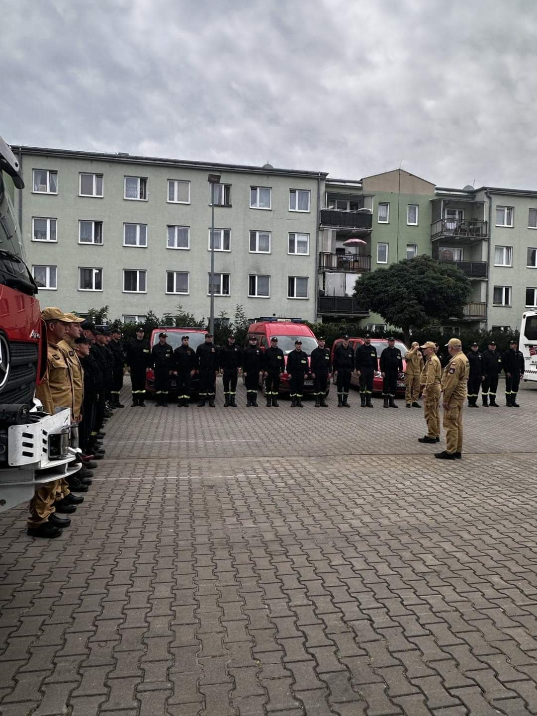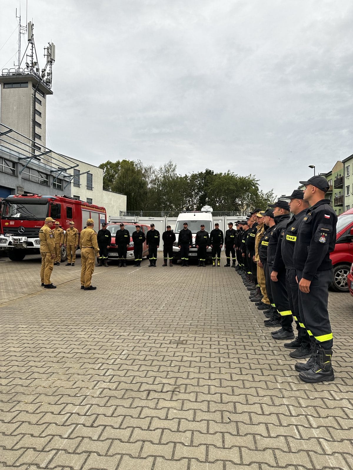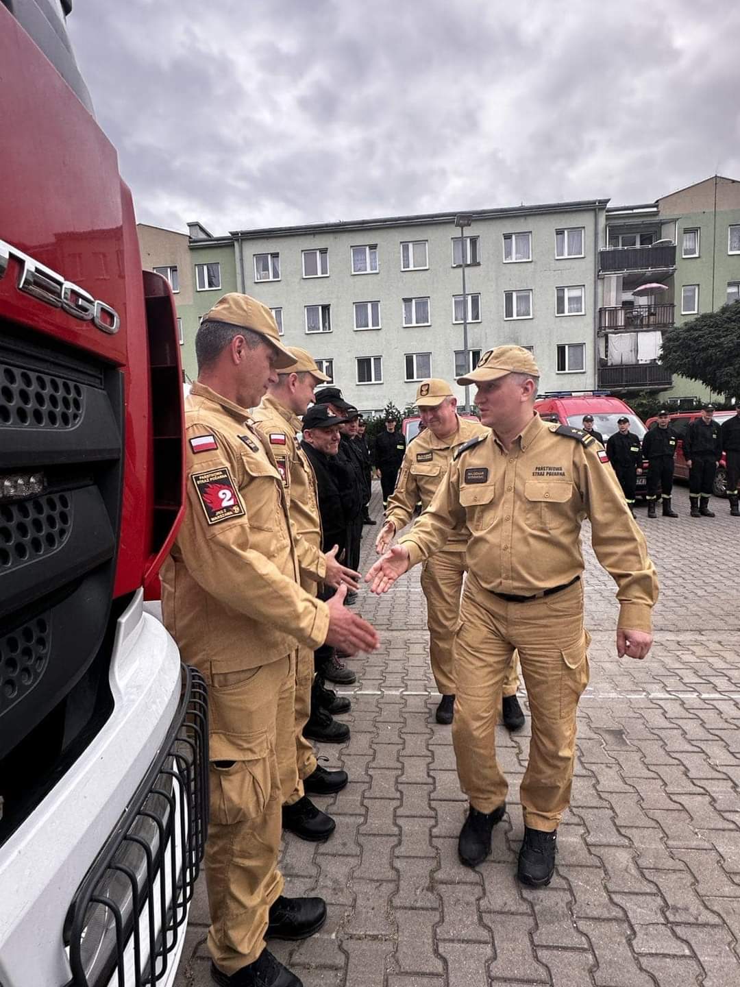 Powracających strażaków przywitał bryg. Waldemar Wysowski - Zastępca Mazowieckiego Komendanta Wojewódzkiego PSP wraz ze st. bryg. Sławomirem Sierpatowskim - Zastępcą Komendanta Miejskiego PSP m.st. Warszawy. W krótkich przemówieniach, Komendanci podziękowali za pracę i trud funkcjonariuszy podczas tego długotrwałego wydarzenia.