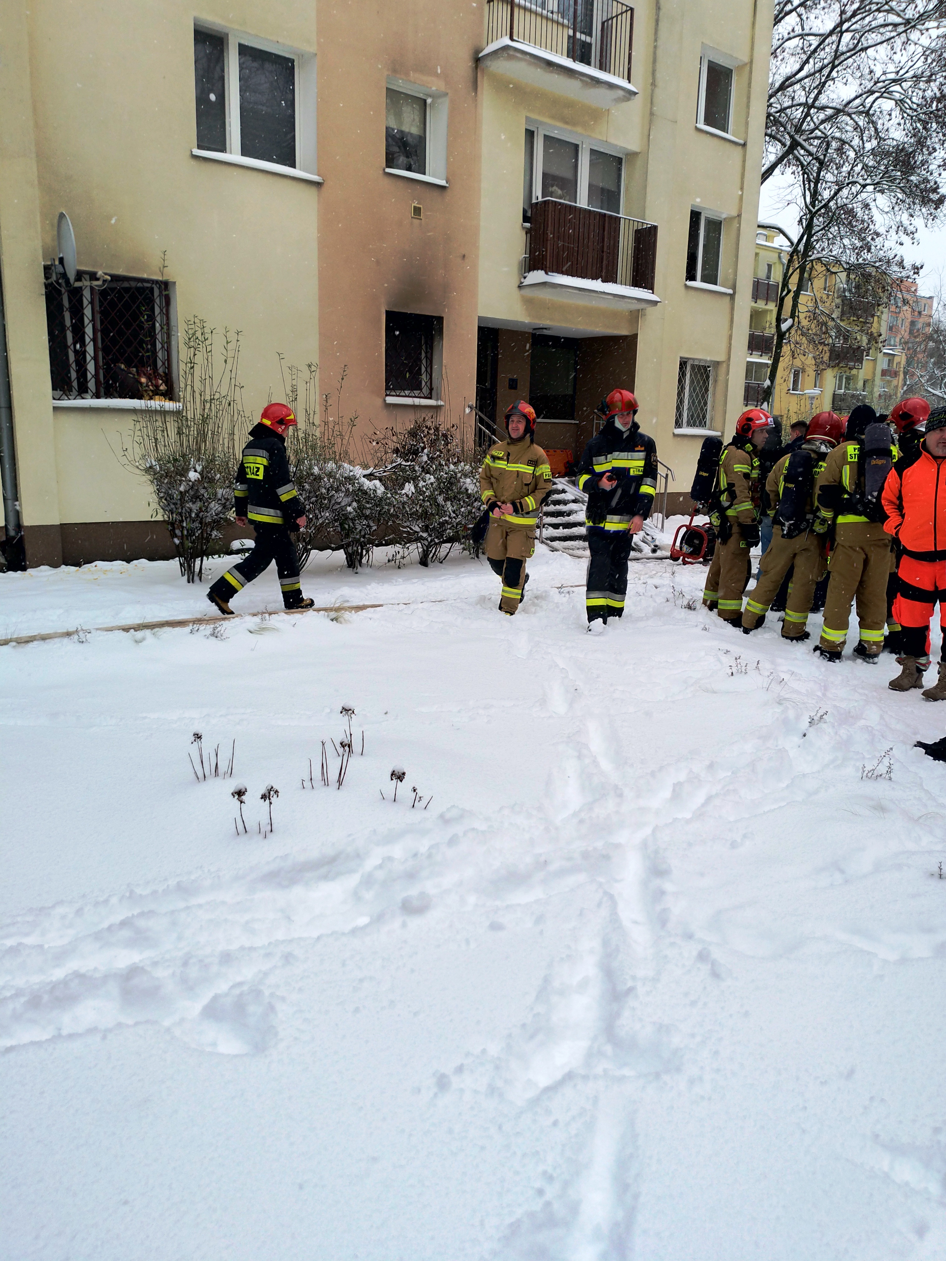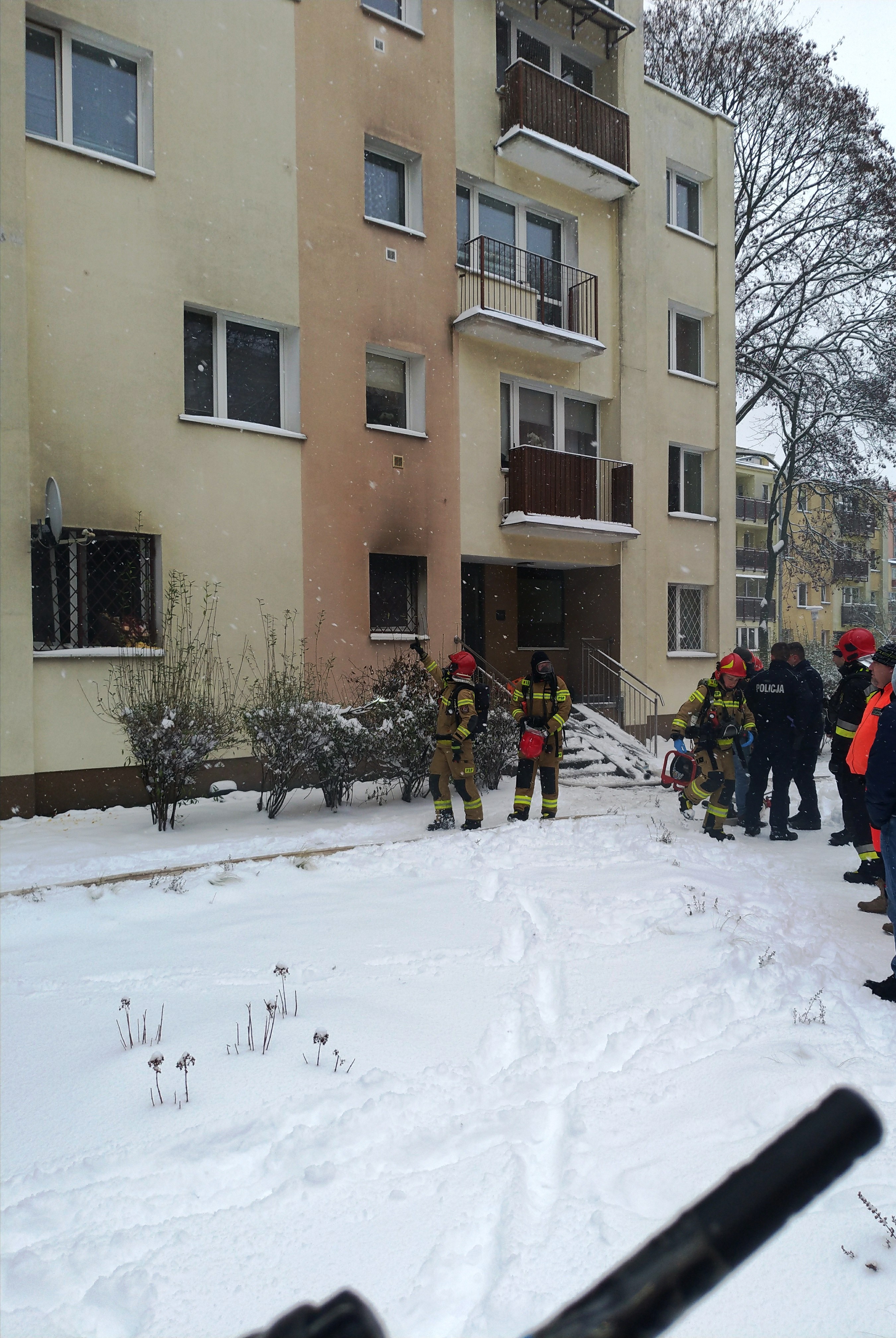 Po przyjeździe na miejsce zdarzenia KDR ustalił, że mieszkańcy tego bloku pomogli wydostać się lokatorce z tego mieszkania poprzez wyważenie łomem drzwi oraz, że pożar ma miejsce na parterze w budynku trzy piętrowym. Zastano płomienie oraz intensywnie wydobywające się zadymienie z okien mieszkania.