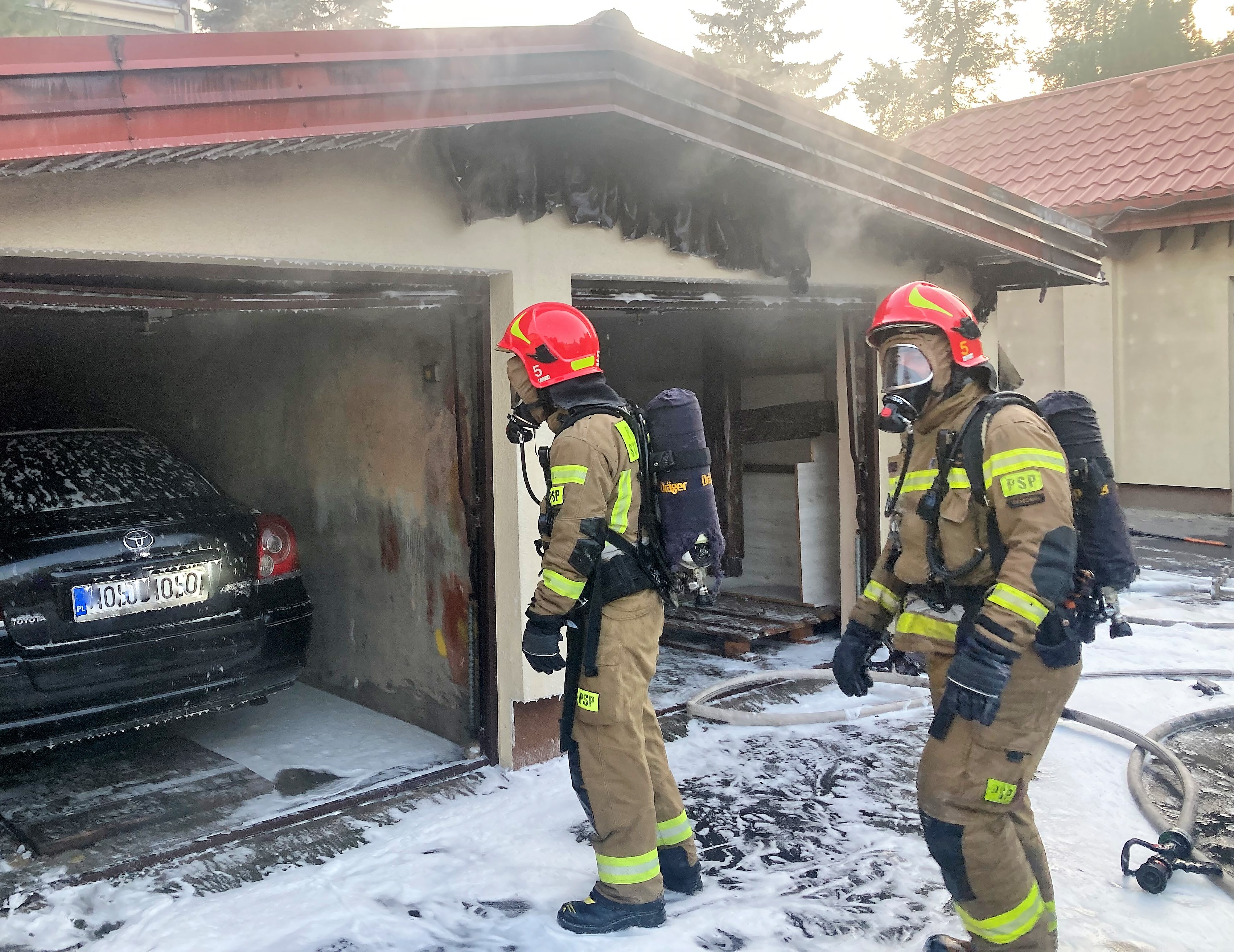 Po przybyciu zastępów z JRG 5 na miejsce zdarzenia zastano rozwinięty pożar murowanego garażu wolnostojącego oraz plastikowych kontenerów na śmieci przyległych do budynku. Zagrożony był również pobliski garaż znajdujący się około 7m od obiektu objętego pożarem. Działania straży polegały na zabezpieczeniu miejsca zdarzenia oraz podaniu dwóch prądów gaśniczych do wnętrza budynku (w początkowej fazie 1 prąd wody w natarciu, 1 prąd wody w obronie sąsiedniego budynku). Drzwi do garażu otworzono za pomocą kluczy otrzymanych od właścicieli. Dodatkowo w trakcie prowadzonych działań z garażu zaczęło wydobywać się paliwo (później ustalono, że wylało się około 5 l z kanistra znajdującego się w garażu). KDR zdecydował o podaniu dodatkowego prądu piany ciężkiej na rozlewisko. W jednej części garażu znajdował się samochód TOYOTA. Samochód był sprawny- strażacy wyprowadzili go z garażu. Po lokalizacji pożaru przystąpiono do systematycznego usuwania nagromadzonych materiałów palnych. KDR zdecydował o całkowitym rozebraniu konstrukcji dachowej z drabiny nasadkowej w celu dogaszenia ukrytych zarzewi ognia. Jednocześnie rota ratowników przy pomocy kamery termowizyjnej dokonała dokładnego przeszukania obiektu w celu wykluczenia przebywania osób trzecich (nie stwierdzono obecności osób w budynku). Oddymiono garaż przy pomocy spalinowego wentylatora osiowego. Miejsce pożaru sprawdzono za pomocą kamery termowizyjnej.Spaleniu uległo wyposażenie garażu murowanego, drewniana konstrukcja dachowa oraz plastikowe kontenery na śmieci wraz ze śmieciami.