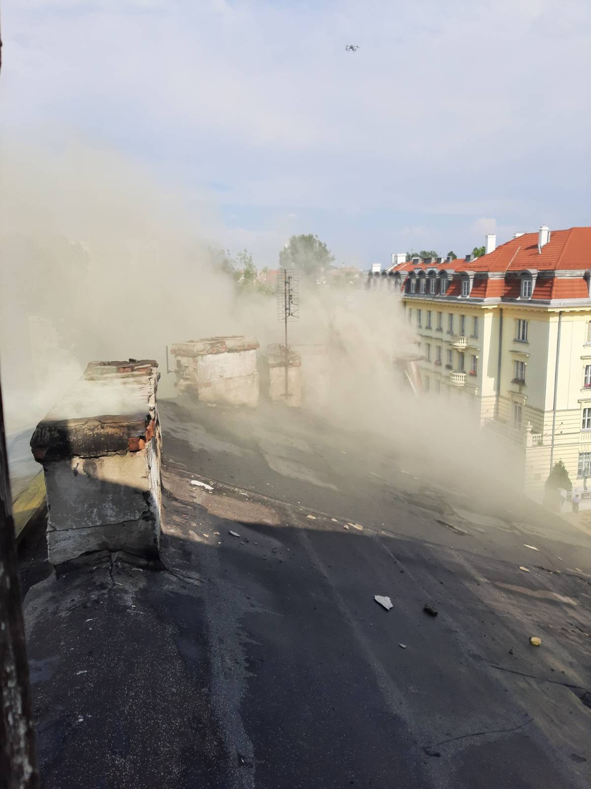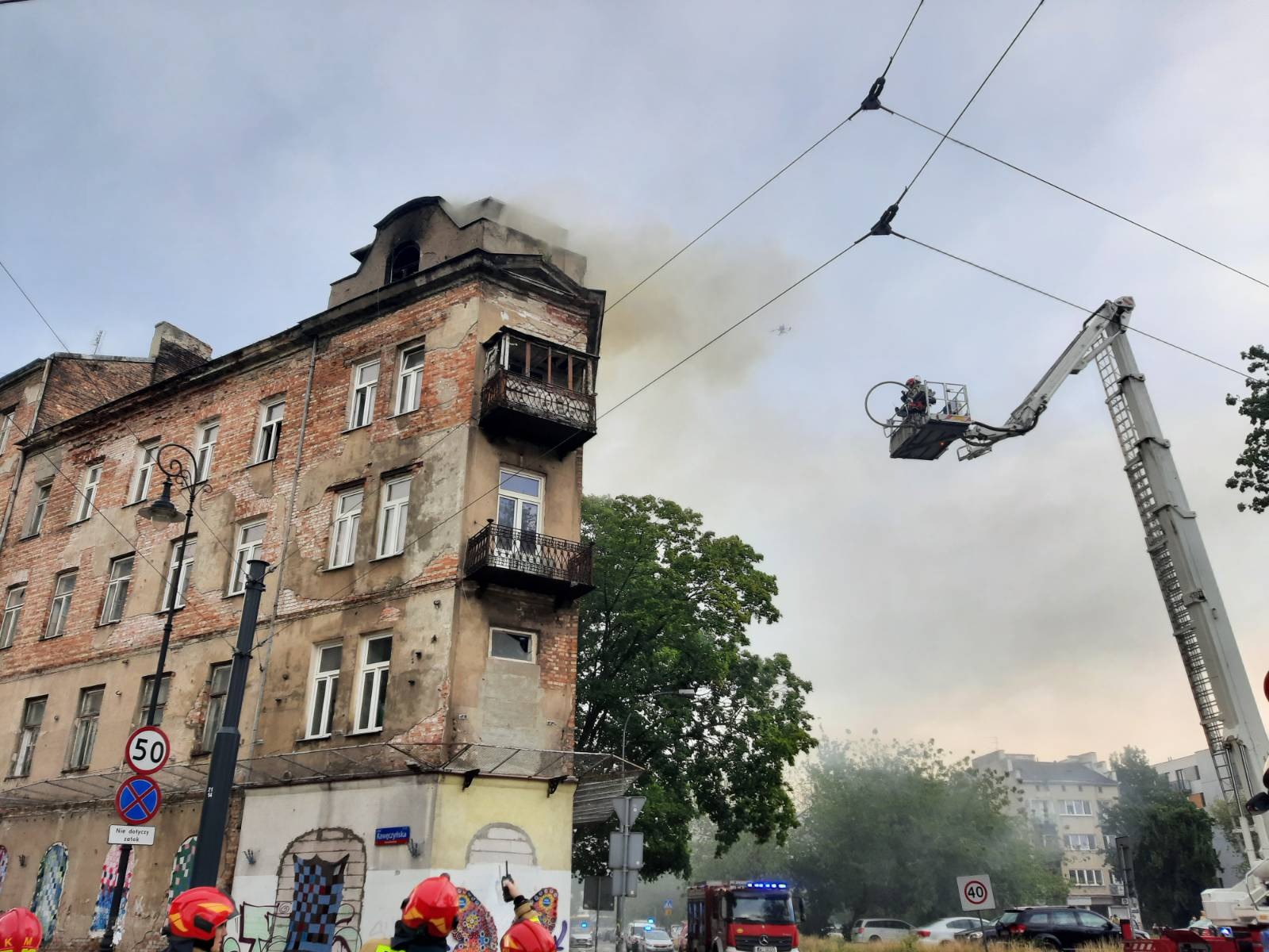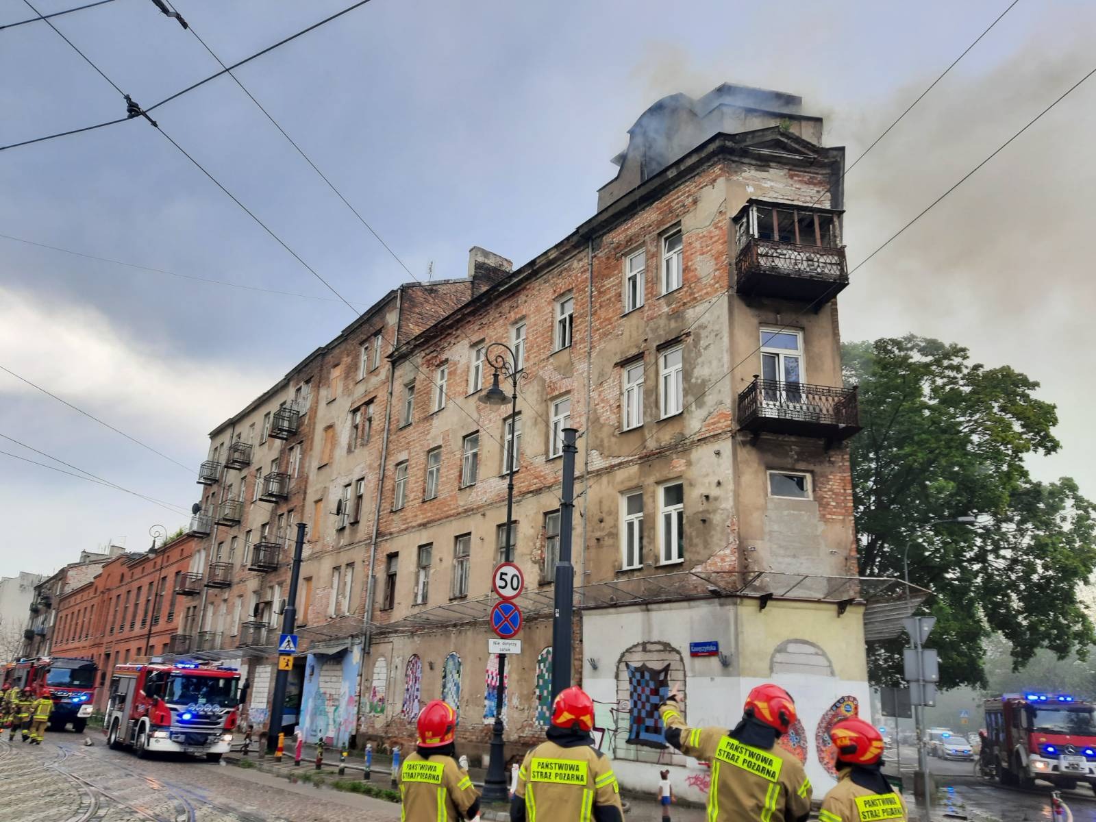 W niedzielę około godziny 14:20 otrzymaliśmy zgłoszenie o pożarze kamienicy przy ul. Kawęczyńskiej 17. Do dojeździe pierwszych zastępów z JRG-5 potwierdzono, że w oknie na poddaszu wydobywają się płomienie oraz z połaci dachowych wydobywa się gęsty czarny dym.