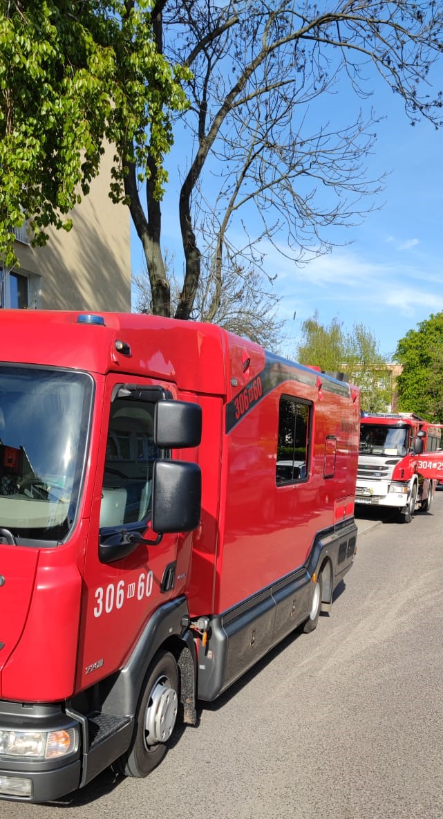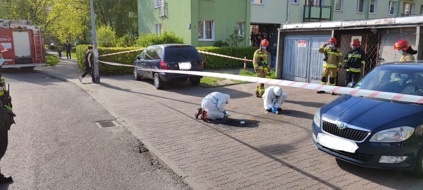 Po przybyciu na miejsce zdarzenia stwierdzono, że na parkingu przyległym do budynku przy ul. Grenady 4A znajduje się rozbity pojemnik oraz rozlana substancja na powierzchni ok. 5m2. Wstępne działania zastępu PSP polegały na zabezpieczeniu miejsca zdarzenia poprzez ogrodzenie taśmą ostrzegawczą. KDR na miejsce akcji zadysponował zastępy: GCBA 5/32/2,5 oraz SRRChem z JRG 6. Ponadto na miejsce zdarzenia przybył