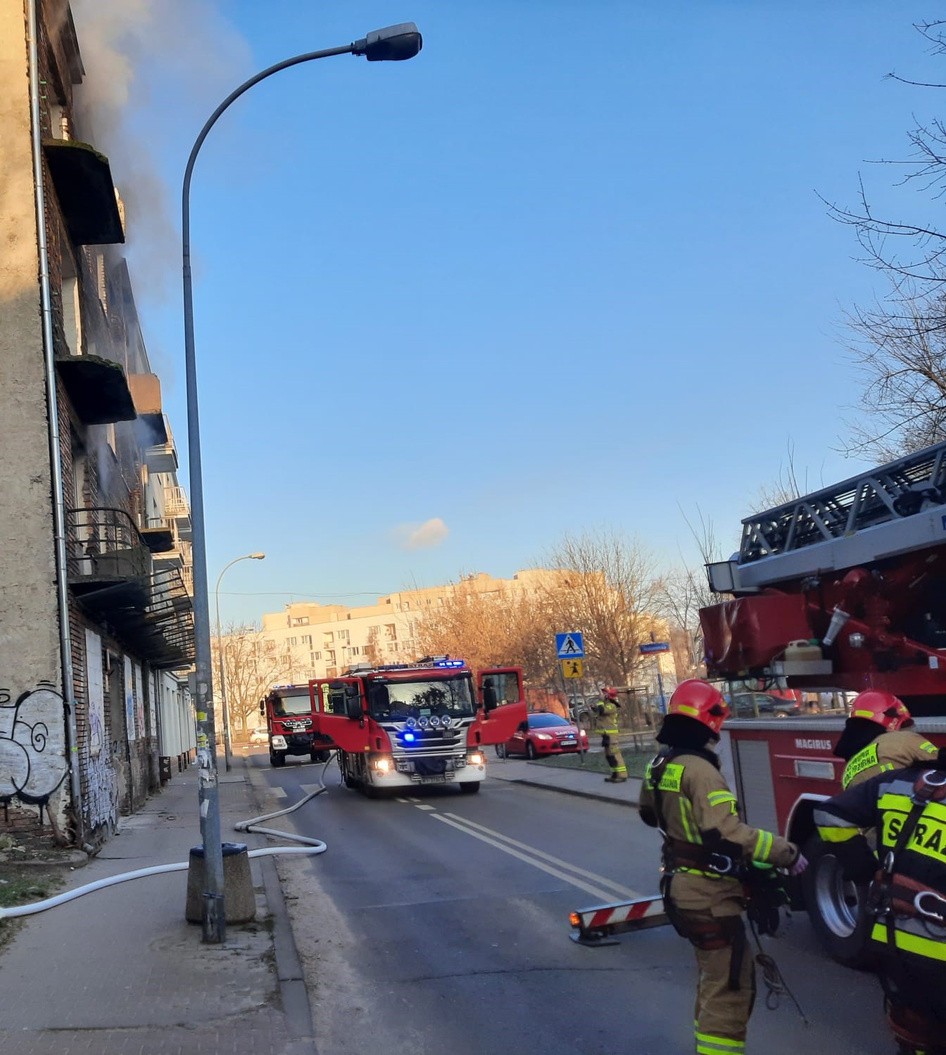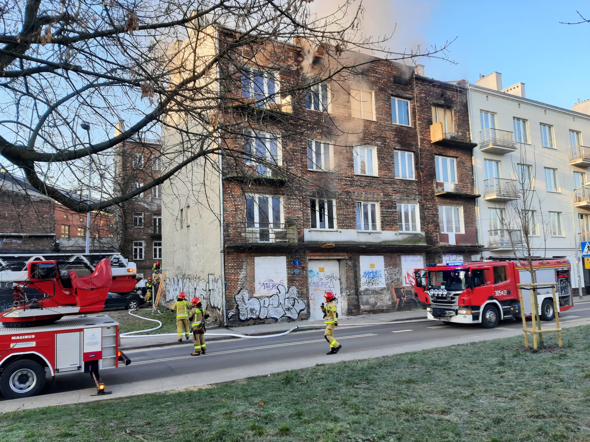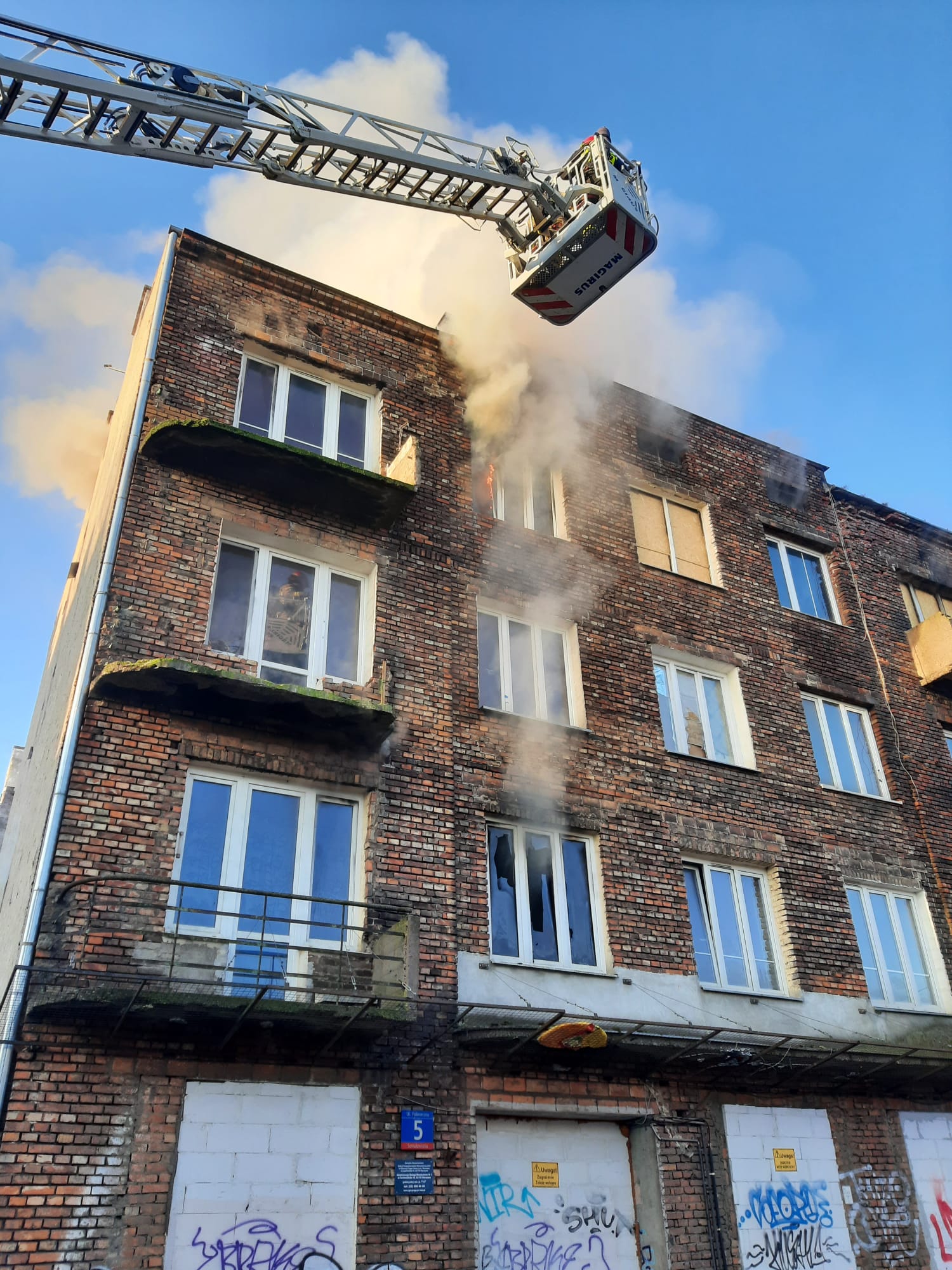 We wtorkowy poranek strażacy z JRG 5 otrzymali kolejne zgłoszenie o pożarze przy ul. Folwarcznej 5. Po przyjeździe na miejsce zdarzenia czterech zastępów PSP przystąpiono do rozpoznania, w wyniku którego stwierdzono pożar pomieszczenia na pierwszym i trzecim piętrze w budynku pustostanu. Działania polegały na zabezpieczeniu miejsca zdarzenia oraz podaniu dwóch prądów gaśniczych wody w natarciu. Jeden prąd podano z kosza drabiny SD-31, drugą linię gaśniczą rozwinięto po klatce schodowej do pomieszczenia objętego pożarem. W tym samym czasie rozpoczęto przeszukanie budynku pod kątem wystąpienia osób poszkodowanych. Po ugaszeniu pożaru, pustostan oddymiono oraz sprawdzono za pomocą kamery termowizyjnej w celu wykrycia potencjalnych zarzewi ognia. Podczas prowadzenia działań wyznaczona została rota ratownicza z własnych sił będących na miejscu akcji. Rozebrano dodatkowo ok 8 m2 drewnianego sufitu w celu pełnego sprawdzenia powierzchni pomiędzy piętrem trzecim, a poddaszem.
