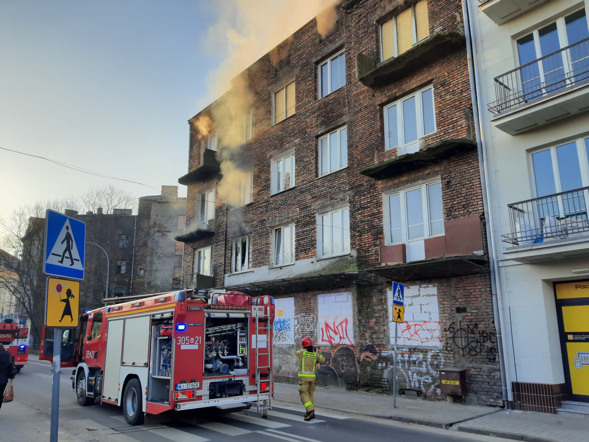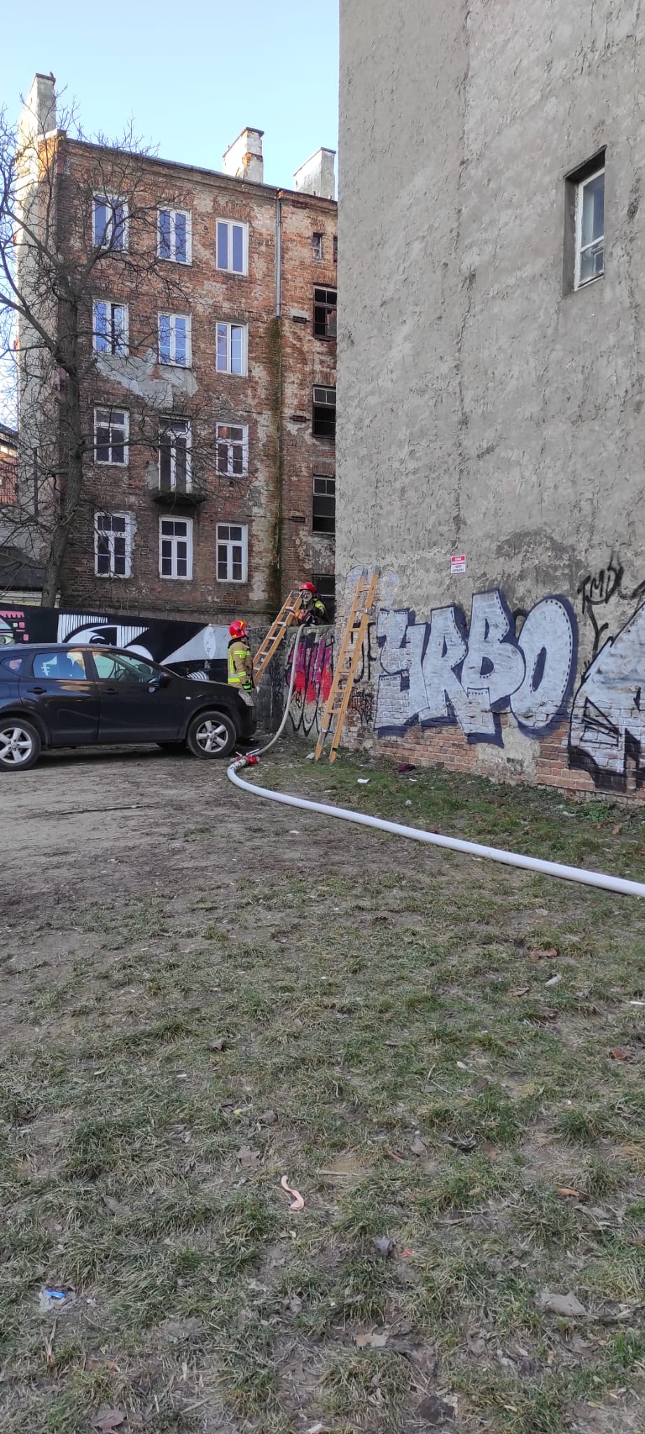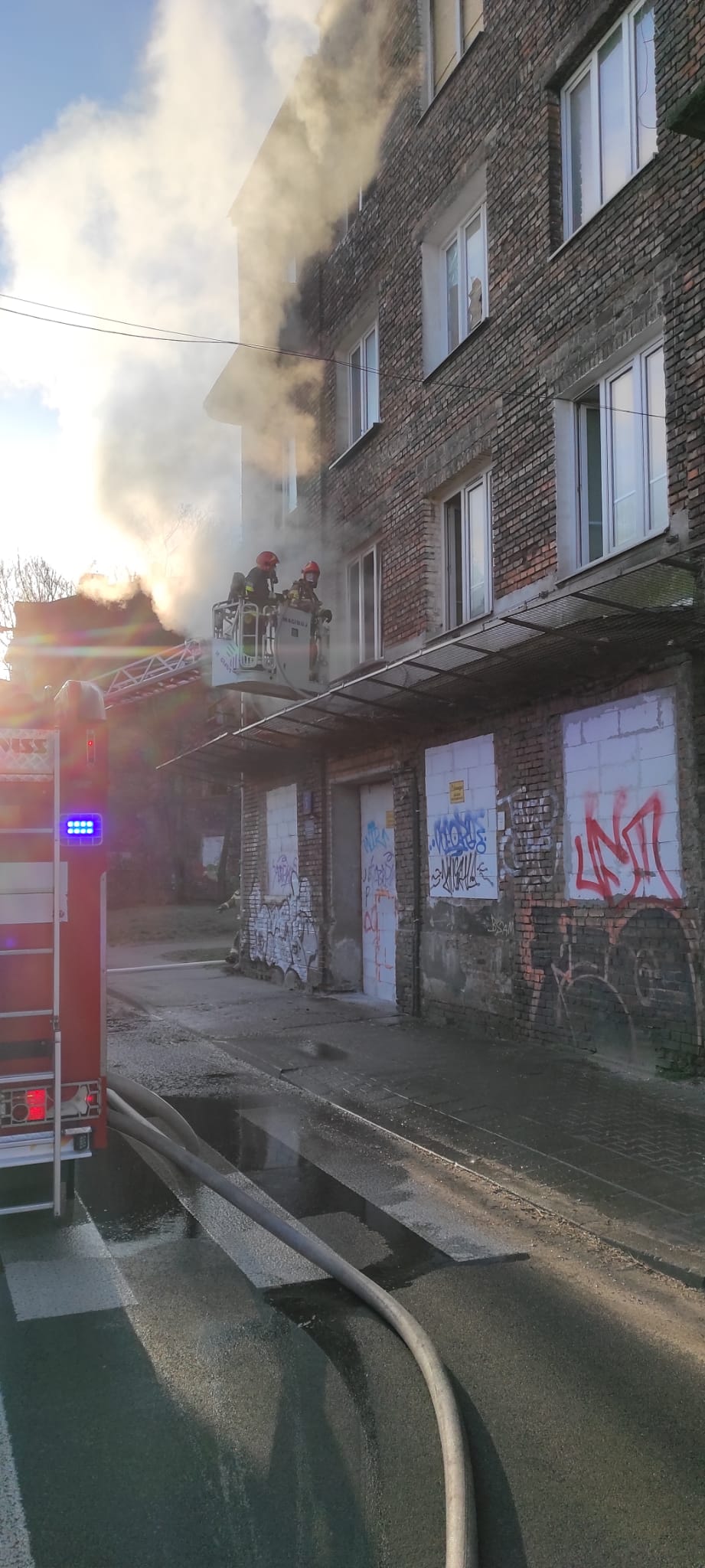 We wtorkowy poranek strażacy z JRG 5 otrzymali kolejne zgłoszenie o pożarze przy ul. Folwarcznej 5. Po przyjeździe na miejsce zdarzenia czterech zastępów PSP przystąpiono do rozpoznania, w wyniku którego stwierdzono pożar pomieszczenia na pierwszym i trzecim piętrze w budynku pustostanu. Działania polegały na zabezpieczeniu miejsca zdarzenia oraz podaniu dwóch prądów gaśniczych wody w natarciu. Jeden prąd podano z kosza drabiny SD-31, drugą linię gaśniczą rozwinięto po klatce schodowej do pomieszczenia objętego pożarem. W tym samym czasie rozpoczęto przeszukanie budynku pod kątem wystąpienia osób poszkodowanych. Po ugaszeniu pożaru, pustostan oddymiono oraz sprawdzono za pomocą kamery termowizyjnej w celu wykrycia potencjalnych zarzewi ognia. Podczas prowadzenia działań wyznaczona została rota ratownicza z własnych sił będących na miejscu akcji. Rozebrano dodatkowo ok 8 m2 drewnianego sufitu w celu pełnego sprawdzenia powierzchni pomiędzy piętrem trzecim, a poddaszem.
