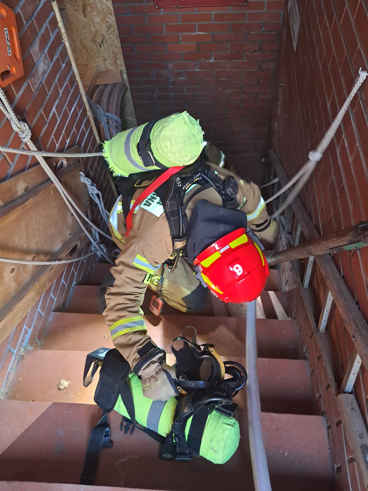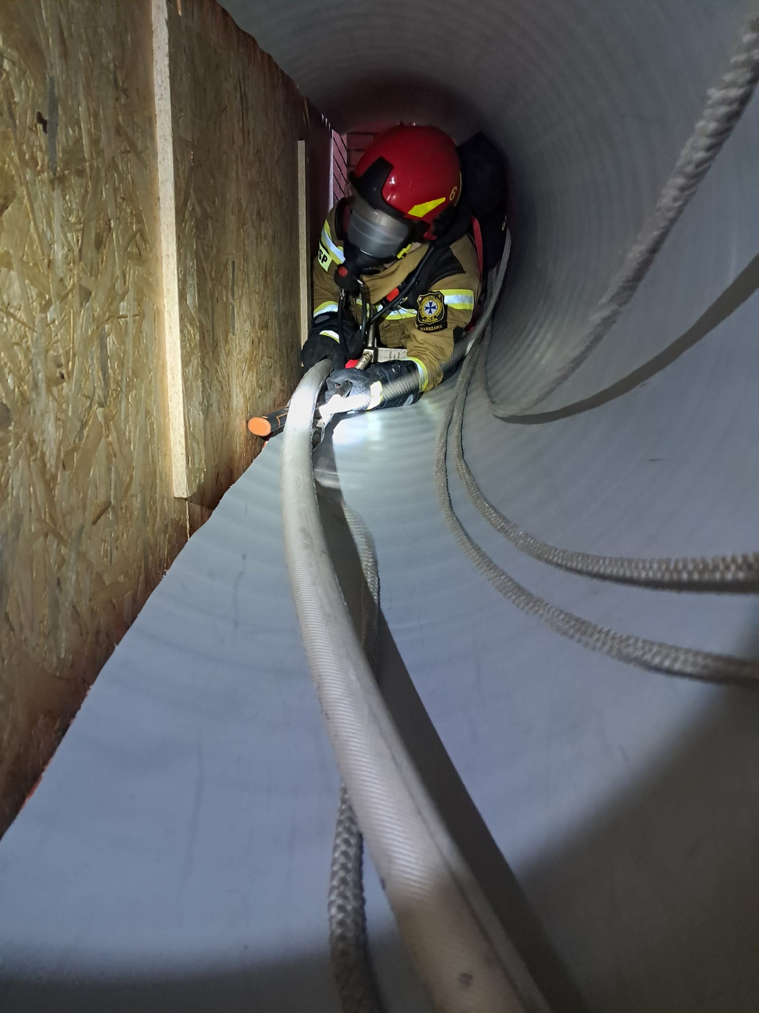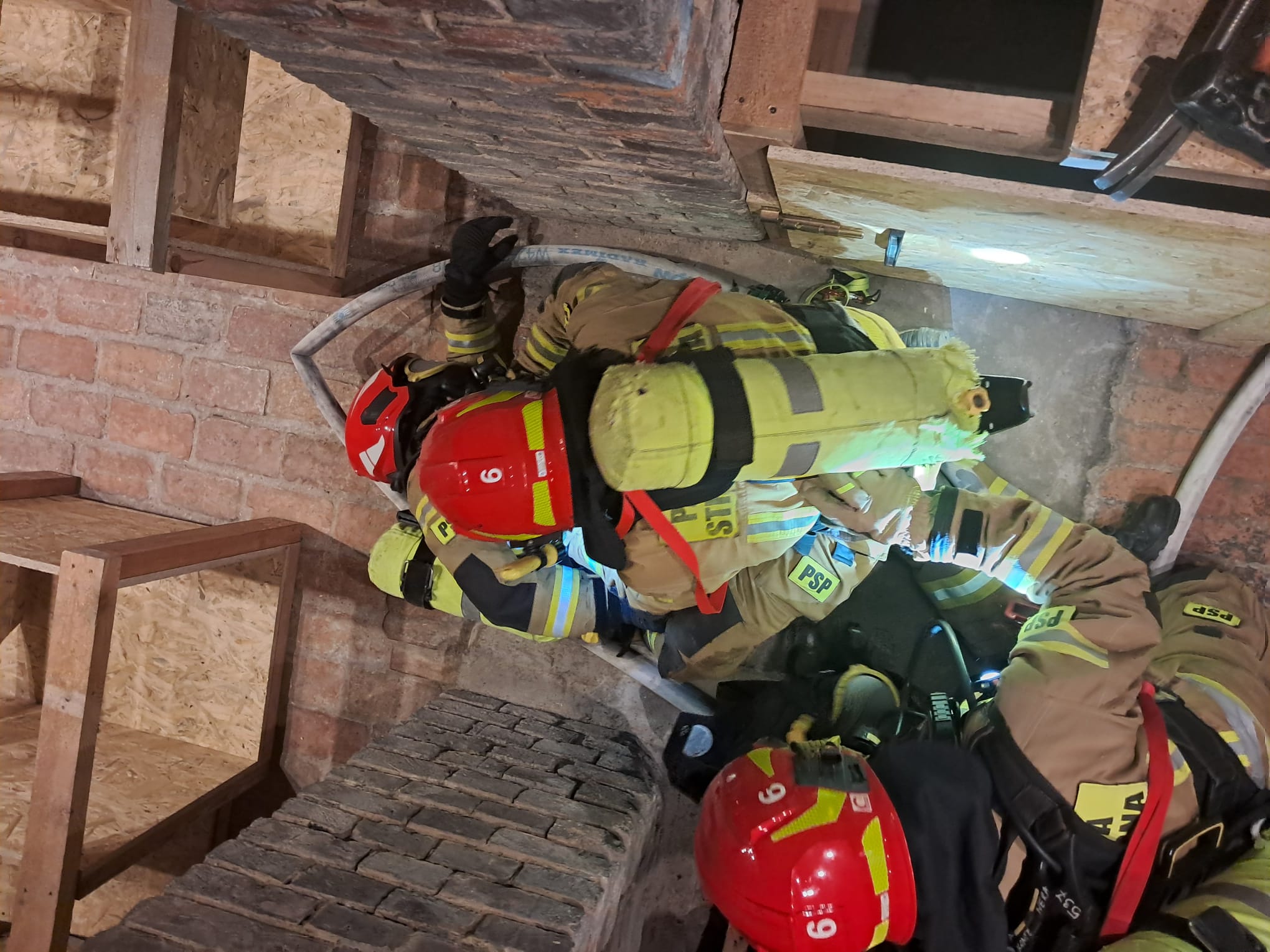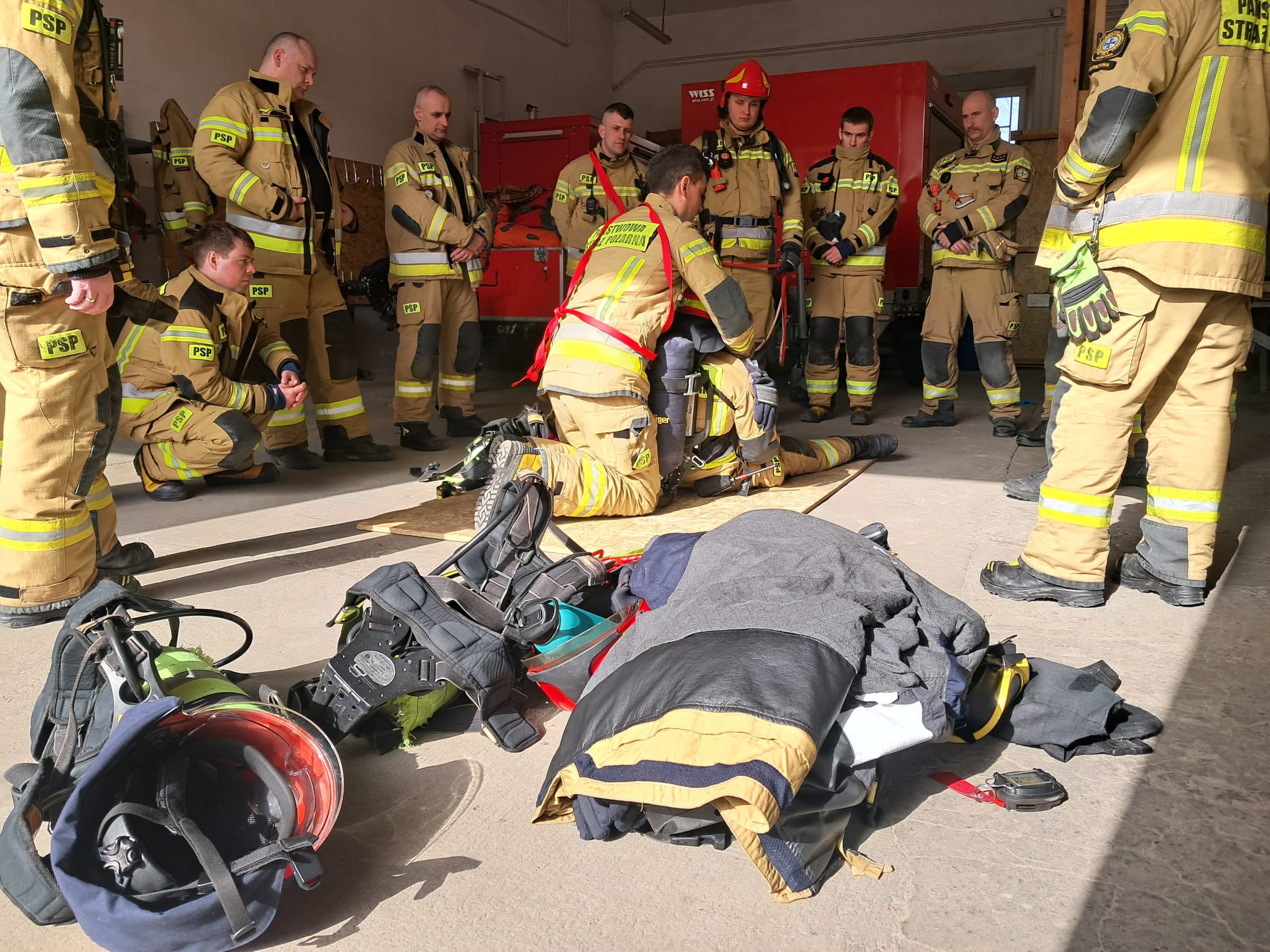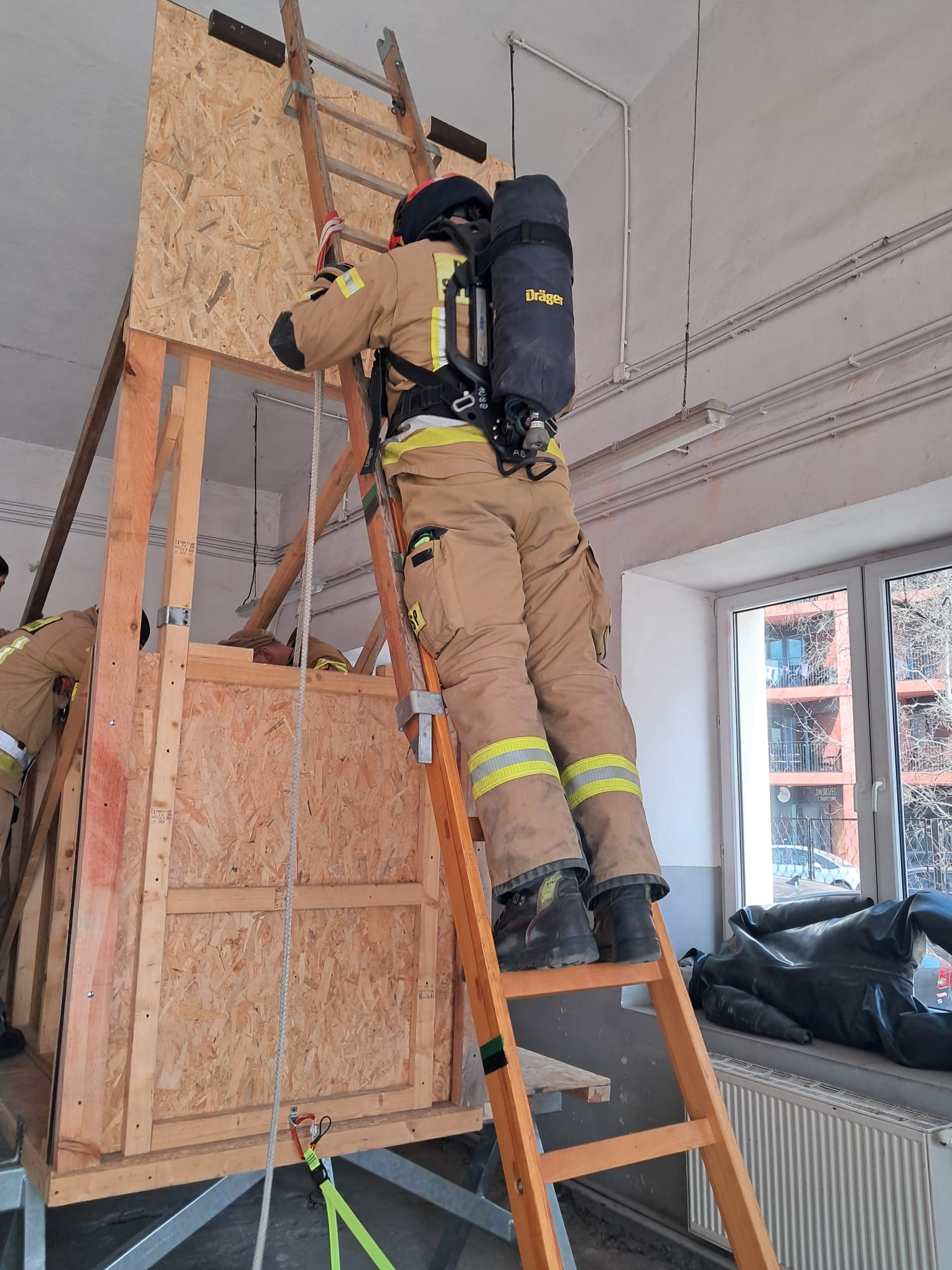 z piwnic, co wymagało opanowania technik poruszania się w ciasnych i ograniczonych przestrzeniach. - Ewakuacja pionowa: Doskonalono techniki ratownicze z wykorzystaniem drabin, umożliwiające bezpieczne wydobycie poszkodowanego przez okno.