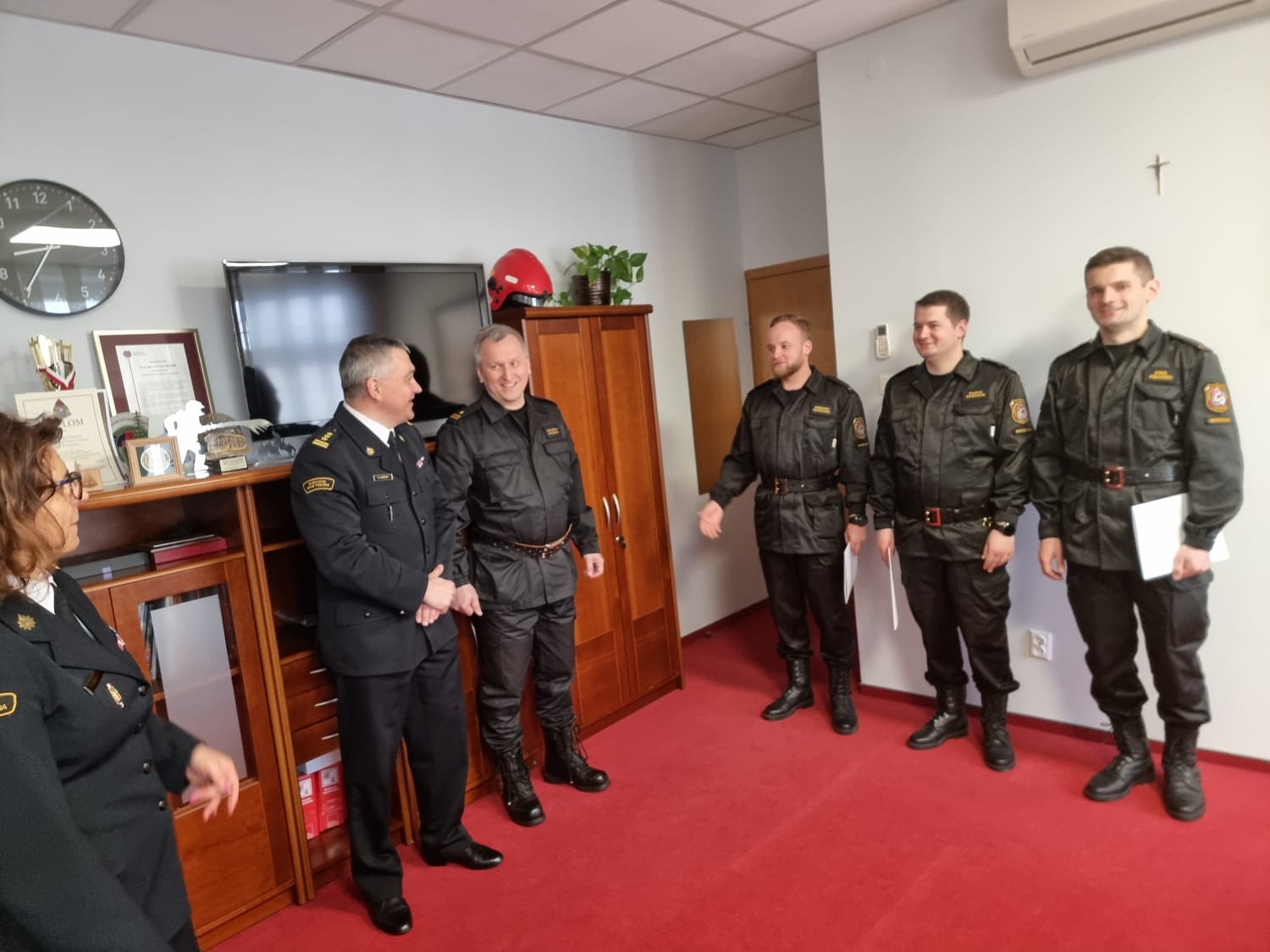 W dniu 25 kwietnia 2022 r. w gabinecie Komendanta Miejskiego PSP m.st. Warszawy w obecności bryg. Romana Krzywca - Komendanta MIejskiego PSP m.st. Warszawy, st. bryg. Artura Rudzika - Zastępcy Komendanta MIejskiego PSP m.st. Warszawy, mł. bryg. Anny Zielińskiej - Naczzelnika Wydziału Kadrowego oraz mł. bryg. Waldemara Wysowskiego - Naczelnika Wydziału Kontrolno-Rozpoznawczego odbyło się uroczyste wręczenie dokumentów skrócenia okresu służby przygotowawczej trzem funkcjonariuszom Wydziału Kontrolno-Rozpoznawczego.