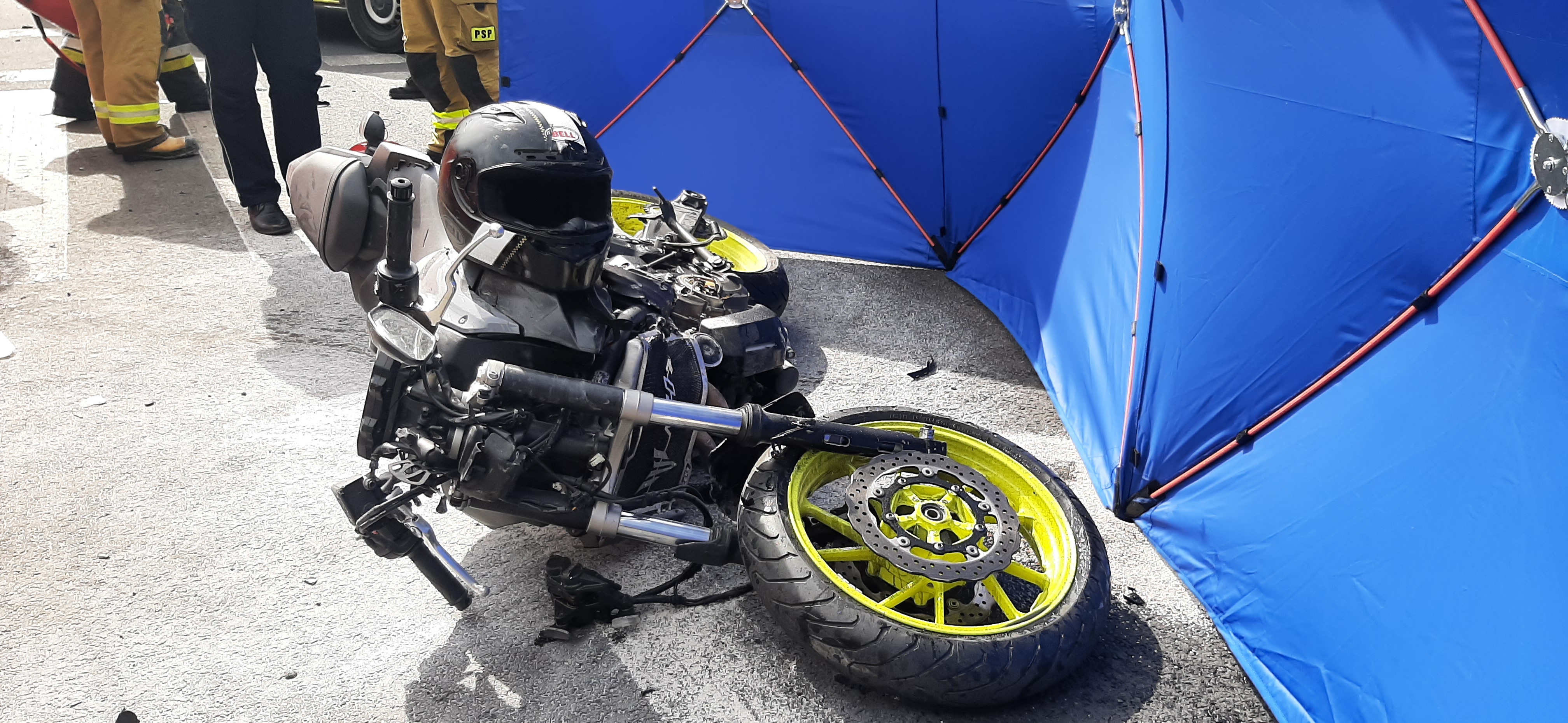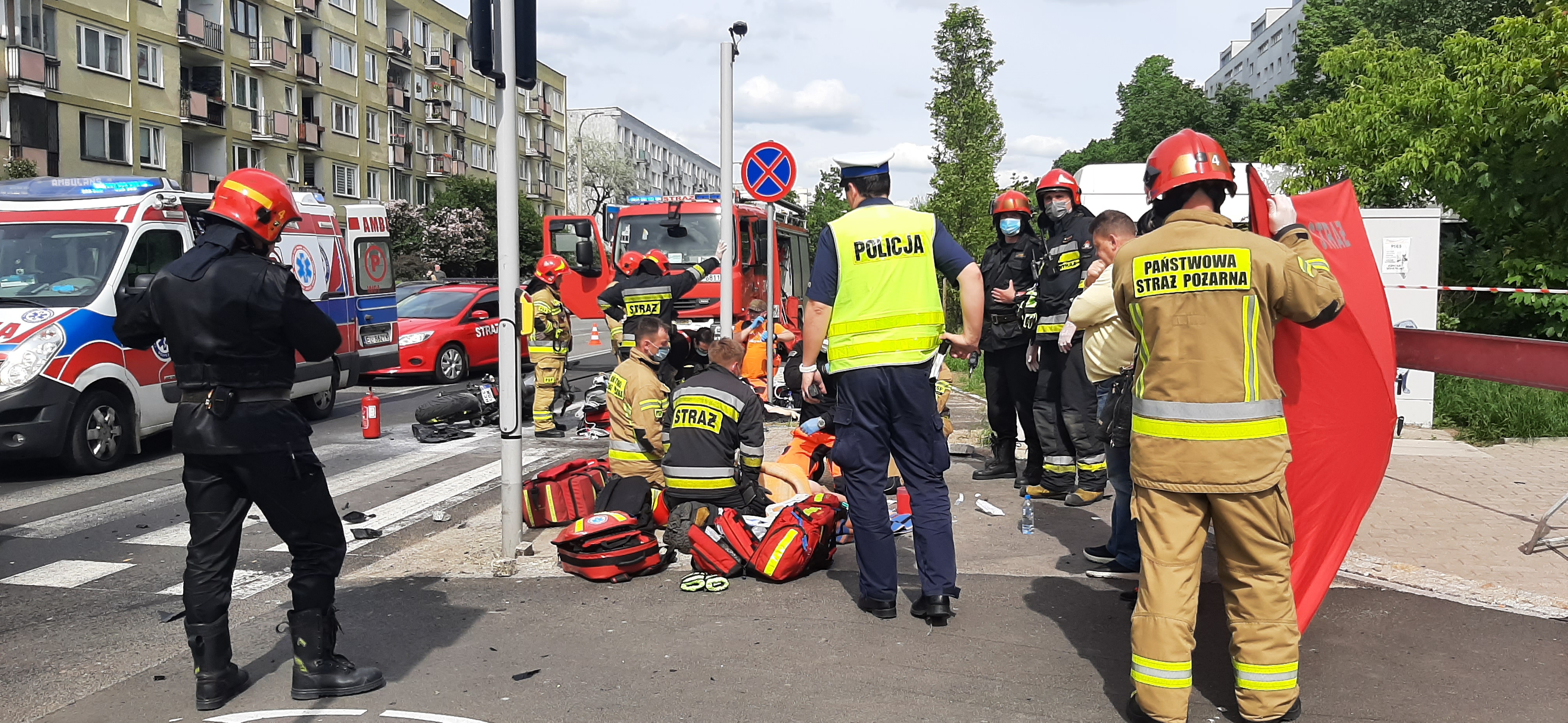 Po dojeździe na miejsce zdarzenia zastępów PSP, KDR stwierdził , że doszło do zderzenia motocykla z samochodem osobowym. Po zderzeniu motocykl uderzył w przechodzące przez pasy dziecko. W zdarzeniu brały udział łącznie 3 osoby. Kierowca samochodu osobowego, motocykla oraz pieszy. Po rozpoznaniu stwierdzono, że poszkodowane są 2 osoby. Motocyklista był nieprzytomny, bez czynności życiowych, oparty na słupie sygnalizatora świetlnego. Poszkodowany pieszy był przytomny, ułożony na chodniku w pozycji bezpiecznej przez przechodniów. Doznał złamania lewej nogi (pomocy medycznej udzielał ZRM obecny na miejscu). Kierowca samochodu osobowego opuścił pojazd o własnych siłach – nie zgłaszał żadnych dolegliwości.